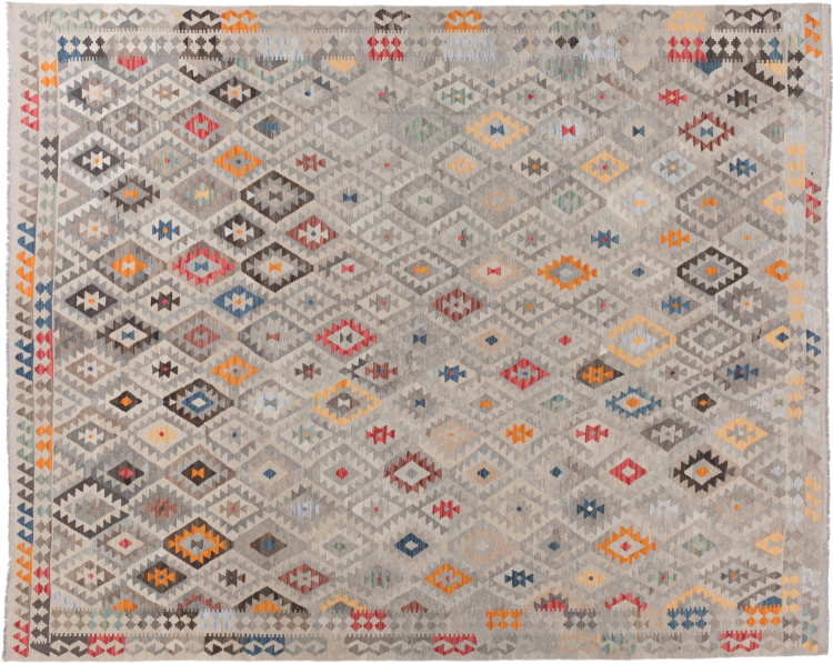 This rug was made as a flat weave by hand on a loom. Flatweave is the term used to describe rugs that have no pile. As the name promises, these rugs are woven and not knotted. This results in a flat rug with a structured surface. Flatweaves are not as soft and usually thinner than knotted rugs. At the same time they are much less complex to manufacture and can usually be laid out from both sides (front and back). Their patterns are usually geometric, which is determined by the fabric.