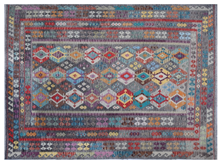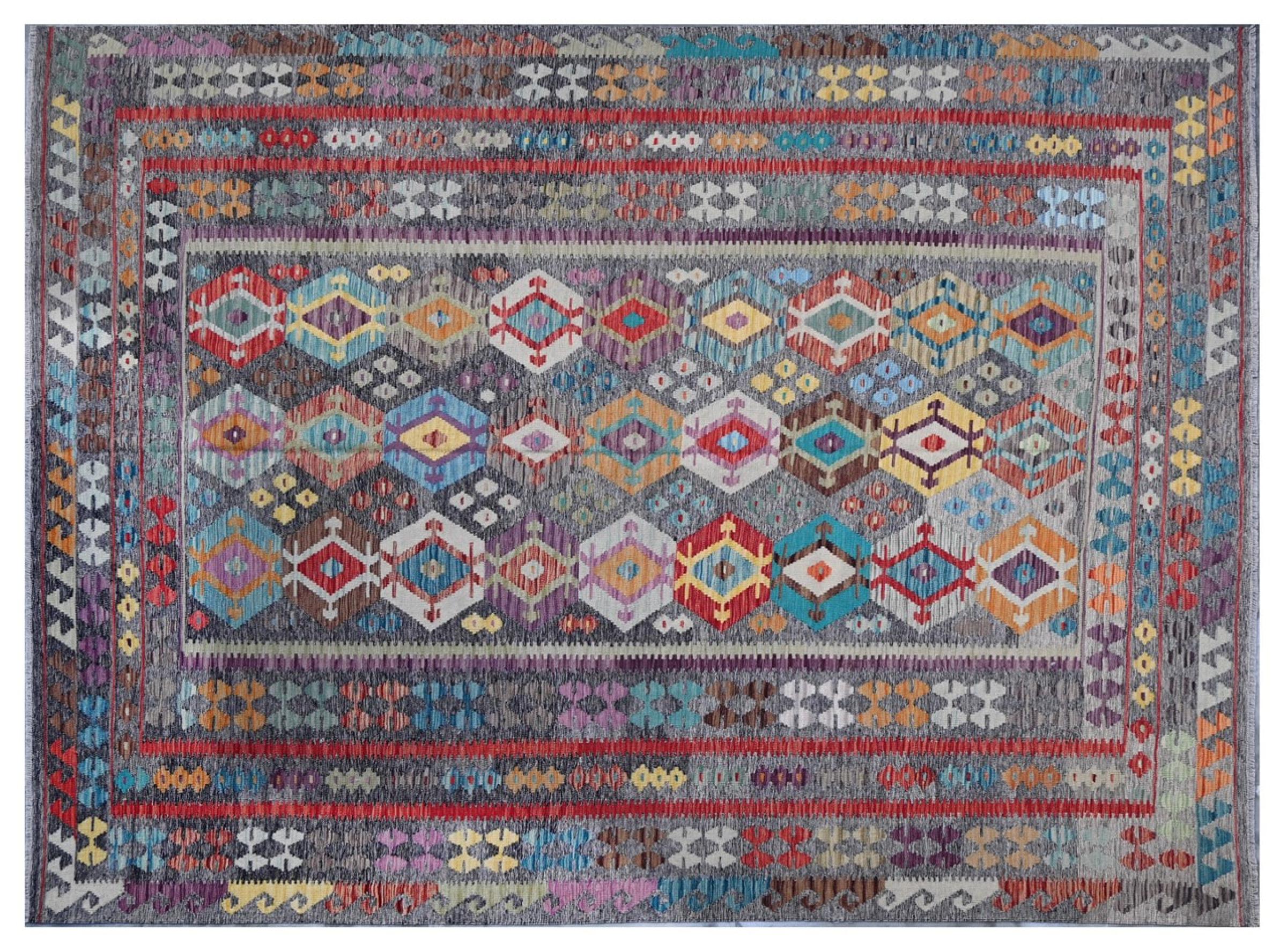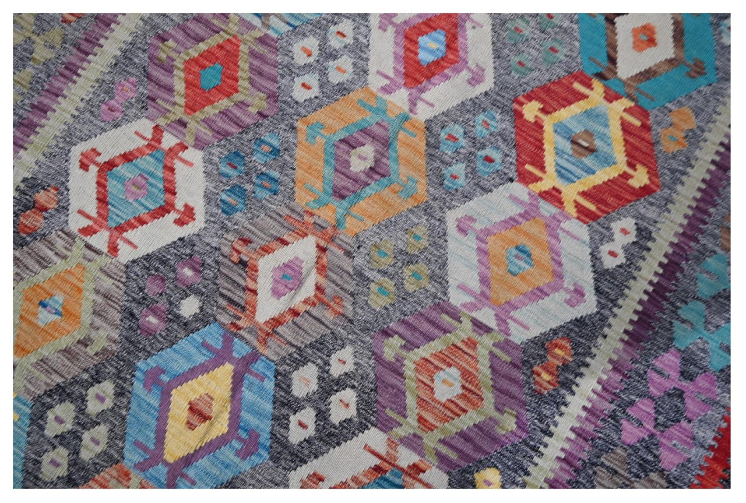 This handwoven Kilim Afghan is a wonderful and unique piece of art. Hard to believe that these modern colours and patterns have already been used centuries ago. This carpet has been woven by hand in old tradition in Afghanistan. It delivers a portion of contemporary history, which you won't find in this specific design a second time. It consists of high-grade natural wool and gives your home a personalised touch.