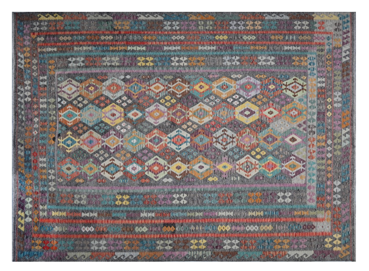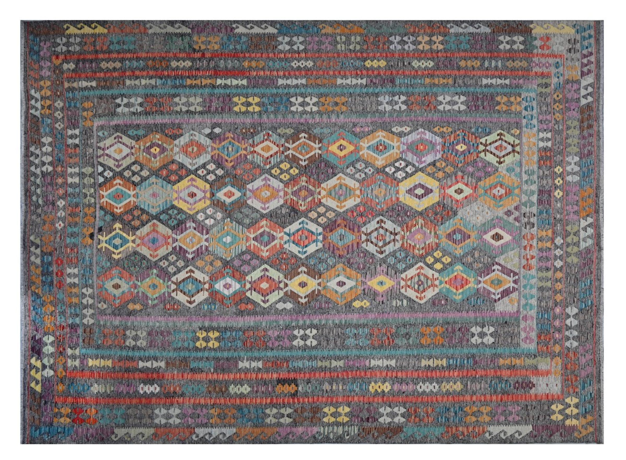 This handwoven Kilim Afghan is a wonderful and unique piece of art. Hard to believe that these modern colours and patterns have already been used centuries ago. This carpet has been woven by hand in old tradition in Afghanistan. It delivers a portion of contemporary history, which you won't find in this specific design a second time. It consists of high-grade natural wool and gives your home a personalised touch.