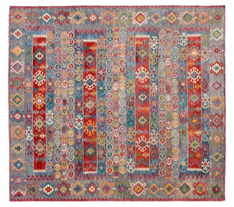 These kilim rugs show a decisive difference to hand-knotted rugs - they are woven by hand. Thus, they do not have a high pile of wool and are often flatter and rougher than knotted wool rugs. Their making is less elaborate and so they are usually much more affordable. As an advantage, kilim rugs are also much lighter and can be laid out from the front and back side. Hand-woven kilims originally come from the former Persia and are now also often made in Afghanistan. They have rather simple, straightforward patterns, which are determined by their weaving technique.