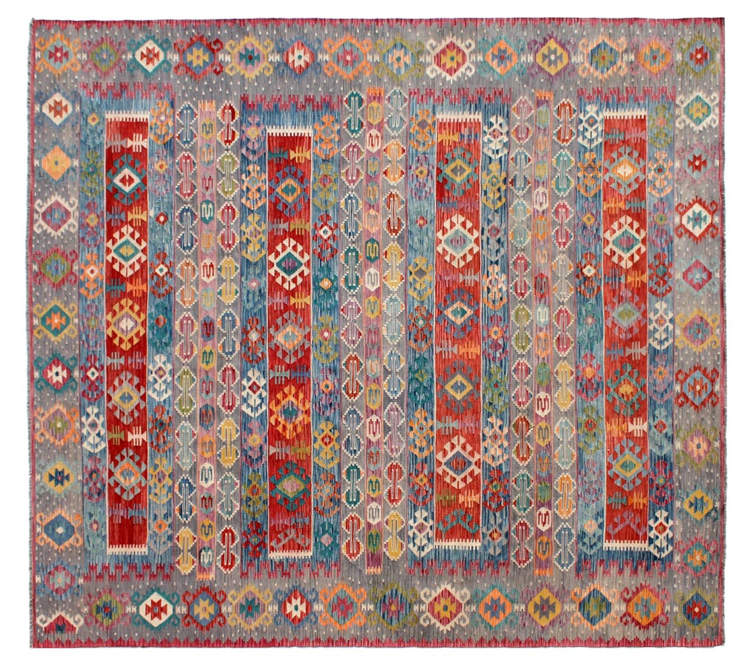 This handwoven Kilim Afghan is a wonderful and unique piece of art. Hard to believe that these modern colours and patterns have already been used centuries ago. This carpet has been woven by hand in old tradition in Afghanistan. It delivers a portion of contemporary history, which you won't find in this specific design a second time. It consists of high-grade natural wool and gives your home a personalised touch.