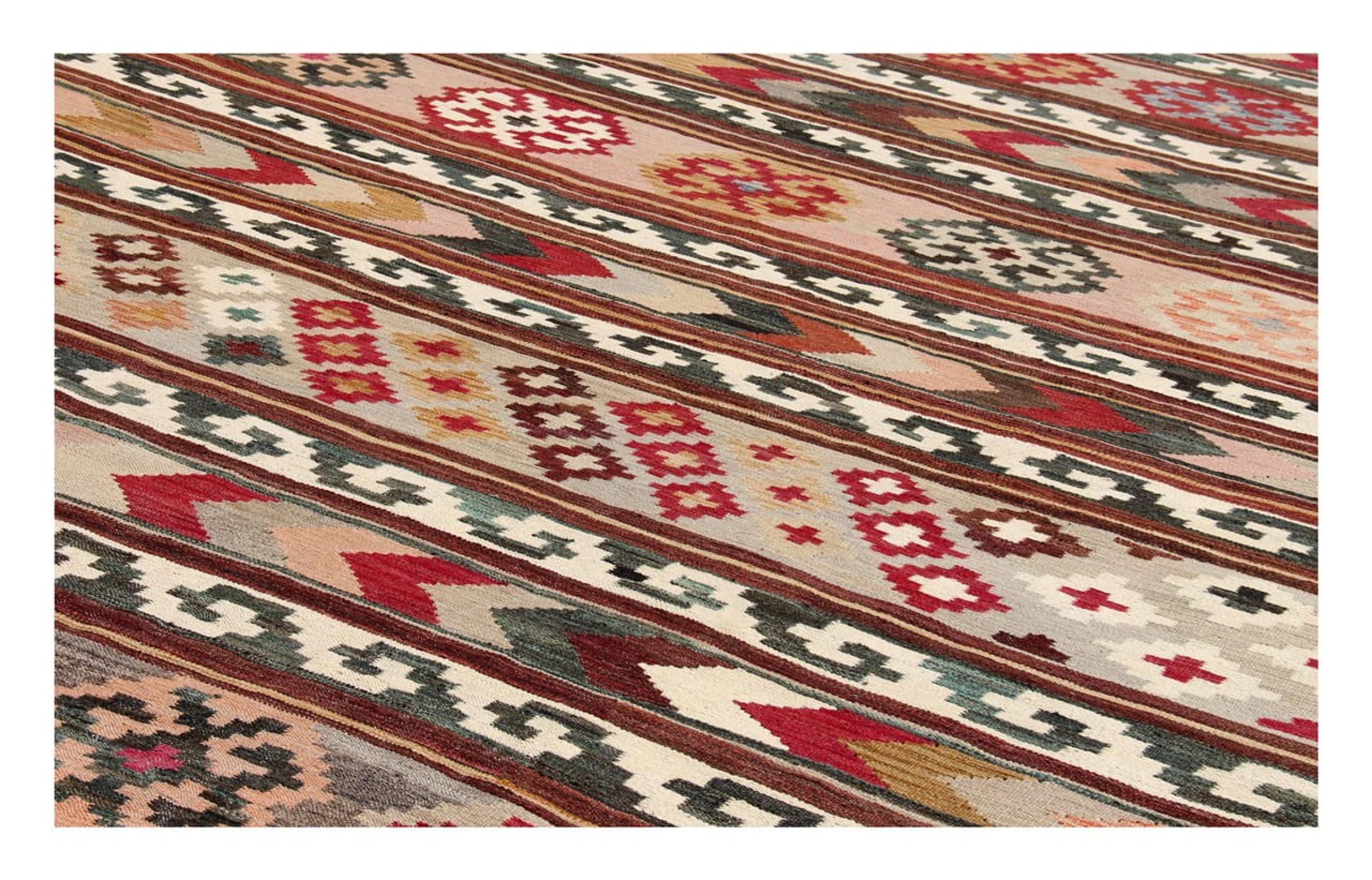 This rug was made as a flat weave by hand on a loom. Flatweave is the term used to describe rugs that have no pile. As the name promises, these rugs are woven and not knotted. This results in a flat rug with a structured surface. Flatweaves are not as soft and usually thinner than knotted rugs. At the same time they are much less complex to manufacture and can usually be laid out from both sides (front and back). Their patterns are usually geometric, which is determined by the fabric.