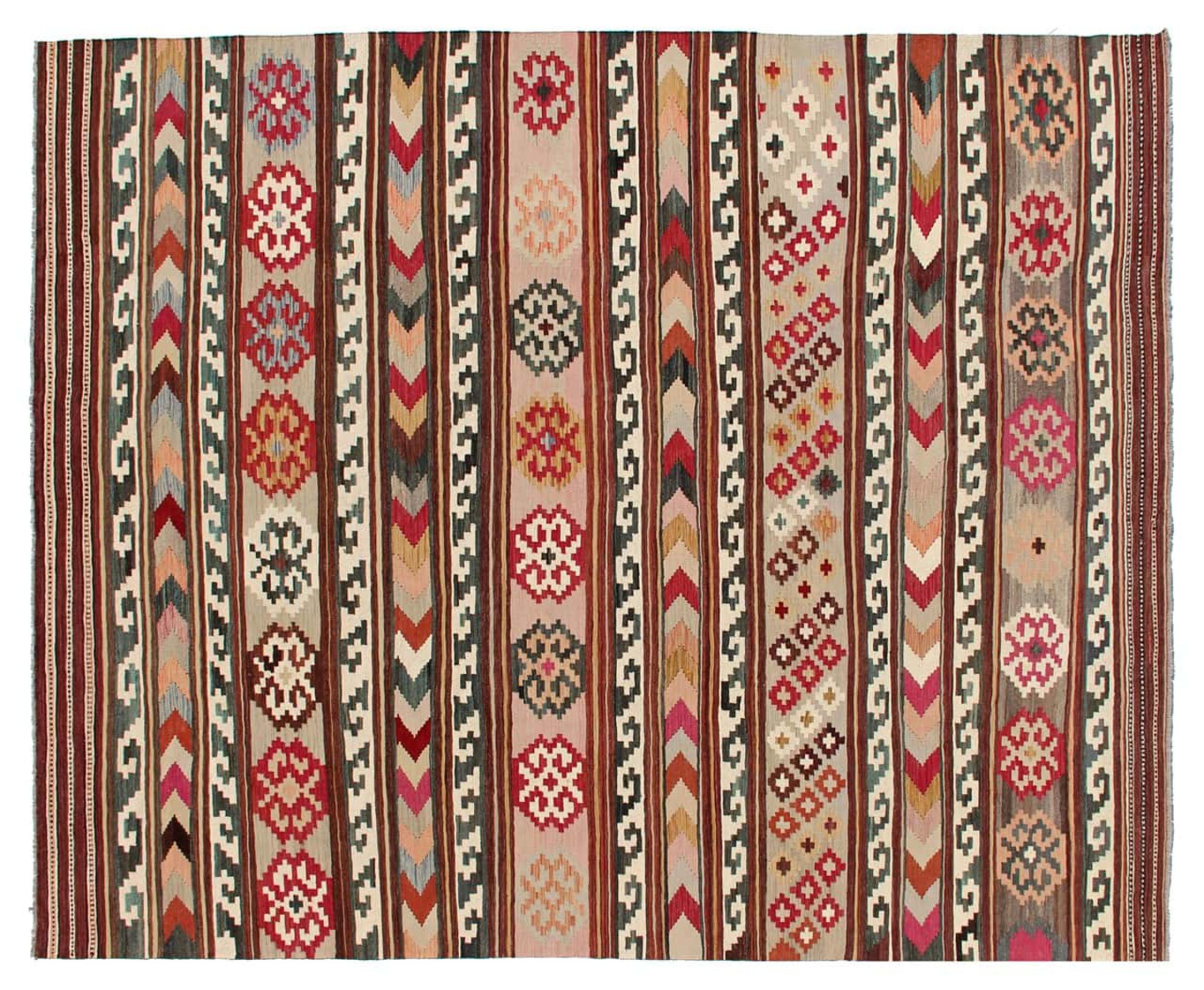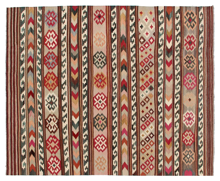 These kilim rugs show a decisive difference to hand-knotted rugs - they are woven by hand. Thus, they do not have a high pile of wool and are often flatter and rougher than knotted wool rugs. Their making is less elaborate and so they are usually much more affordable. As an advantage, kilim rugs are also much lighter and can be laid out from the front and back side. Hand-woven kilims originally come from the former Persia and are now also often made in Afghanistan. They have rather simple, straightforward patterns, which are determined by their weaving technique.