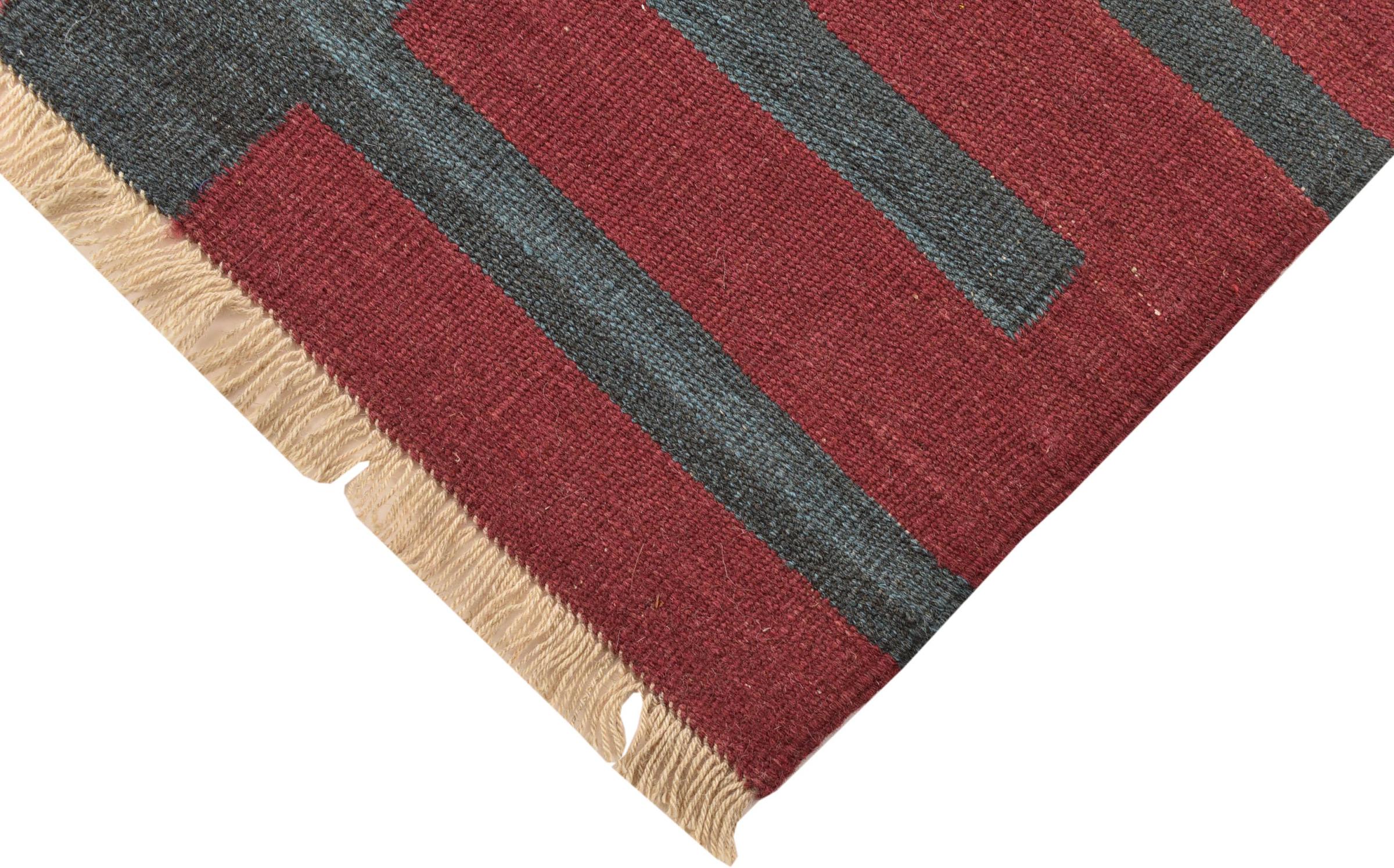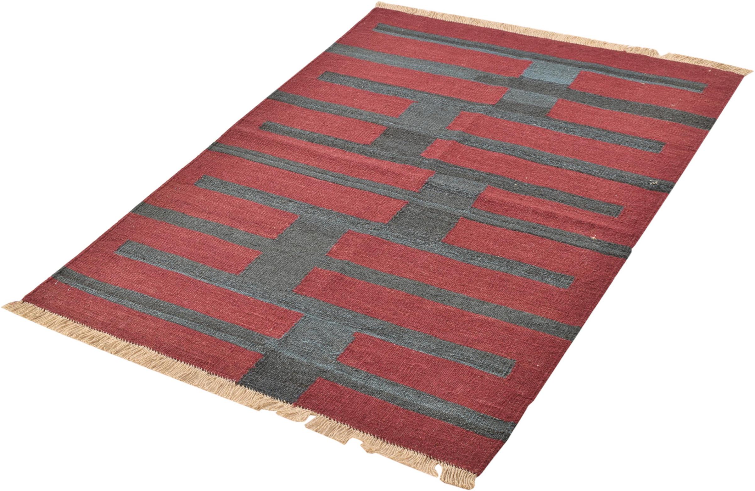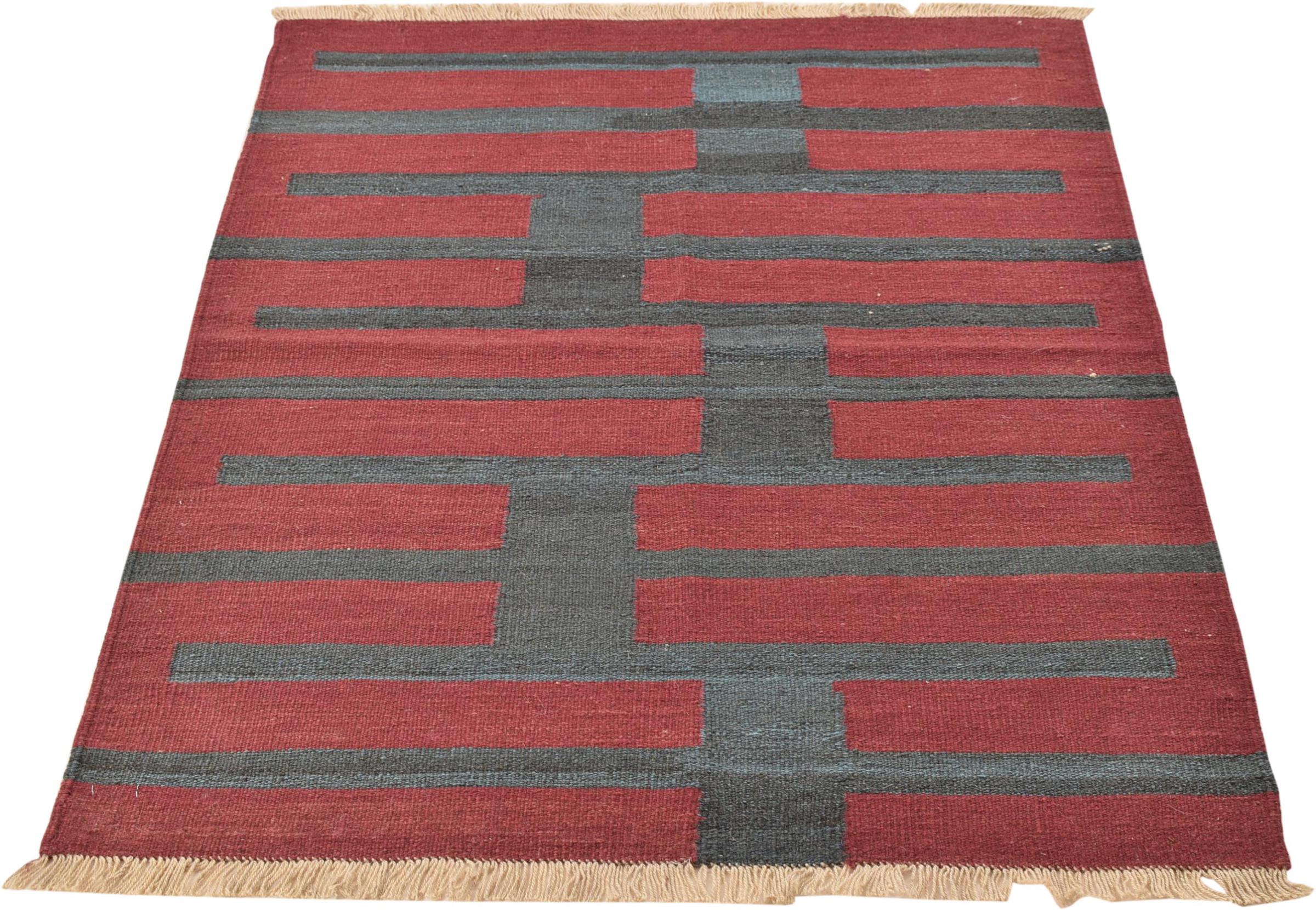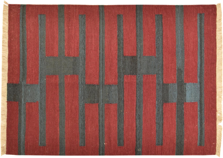 This rug was made as a flat weave by hand on a loom. Flatweave is the term used to describe rugs that have no pile. As the name promises, these rugs are woven and not knotted. This results in a flat rug with a structured surface. Flatweaves are not as soft and usually thinner than knotted rugs. At the same time they are much less complex to manufacture and can usually be laid out from both sides (front and back). Their patterns are usually geometric, which is determined by the fabric.