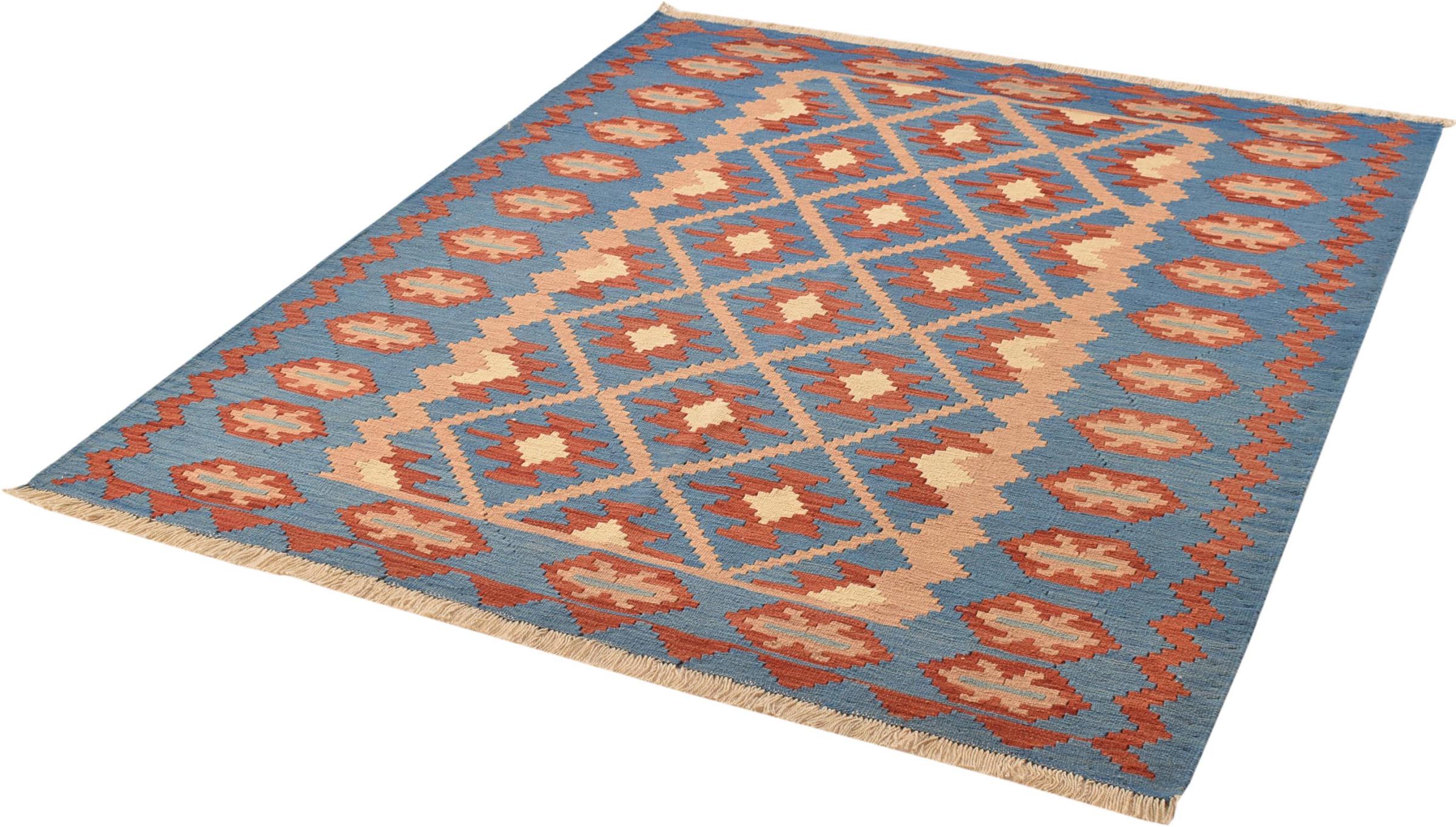 This handwoven Kilim Fars combines Persian patterns with the old tradition of flat fabrics. It represents a beautiful composition of contemporary Persian elements and a modern style. Due to the carpet's geometric patterns and its warm colours, this type of rug is extremely popular in modern interior magazines. Additionally, this Kilim can be used in many different ways. Whether you would like to use it as a bed cover or as a carpet in front of your sofa – a Kilim Fars fulfils nearly all wishes.