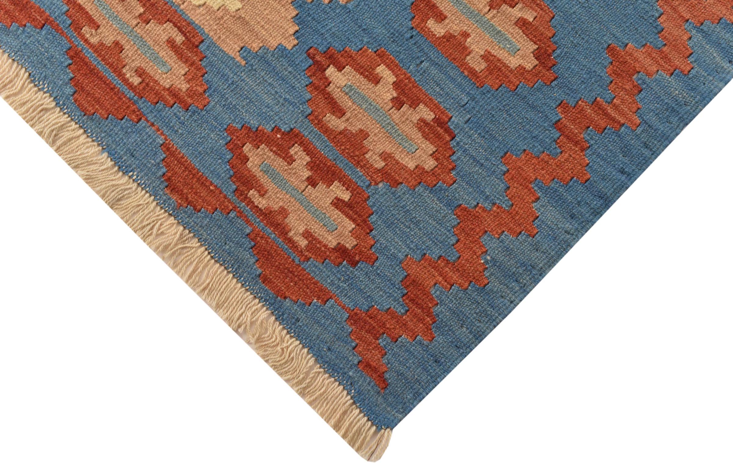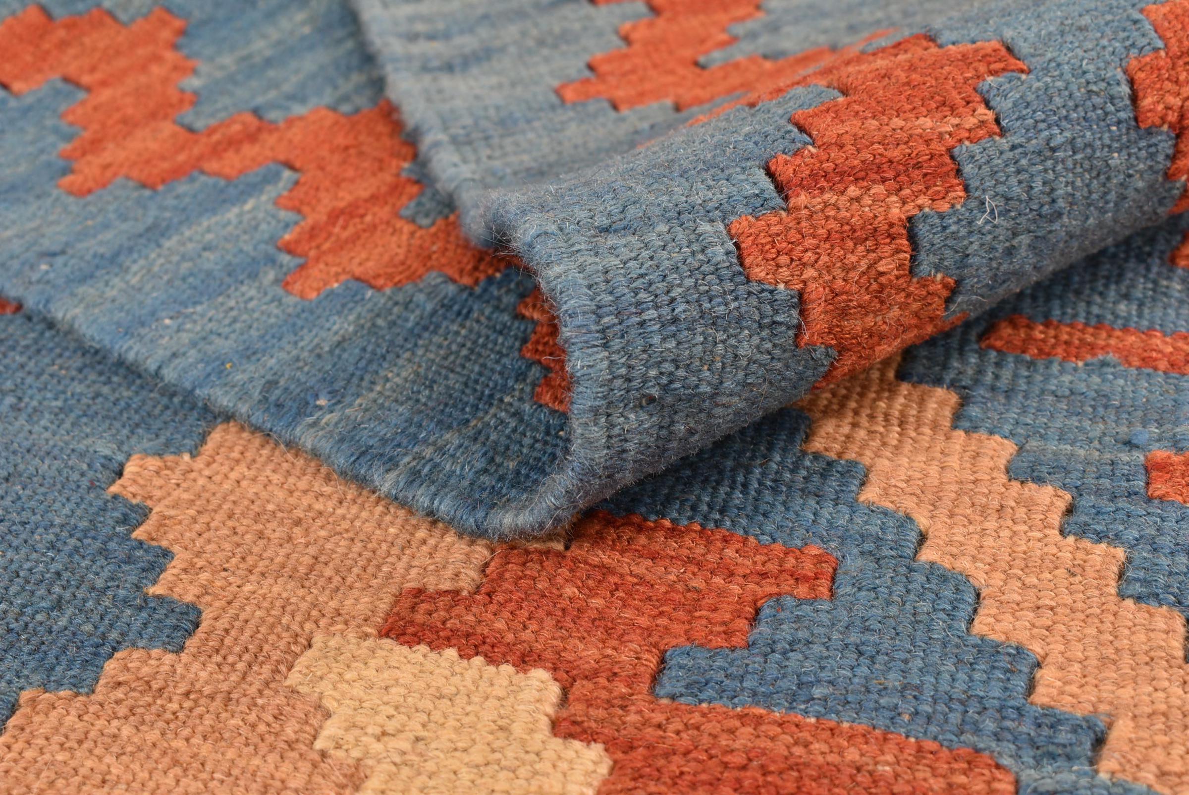 This rug was made as a flat weave by hand on a loom. Flatweave is the term used to describe rugs that have no pile. As the name promises, these rugs are woven and not knotted. This results in a flat rug with a structured surface. Flatweaves are not as soft and usually thinner than knotted rugs. At the same time they are much less complex to manufacture and can usually be laid out from both sides (front and back). Their patterns are usually geometric, which is determined by the fabric.