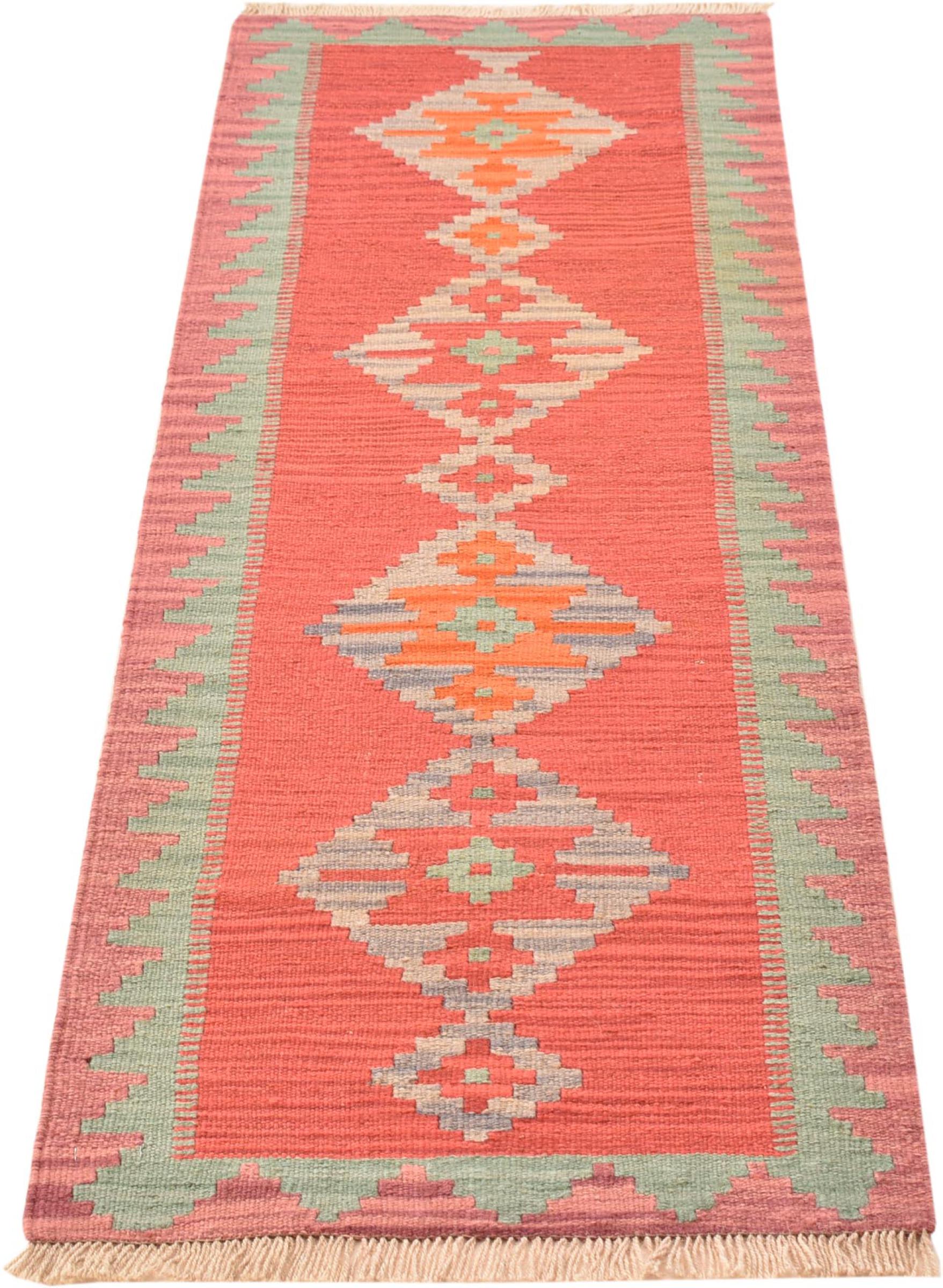 This rug was made as a flat weave by hand on a loom. Flatweave is the term used to describe rugs that have no pile. As the name promises, these rugs are woven and not knotted. This results in a flat rug with a structured surface. Flatweaves are not as soft and usually thinner than knotted rugs. At the same time they are much less complex to manufacture and can usually be laid out from both sides (front and back). Their patterns are usually geometric, which is determined by the fabric.