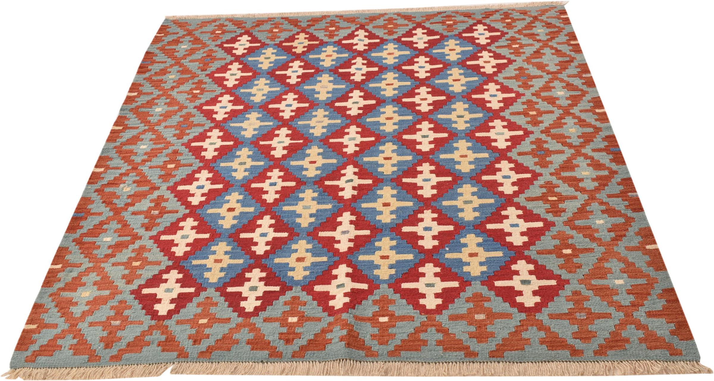 This rug was made as a flat weave by hand on a loom. Flatweave is the term used to describe rugs that have no pile. As the name promises, these rugs are woven and not knotted. This results in a flat rug with a structured surface. Flatweaves are not as soft and usually thinner than knotted rugs. At the same time they are much less complex to manufacture and can usually be laid out from both sides (front and back). Their patterns are usually geometric, which is determined by the fabric.