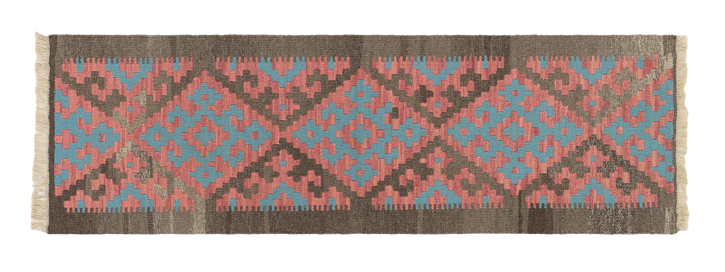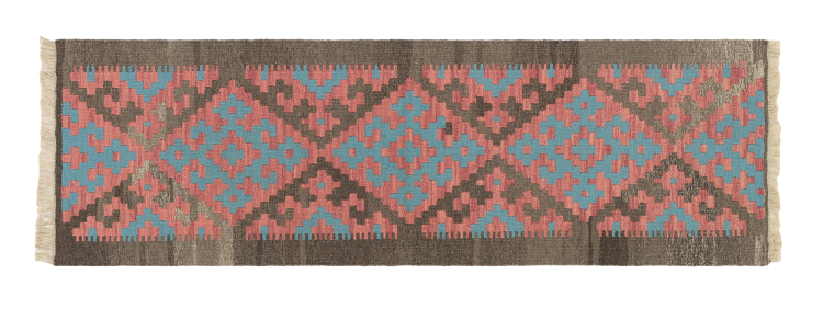 This rug was made as a flat weave by hand on a loom. Flatweave is the term used to describe rugs that have no pile. As the name promises, these rugs are woven and not knotted. This results in a flat rug with a structured surface. Flatweaves are not as soft and usually thinner than knotted rugs. At the same time they are much less complex to manufacture and can usually be laid out from both sides (front and back). Their patterns are usually geometric, which is determined by the fabric.