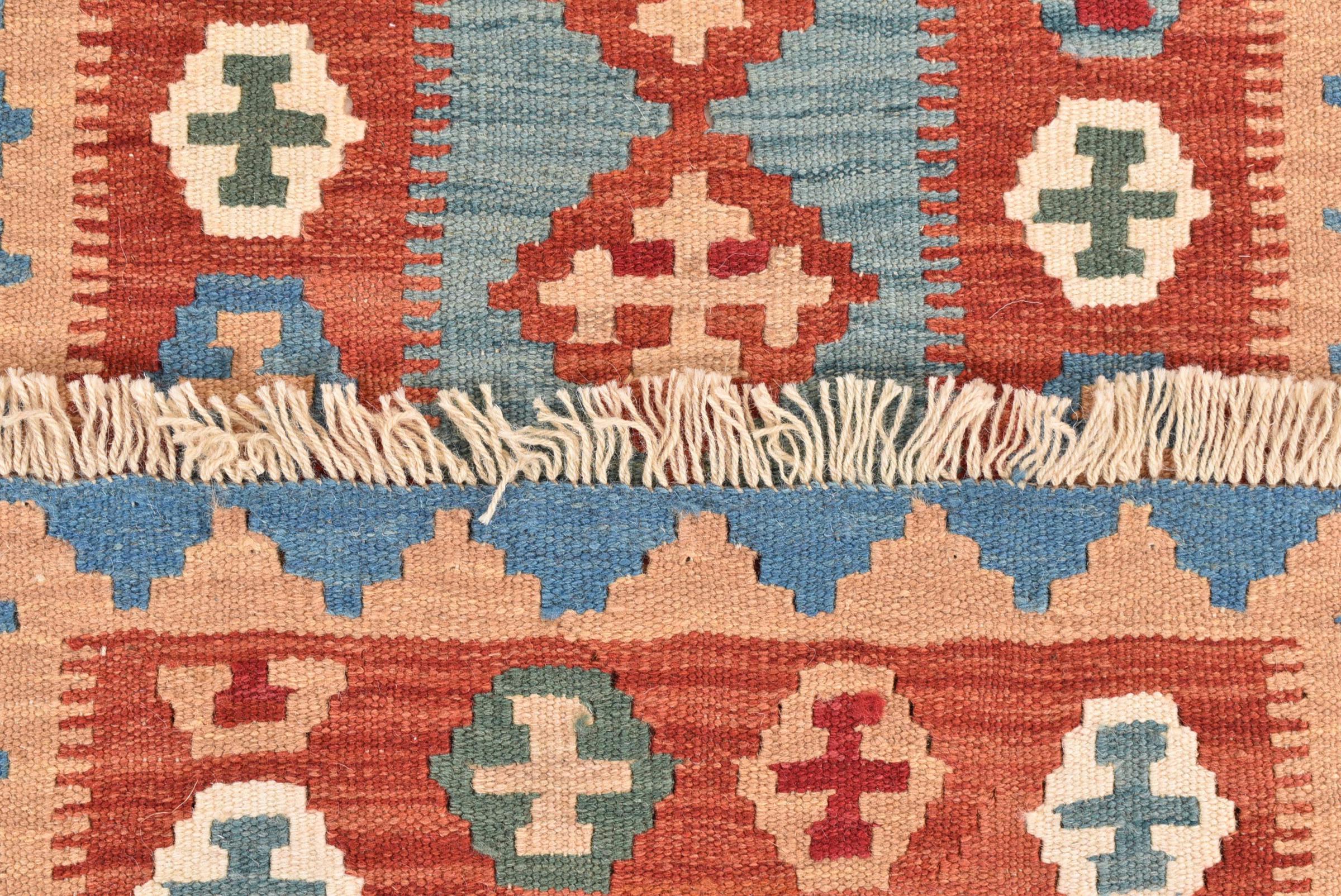 This rug was made as a flat weave by hand on a loom. Flatweave is the term used to describe rugs that have no pile. As the name promises, these rugs are woven and not knotted. This results in a flat rug with a structured surface. Flatweaves are not as soft and usually thinner than knotted rugs. At the same time they are much less complex to manufacture and can usually be laid out from both sides (front and back). Their patterns are usually geometric, which is determined by the fabric.