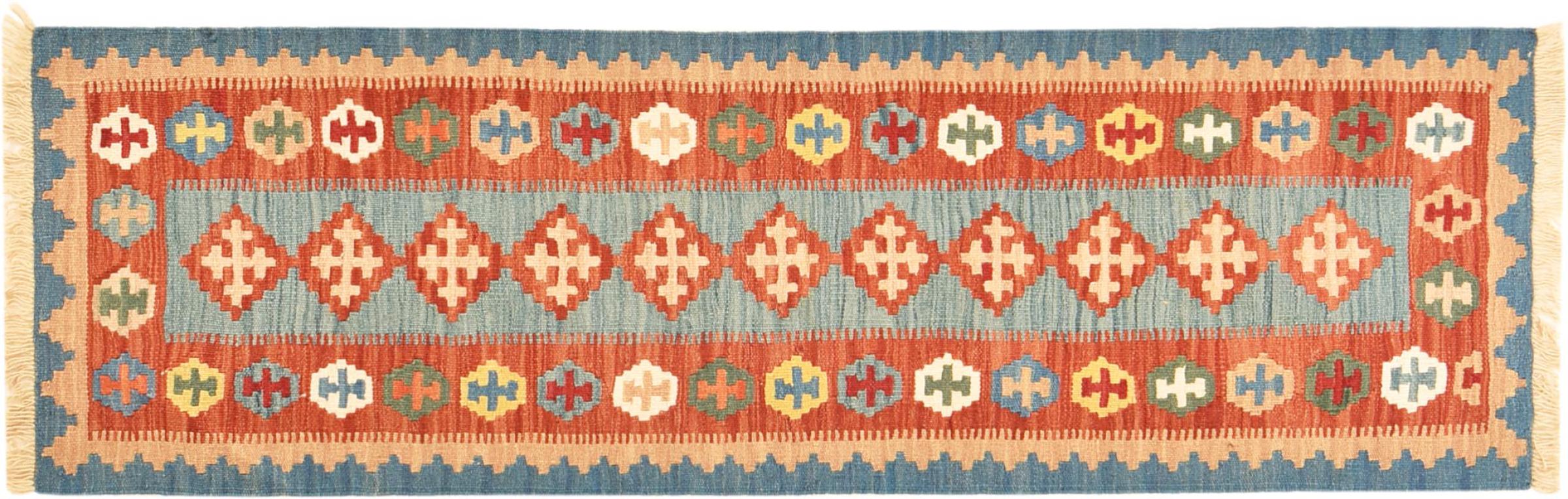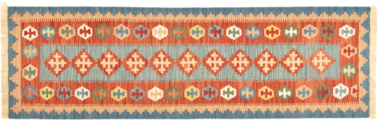 This handwoven Kilim Fars combines Persian patterns with the old tradition of flat fabrics. It represents a beautiful composition of contemporary Persian elements and a modern style. Due to the carpet's geometric patterns and its warm colours, this type of rug is extremely popular in modern interior magazines. Additionally, this Kilim can be used in many different ways. Whether you would like to use it as a bed cover or as a carpet in front of your sofa – a Kilim Fars fulfils nearly all wishes.