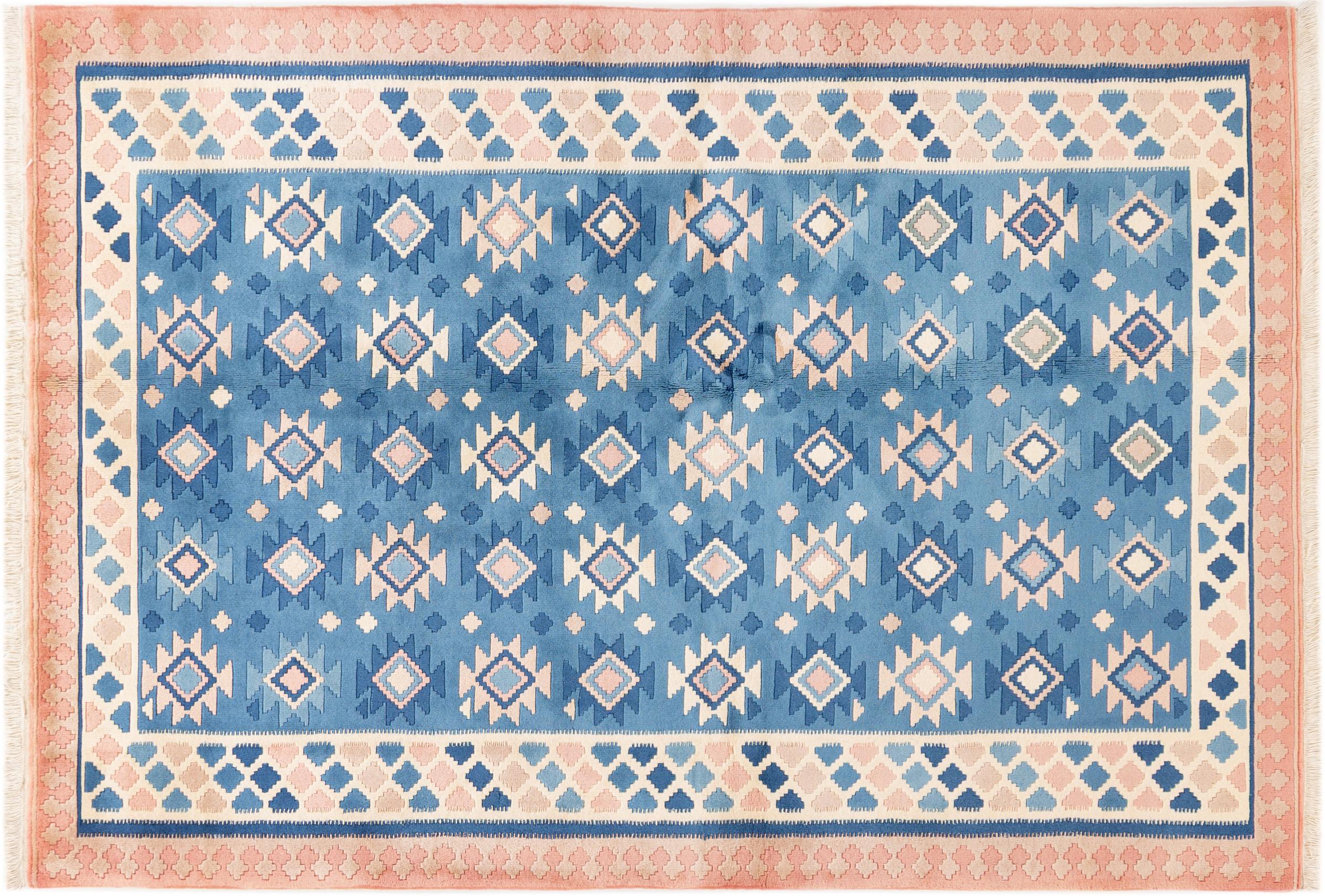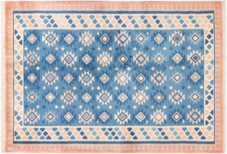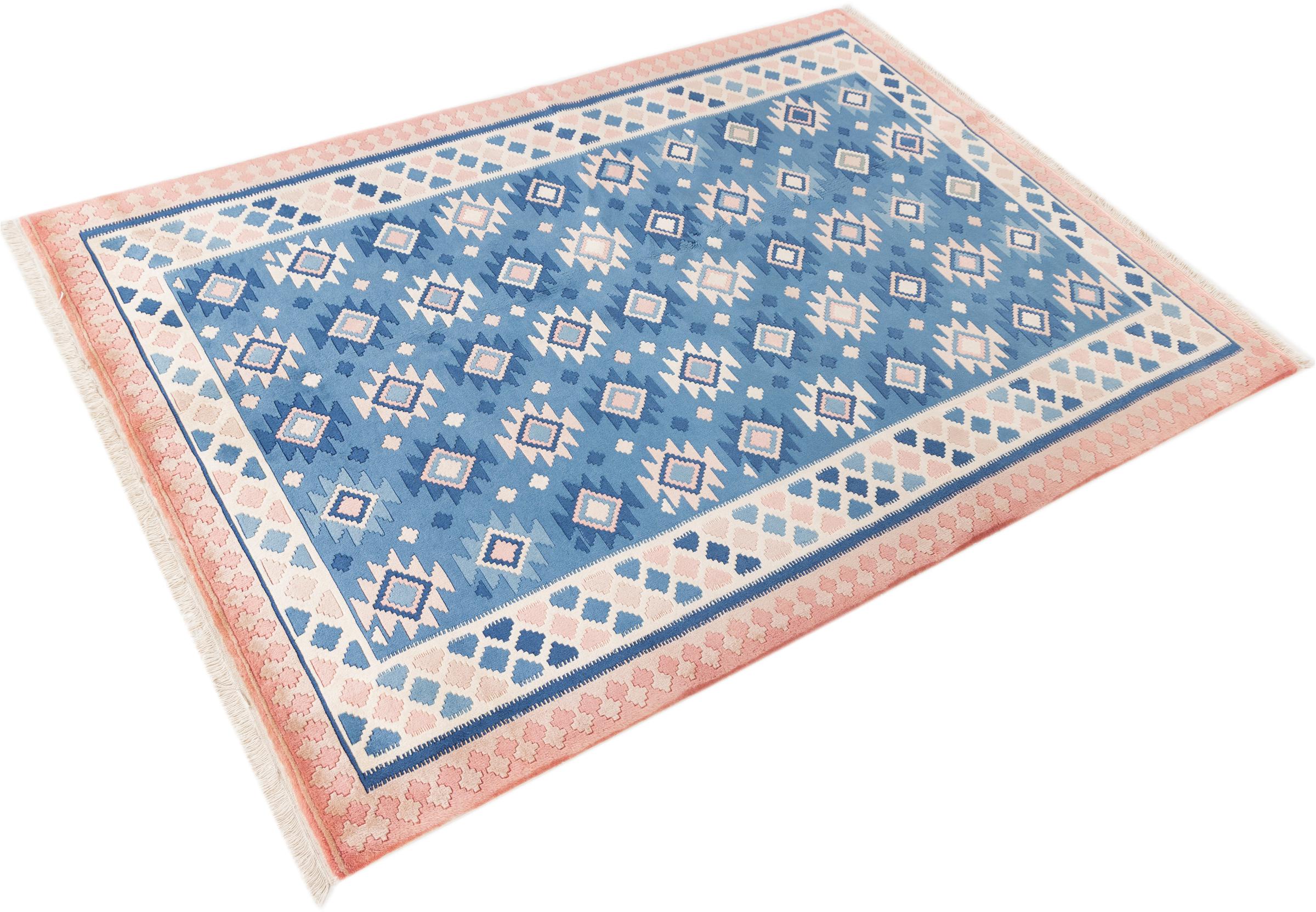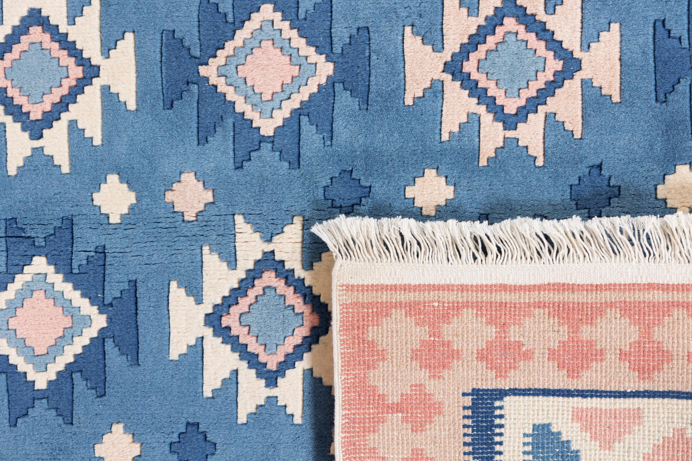This rug was made as a flat weave by hand on a loom. Flatweave is the term used to describe rugs that have no pile. As the name promises, these rugs are woven and not knotted. This results in a flat rug with a structured surface. Flatweaves are not as soft and usually thinner than knotted rugs. At the same time they are much less complex to manufacture and can usually be laid out from both sides (front and back). Their patterns are usually geometric, which is determined by the fabric.