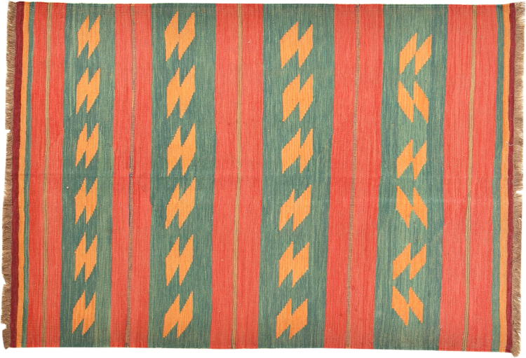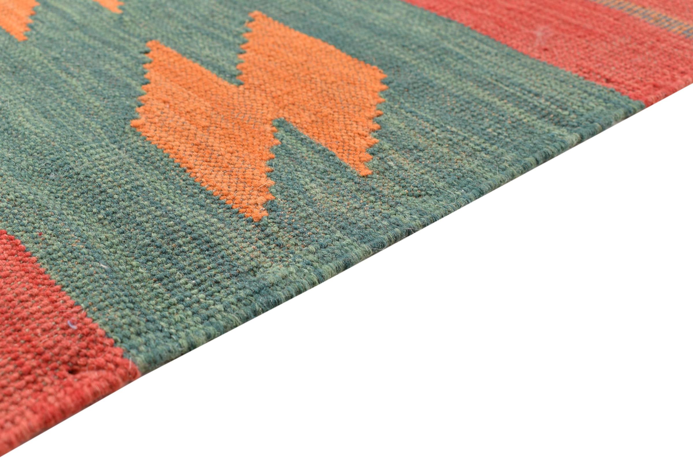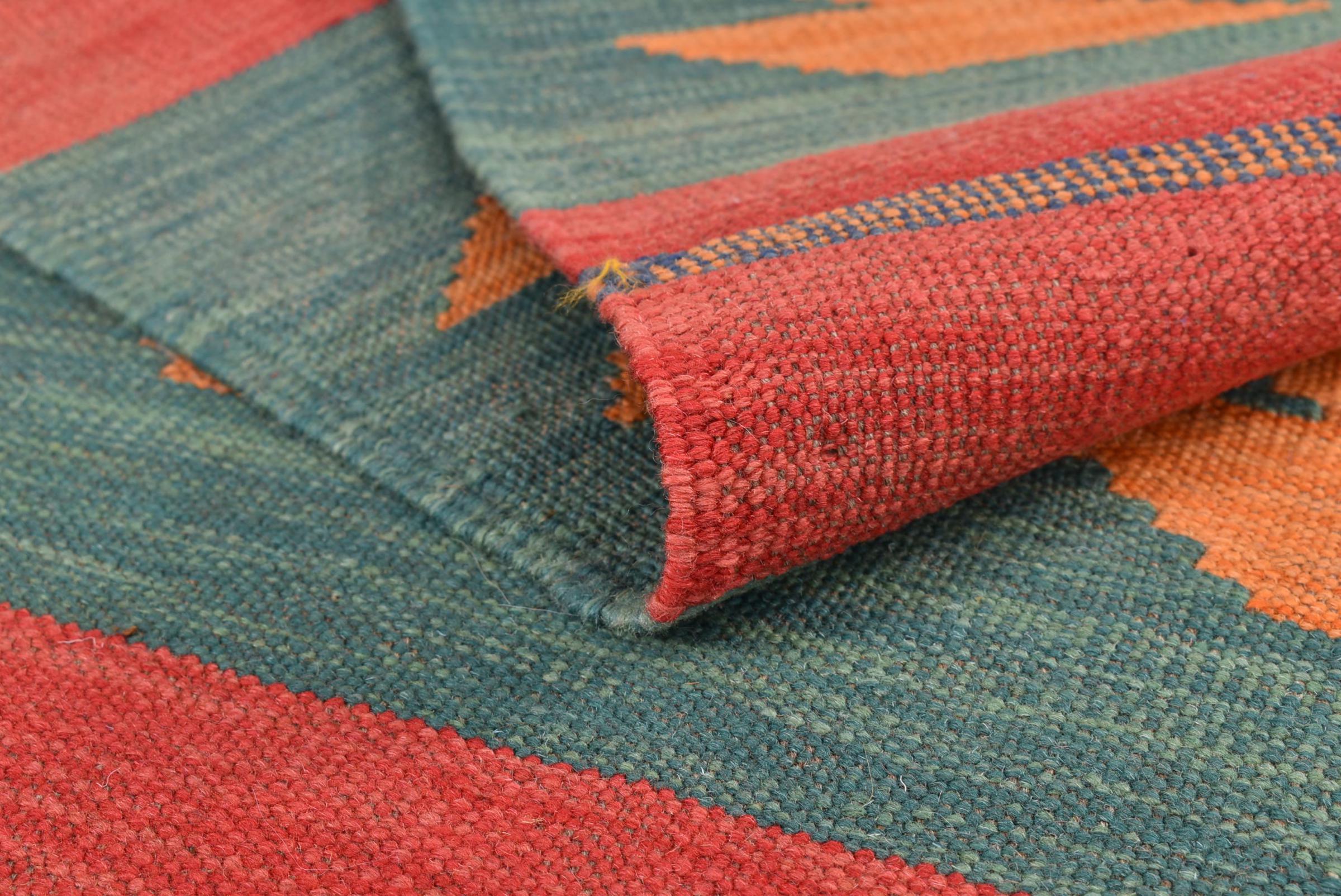 This rug was made as a flat weave by hand on a loom. Flatweave is the term used to describe rugs that have no pile. As the name promises, these rugs are woven and not knotted. This results in a flat rug with a structured surface. Flatweaves are not as soft and usually thinner than knotted rugs. At the same time they are much less complex to manufacture and can usually be laid out from both sides (front and back). Their patterns are usually geometric, which is determined by the fabric.