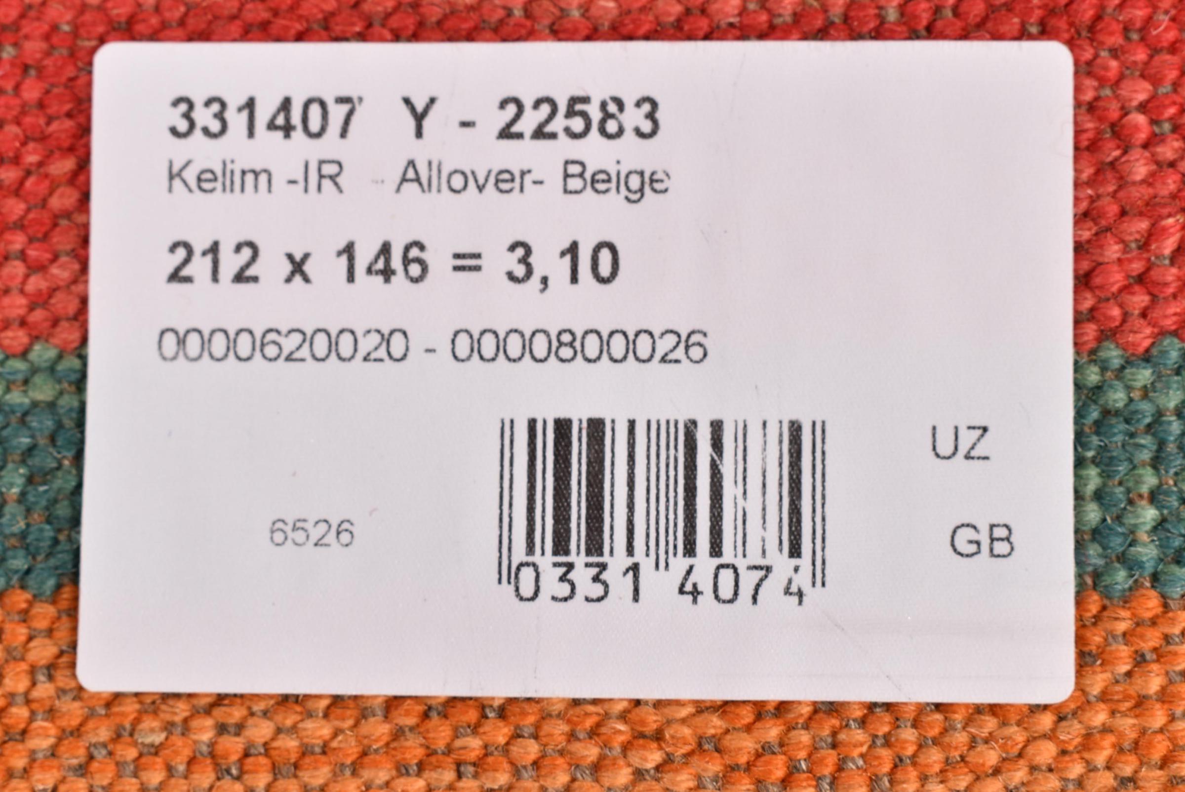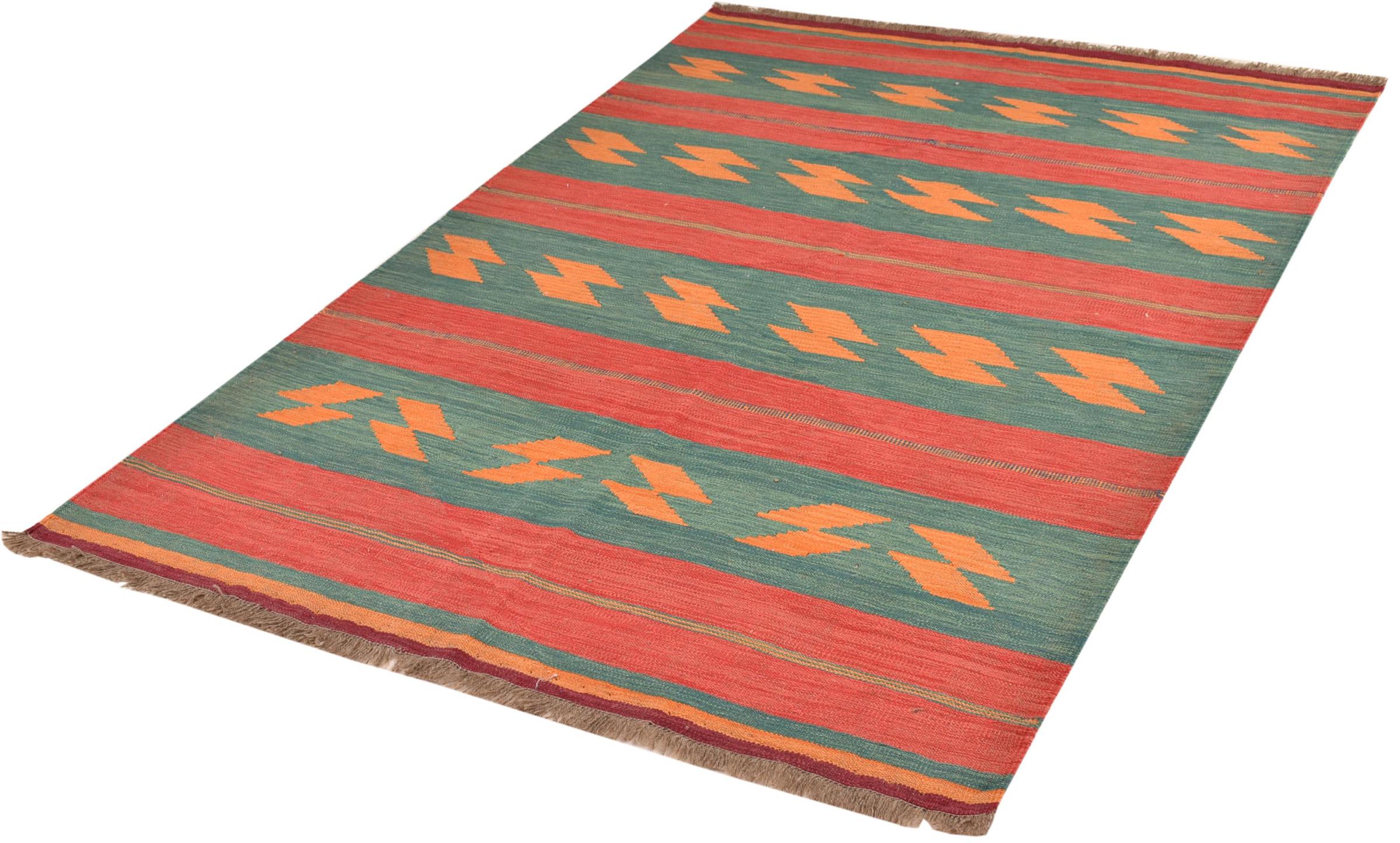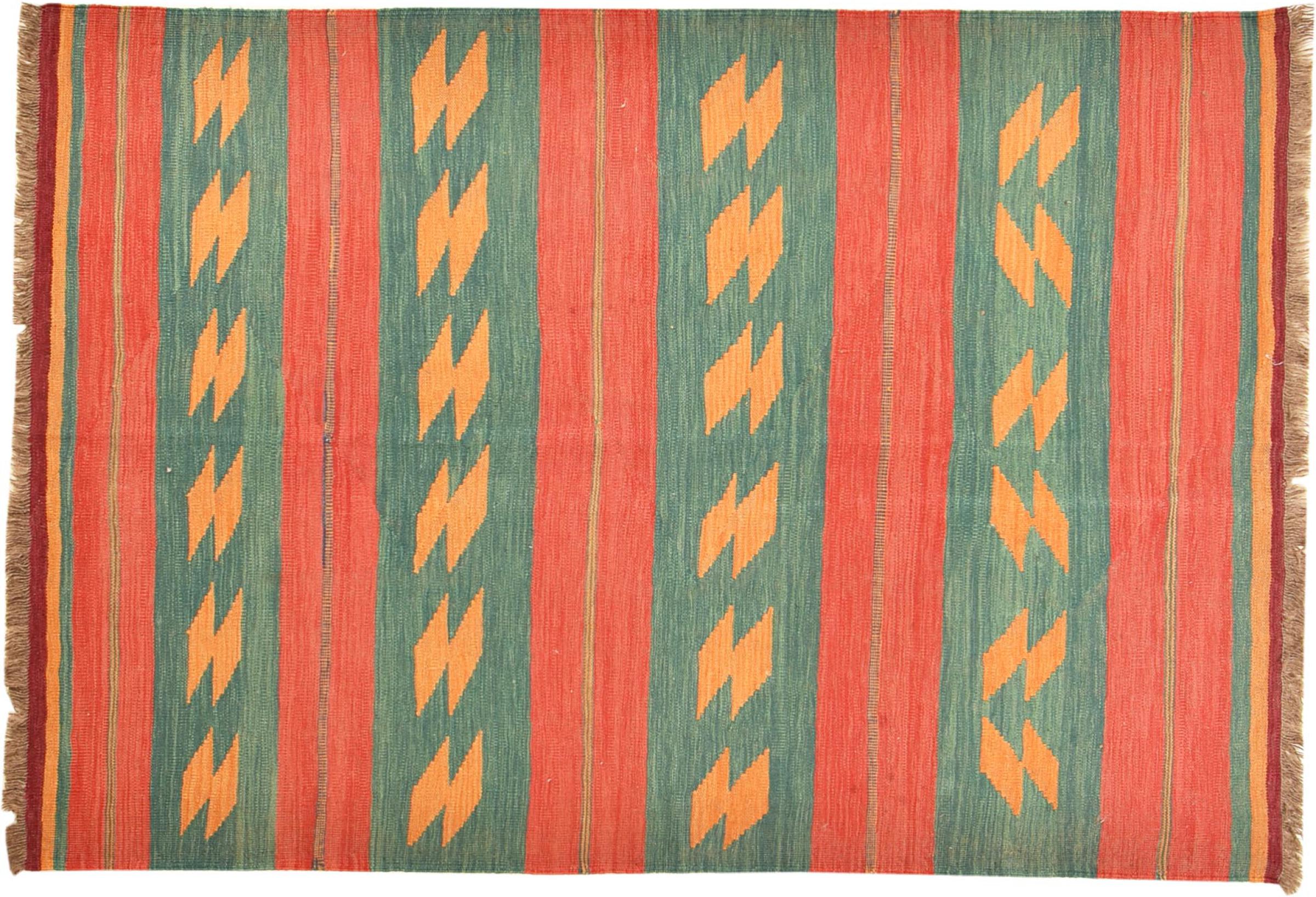This rug was made as a flat weave by hand on a loom. Flatweave is the term used to describe rugs that have no pile. As the name promises, these rugs are woven and not knotted. This results in a flat rug with a structured surface. Flatweaves are not as soft and usually thinner than knotted rugs. At the same time they are much less complex to manufacture and can usually be laid out from both sides (front and back). Their patterns are usually geometric, which is determined by the fabric.