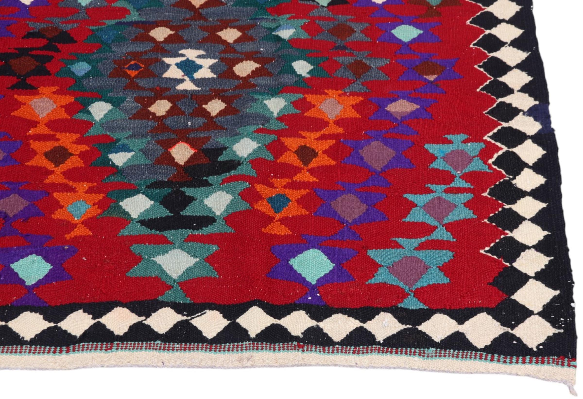 This rug was made as a flat weave by hand on a loom. Flatweave is the term used to describe rugs that have no pile. As the name promises, these rugs are woven and not knotted. This results in a flat rug with a structured surface. Flatweaves are not as soft and usually thinner than knotted rugs. At the same time they are much less complex to manufacture and can usually be laid out from both sides (front and back). Their patterns are usually geometric, which is determined by the fabric.