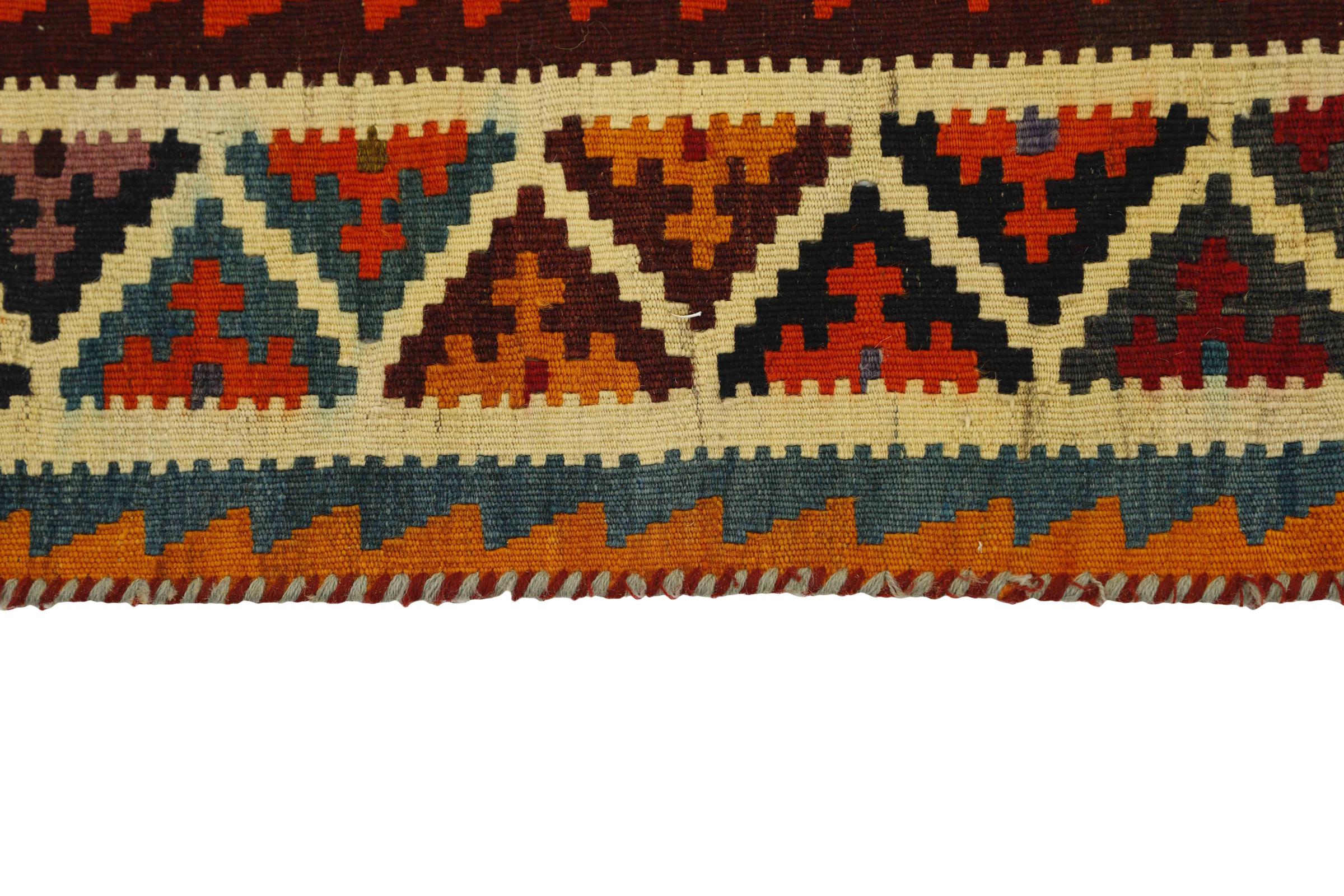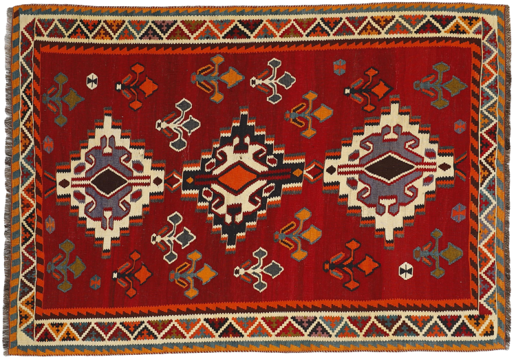 This rug was made as a flat weave by hand on a loom. Flatweave is the term used to describe rugs that have no pile. As the name promises, these rugs are woven and not knotted. This results in a flat rug with a structured surface. Flatweaves are not as soft and usually thinner than knotted rugs. At the same time they are much less complex to manufacture and can usually be laid out from both sides (front and back). Their patterns are usually geometric, which is determined by the fabric.