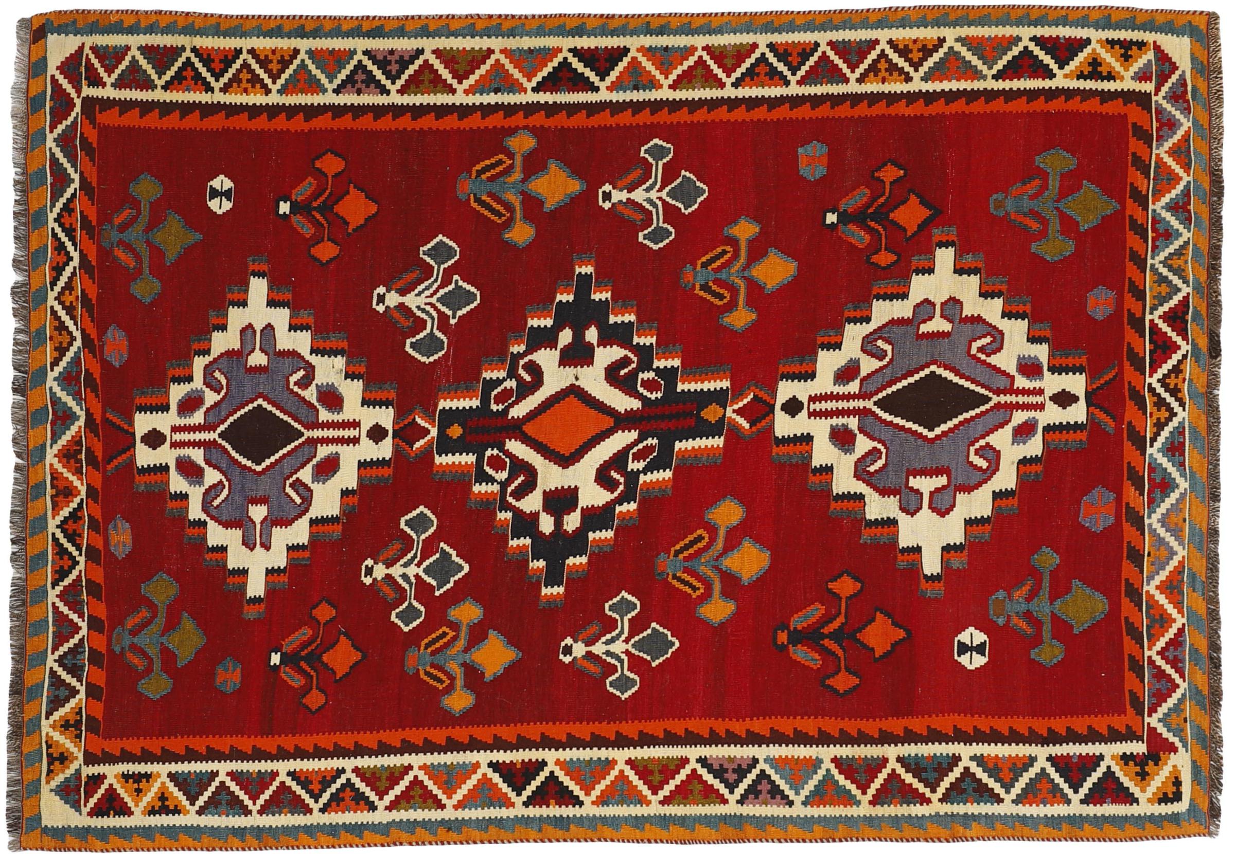 This handwoven Kilim Fars combines Persian patterns with the old tradition of flat fabrics. It represents a beautiful composition of contemporary Persian elements and a modern style. Due to the carpet's geometric patterns and its warm colours, this type of rug is extremely popular in modern interior magazines. Additionally, this Kilim can be used in many different ways. Whether you would like to use it as a bed cover or as a carpet in front of your sofa – a Kilim Fars fulfils nearly all wishes.