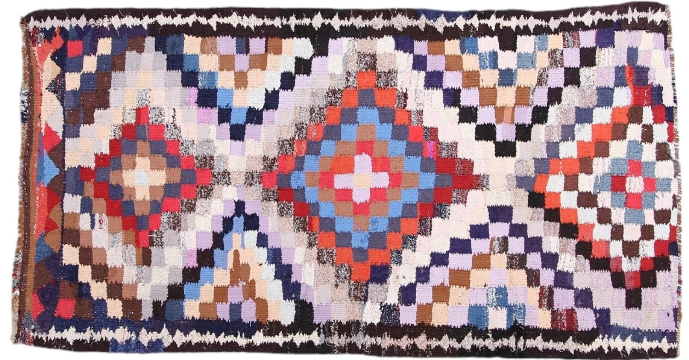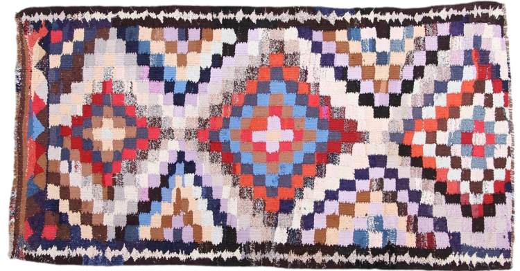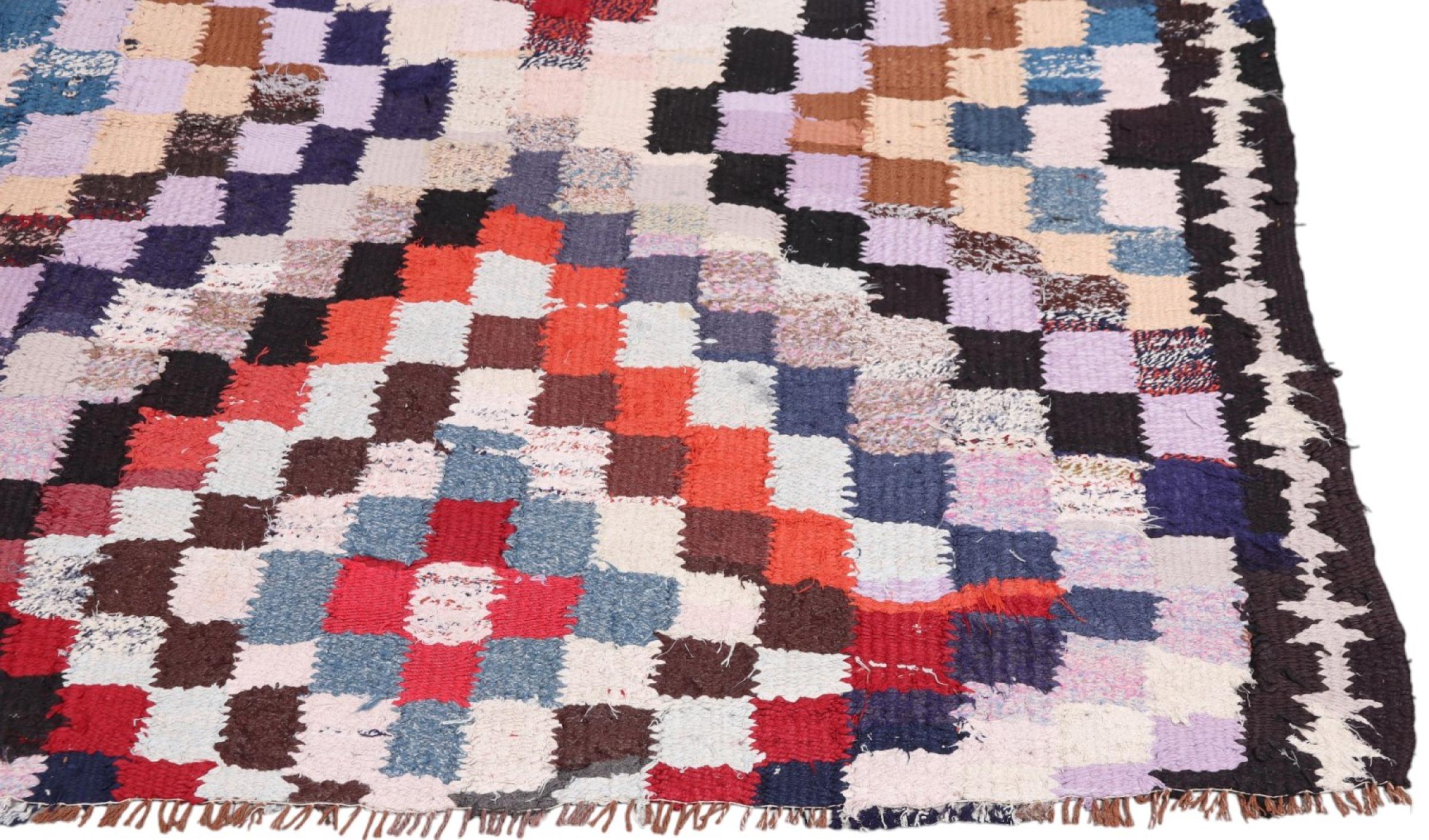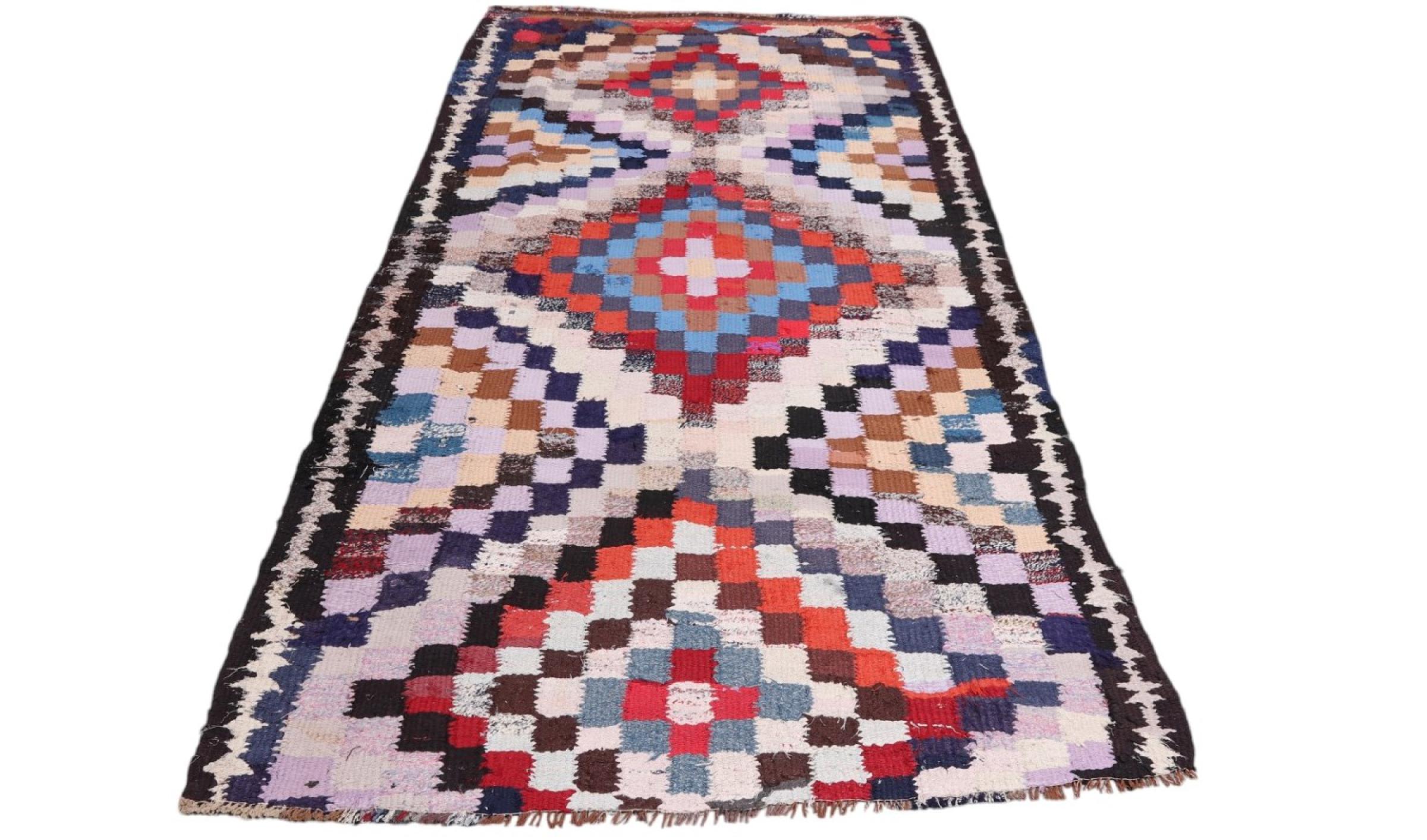 This rug was made as a flat weave by hand on a loom. Flatweave is the term used to describe rugs that have no pile. As the name promises, these rugs are woven and not knotted. This results in a flat rug with a structured surface. Flatweaves are not as soft and usually thinner than knotted rugs. At the same time they are much less complex to manufacture and can usually be laid out from both sides (front and back). Their patterns are usually geometric, which is determined by the fabric.