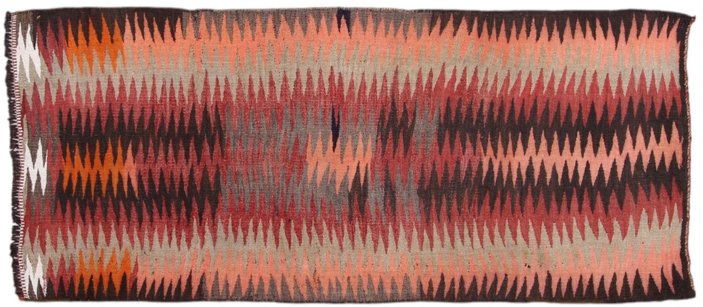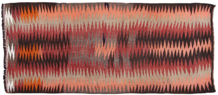 This rug was made as a flat weave by hand on a loom. Flatweave is the term used to describe rugs that have no pile. As the name promises, these rugs are woven and not knotted. This results in a flat rug with a structured surface. Flatweaves are not as soft and usually thinner than knotted rugs. At the same time they are much less complex to manufacture and can usually be laid out from both sides (front and back). Their patterns are usually geometric, which is determined by the fabric.