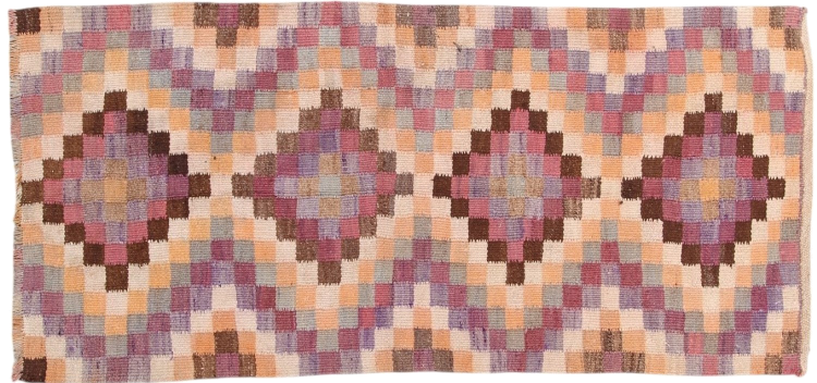This rug was made as a flat weave by hand on a loom. Flatweave is the term used to describe rugs that have no pile. As the name promises, these rugs are woven and not knotted. This results in a flat rug with a structured surface. Flatweaves are not as soft and usually thinner than knotted rugs. At the same time they are much less complex to manufacture and can usually be laid out from both sides (front and back). Their patterns are usually geometric, which is determined by the fabric.