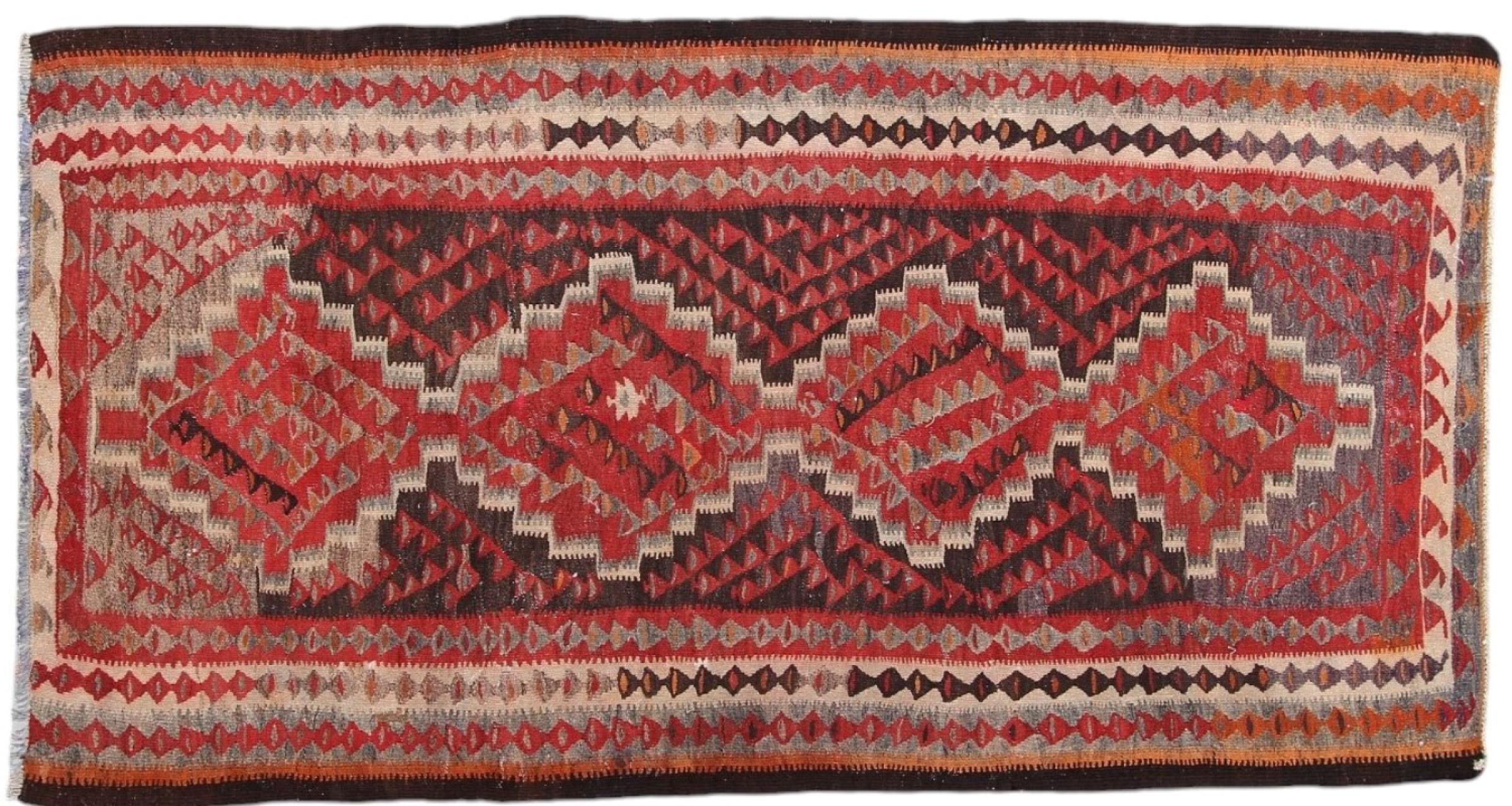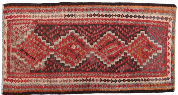 This rug was made as a flat weave by hand on a loom. Flatweave is the term used to describe rugs that have no pile. As the name promises, these rugs are woven and not knotted. This results in a flat rug with a structured surface. Flatweaves are not as soft and usually thinner than knotted rugs. At the same time they are much less complex to manufacture and can usually be laid out from both sides (front and back). Their patterns are usually geometric, which is determined by the fabric.