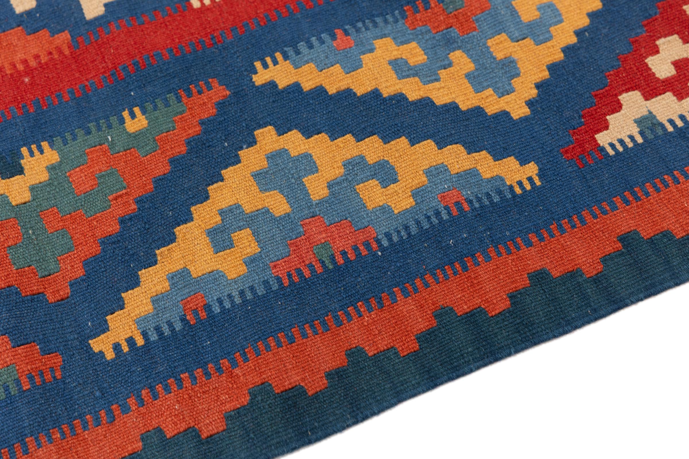 This rug was made as a flat weave by hand on a loom. Flatweave is the term used to describe rugs that have no pile. As the name promises, these rugs are woven and not knotted. This results in a flat rug with a structured surface. Flatweaves are not as soft and usually thinner than knotted rugs. At the same time they are much less complex to manufacture and can usually be laid out from both sides (front and back). Their patterns are usually geometric, which is determined by the fabric.