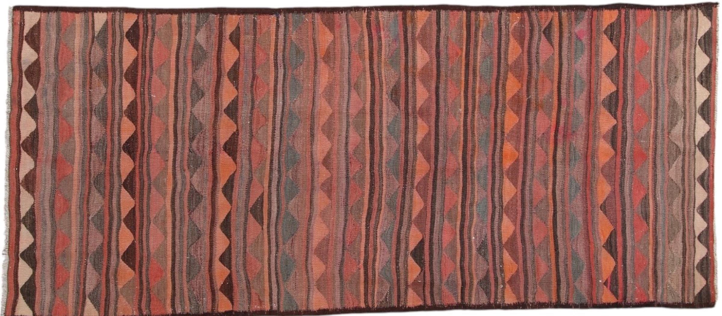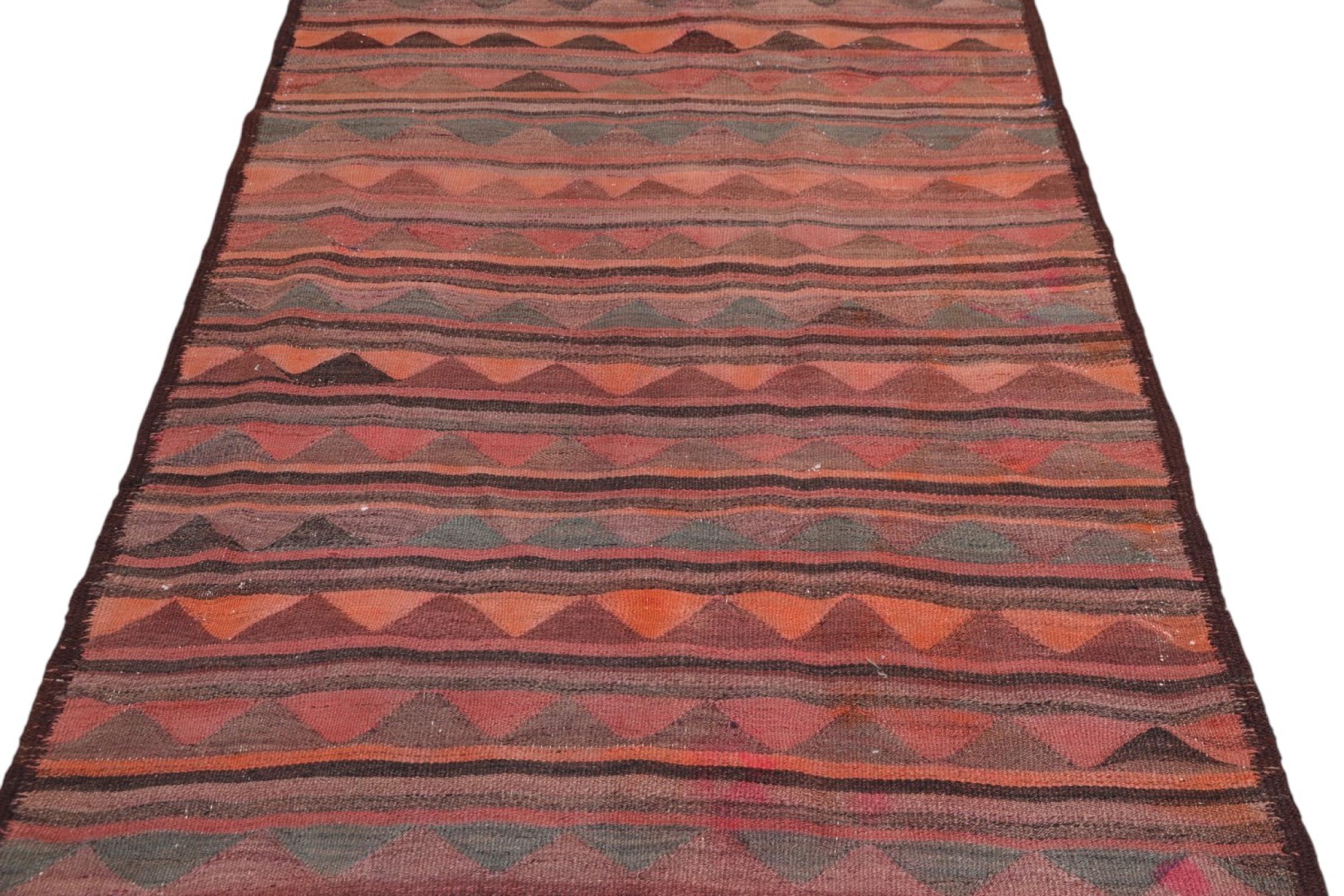 This rug was made as a flat weave by hand on a loom. Flatweave is the term used to describe rugs that have no pile. As the name promises, these rugs are woven and not knotted. This results in a flat rug with a structured surface. Flatweaves are not as soft and usually thinner than knotted rugs. At the same time they are much less complex to manufacture and can usually be laid out from both sides (front and back). Their patterns are usually geometric, which is determined by the fabric.