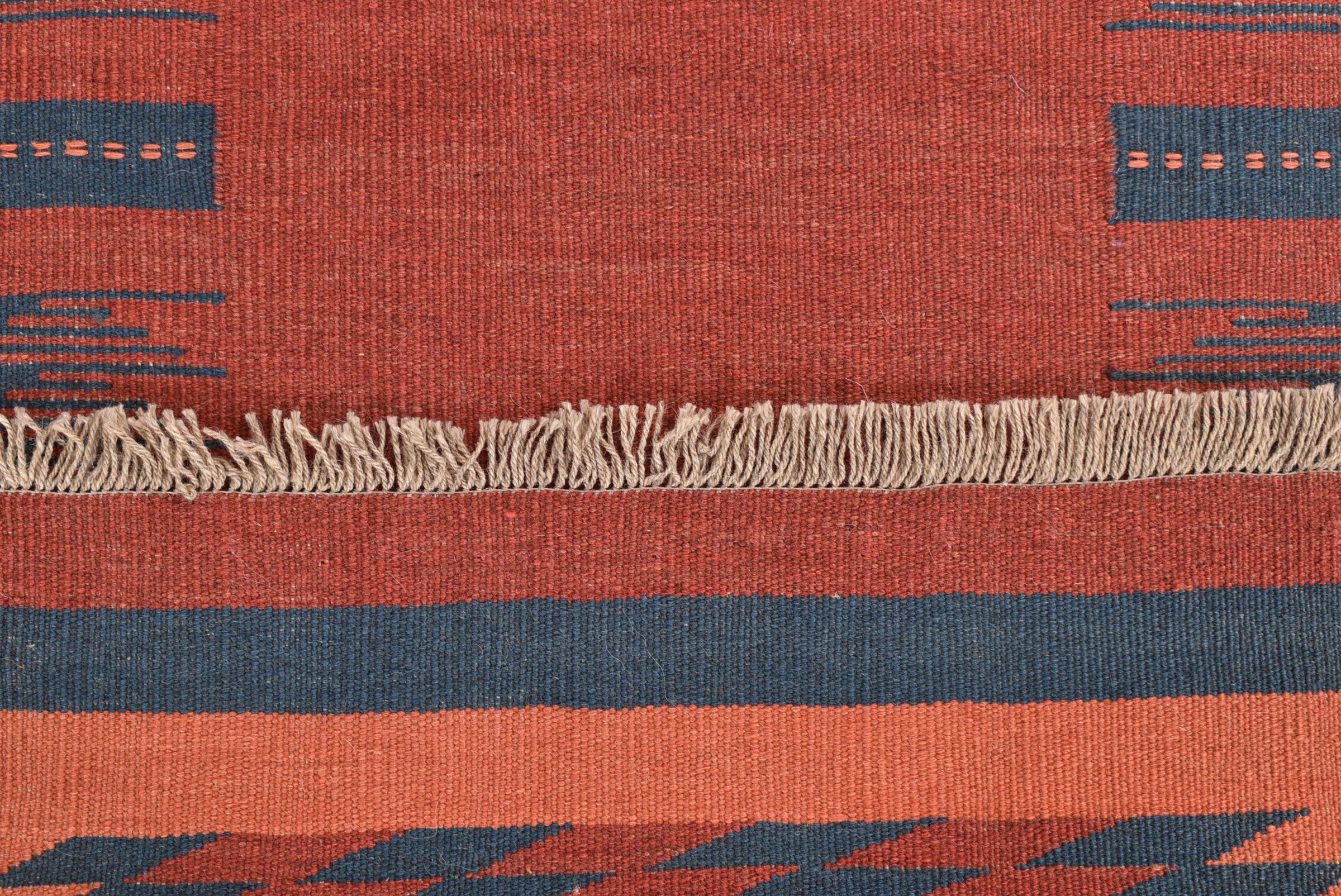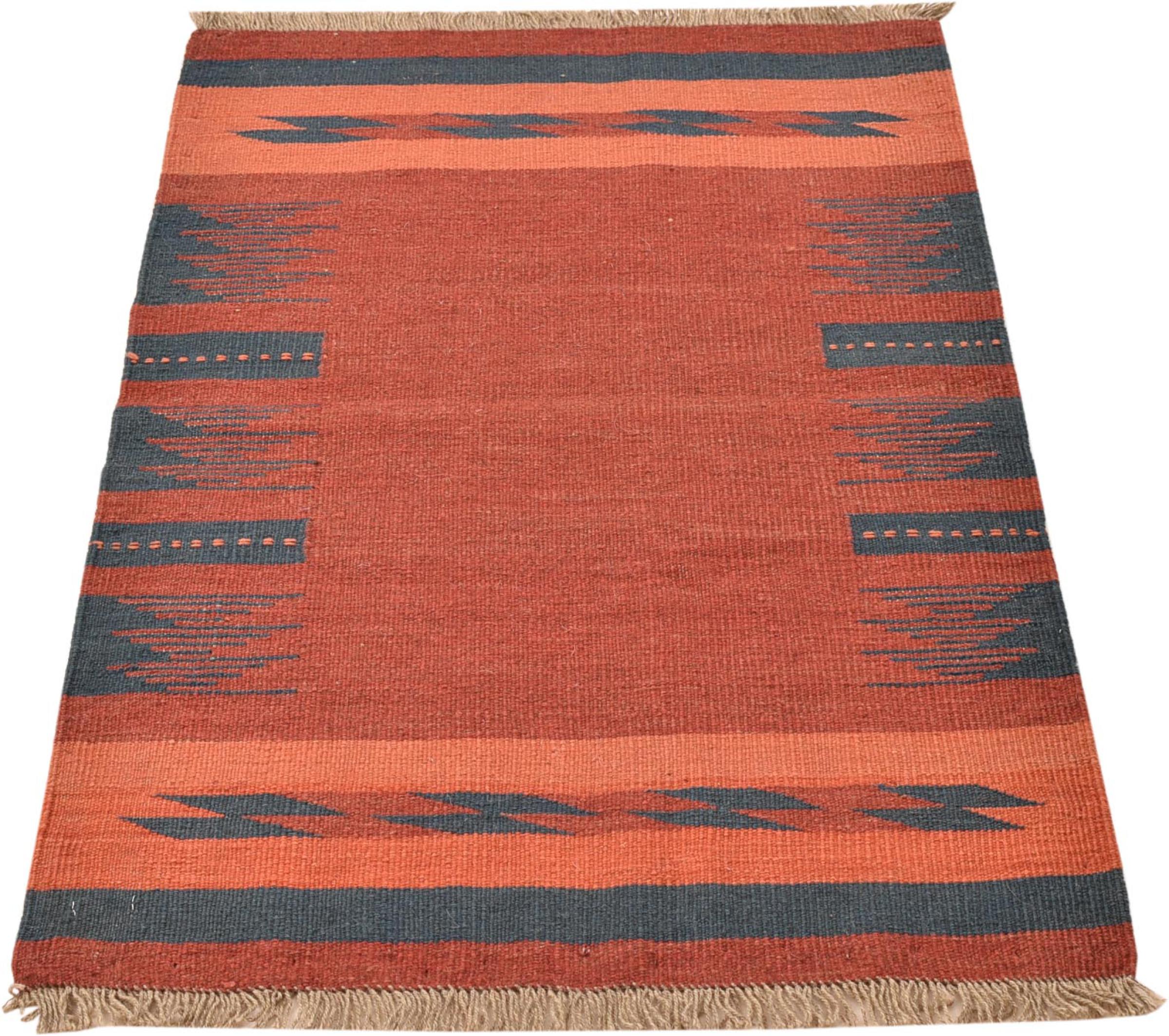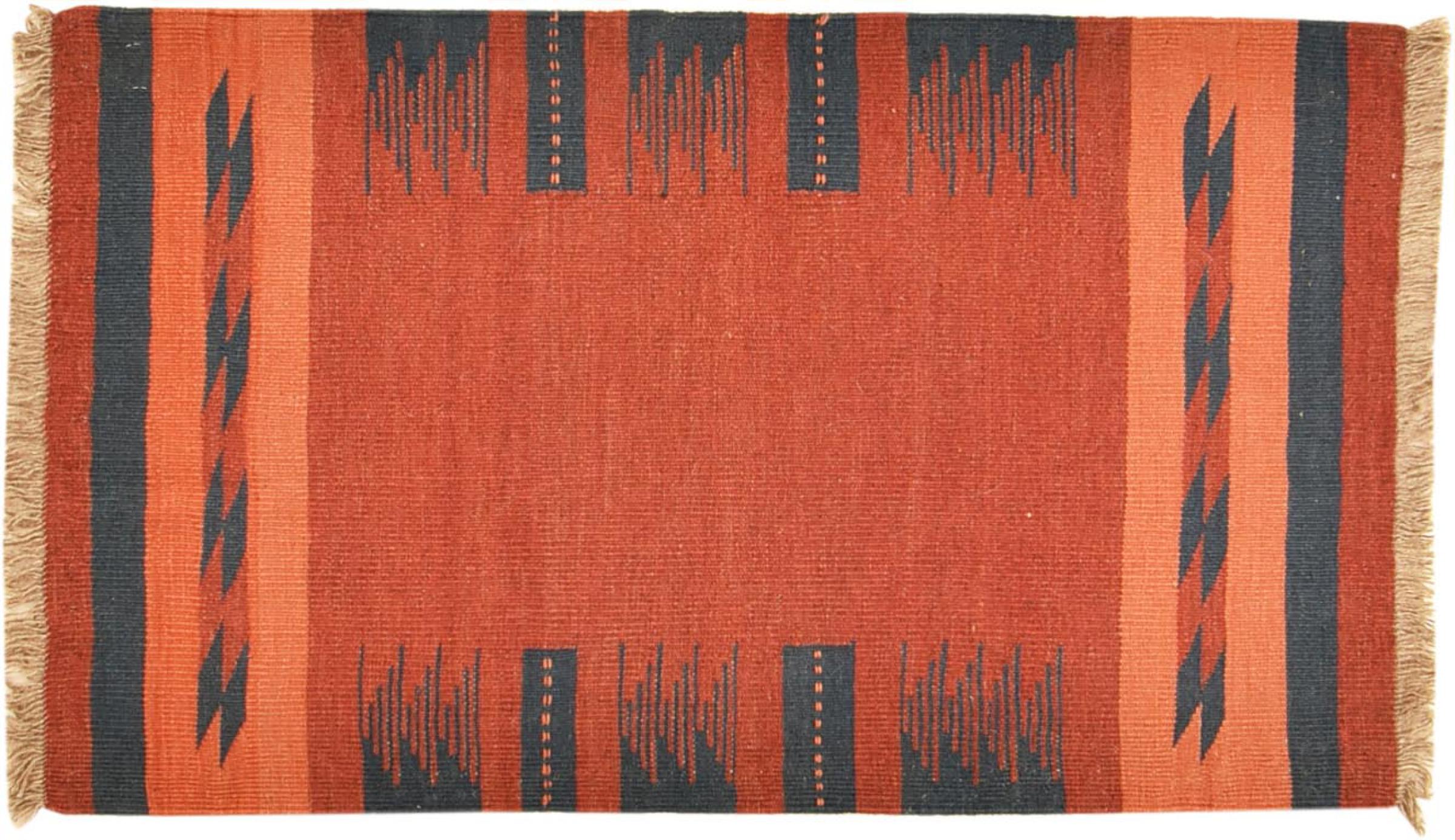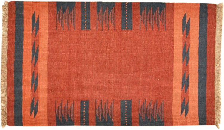 This rug was made as a flat weave by hand on a loom. Flatweave is the term used to describe rugs that have no pile. As the name promises, these rugs are woven and not knotted. This results in a flat rug with a structured surface. Flatweaves are not as soft and usually thinner than knotted rugs. At the same time they are much less complex to manufacture and can usually be laid out from both sides (front and back). Their patterns are usually geometric, which is determined by the fabric.