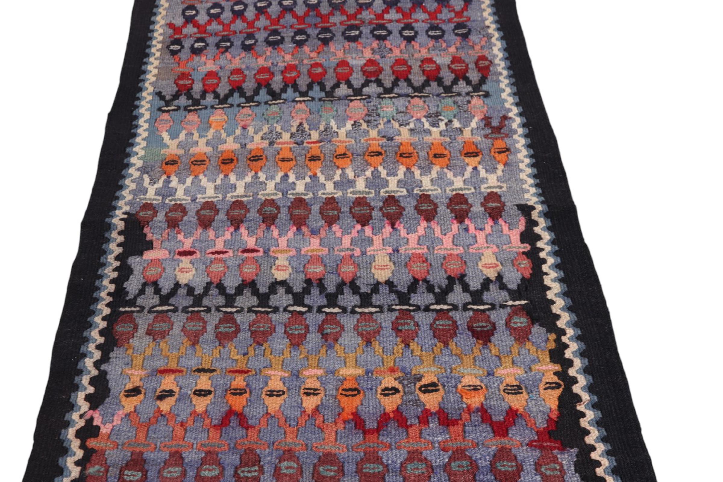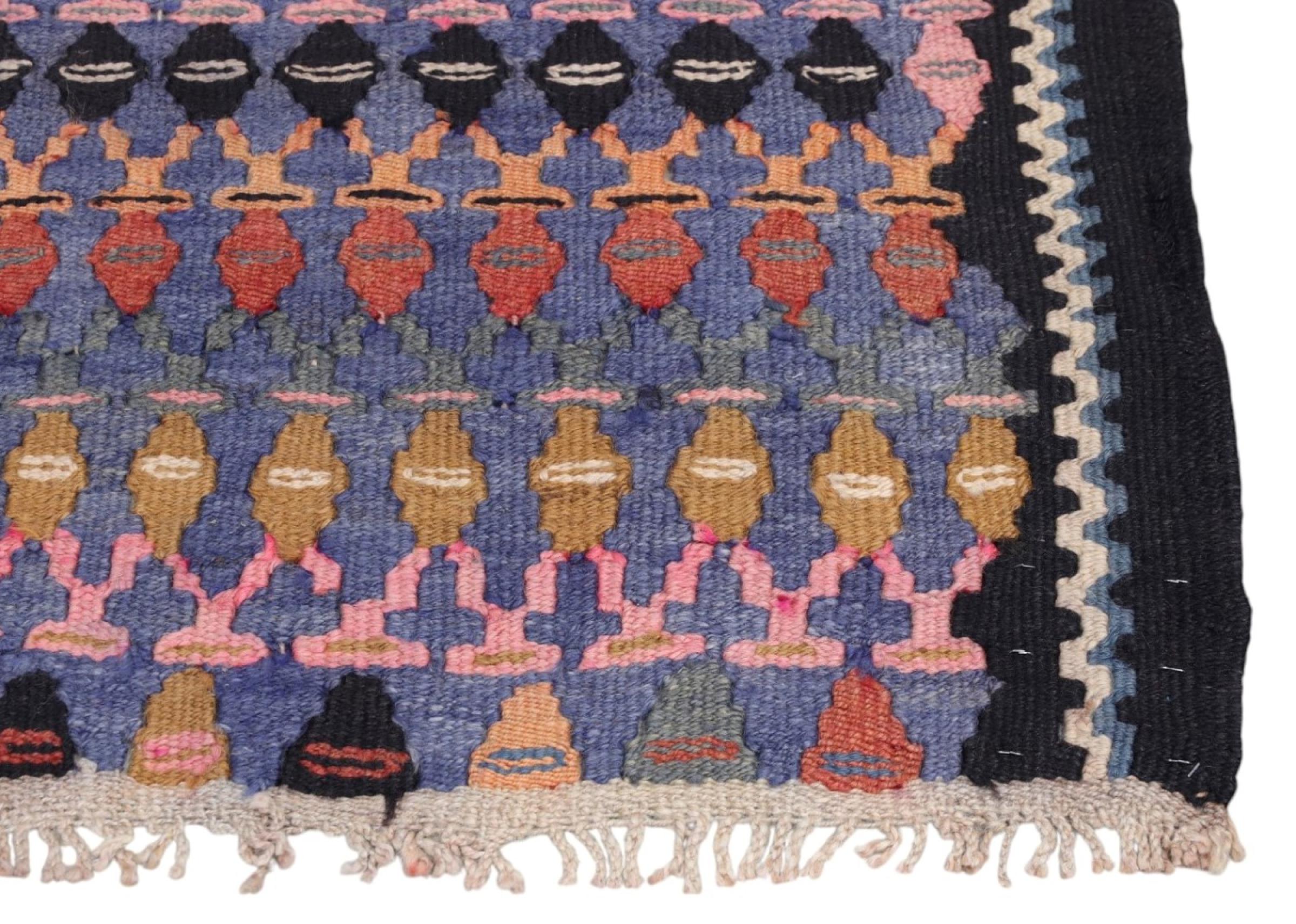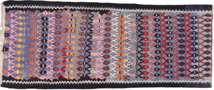 This rug was made as a flat weave by hand on a loom. Flatweave is the term used to describe rugs that have no pile. As the name promises, these rugs are woven and not knotted. This results in a flat rug with a structured surface. Flatweaves are not as soft and usually thinner than knotted rugs. At the same time they are much less complex to manufacture and can usually be laid out from both sides (front and back). Their patterns are usually geometric, which is determined by the fabric.