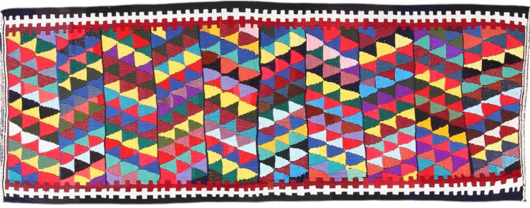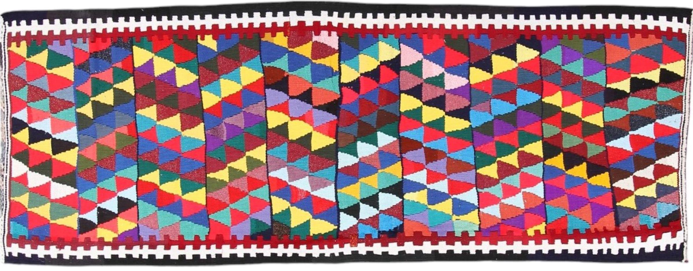This rug was made as a flat weave by hand on a loom. Flatweave is the term used to describe rugs that have no pile. As the name promises, these rugs are woven and not knotted. This results in a flat rug with a structured surface. Flatweaves are not as soft and usually thinner than knotted rugs. At the same time they are much less complex to manufacture and can usually be laid out from both sides (front and back). Their patterns are usually geometric, which is determined by the fabric.