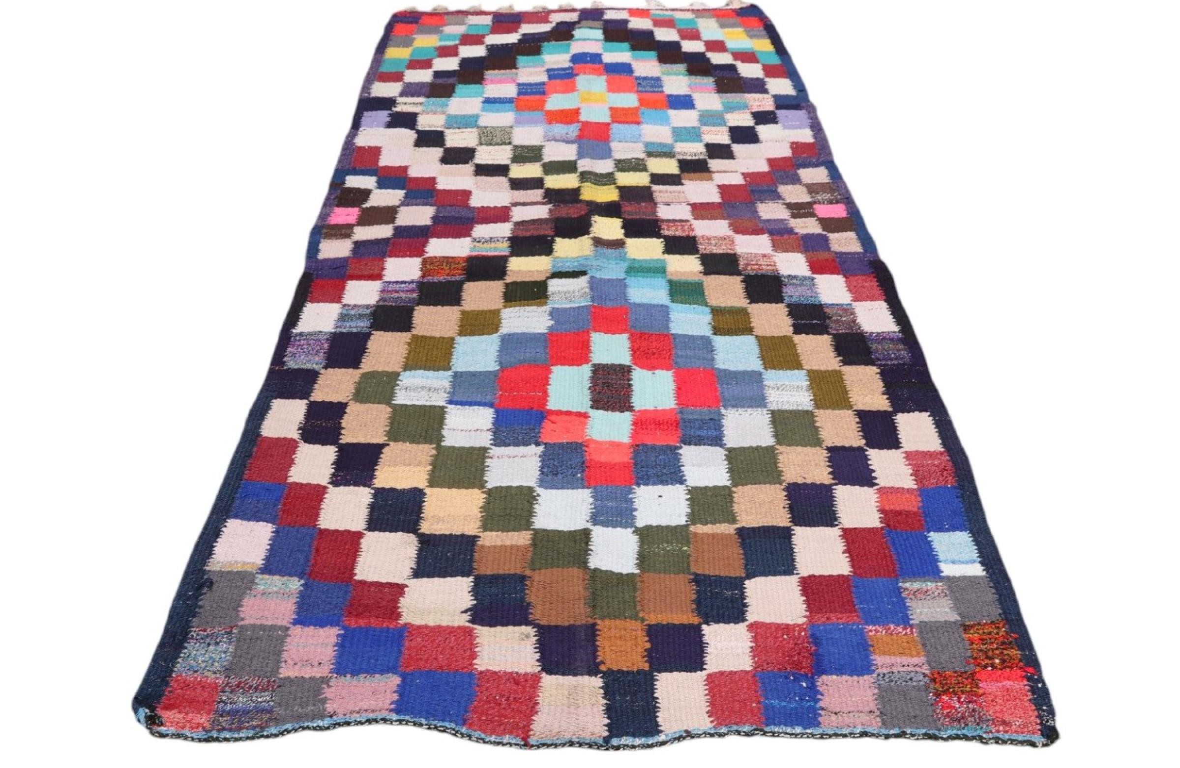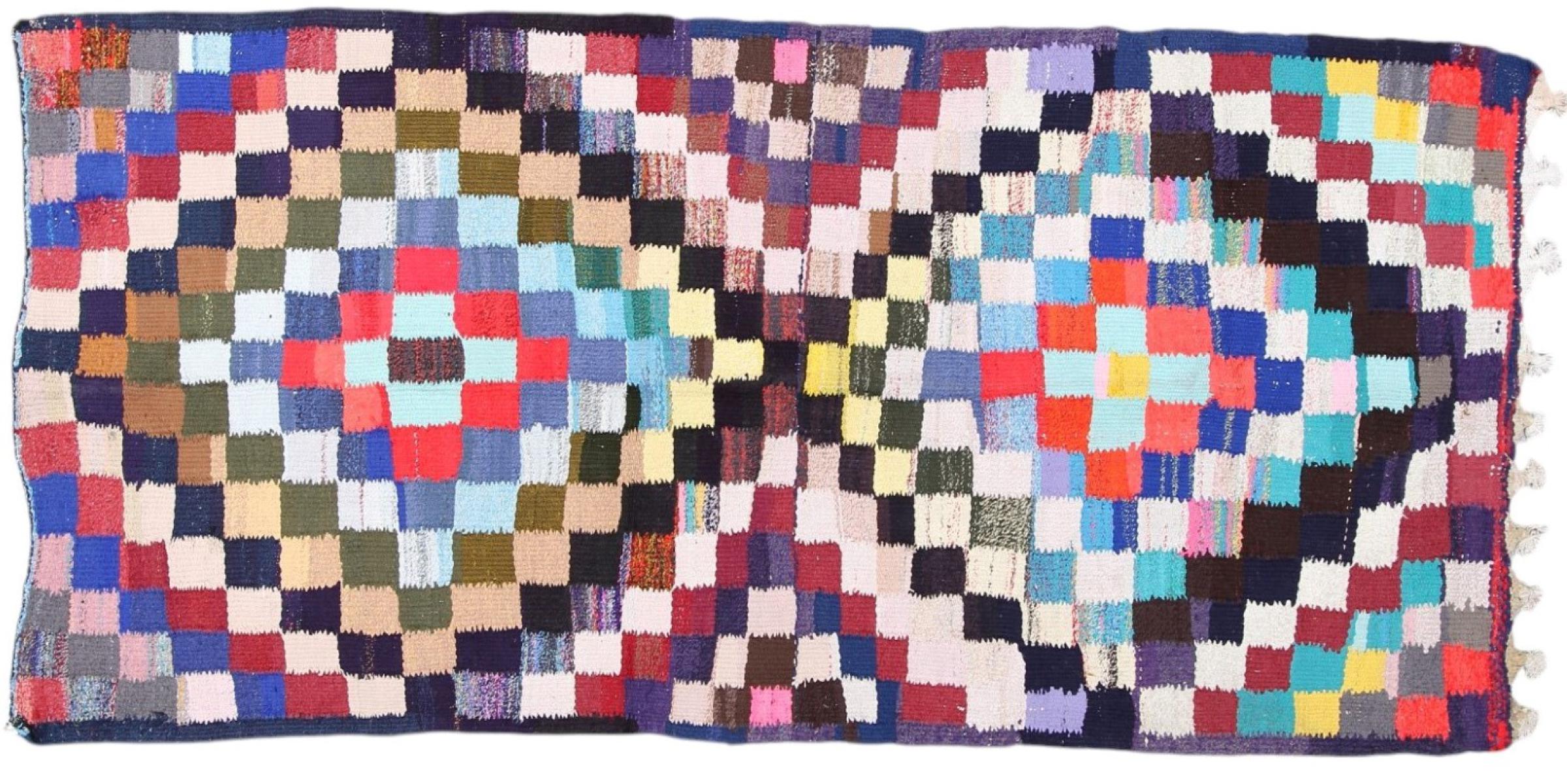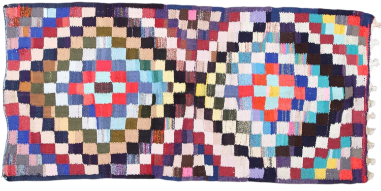 This rug was made as a flat weave by hand on a loom. Flatweave is the term used to describe rugs that have no pile. As the name promises, these rugs are woven and not knotted. This results in a flat rug with a structured surface. Flatweaves are not as soft and usually thinner than knotted rugs. At the same time they are much less complex to manufacture and can usually be laid out from both sides (front and back). Their patterns are usually geometric, which is determined by the fabric.