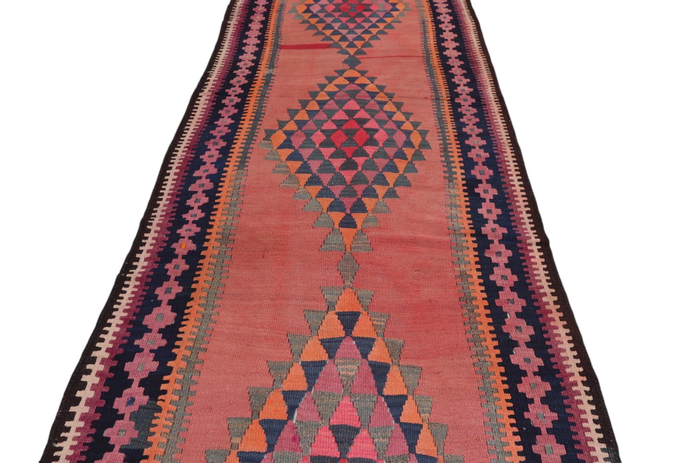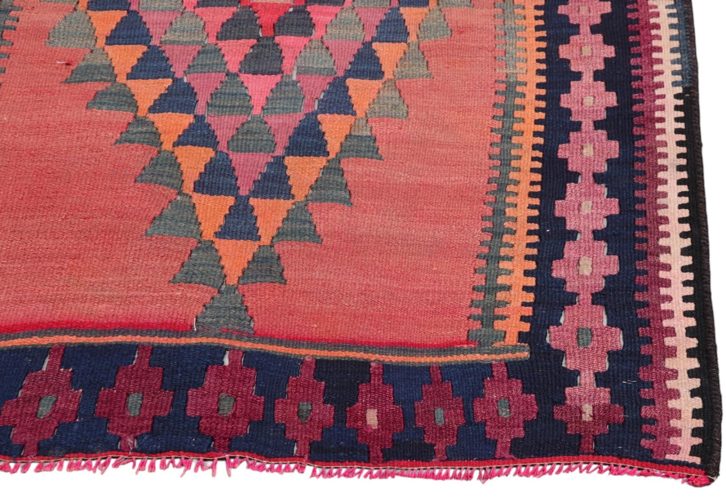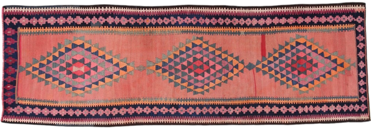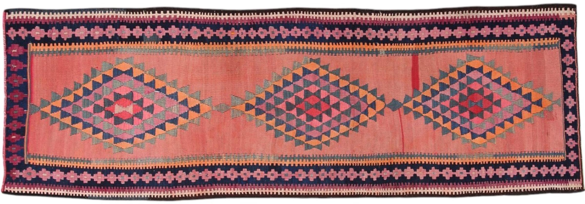 This rug was made as a flat weave by hand on a loom. Flatweave is the term used to describe rugs that have no pile. As the name promises, these rugs are woven and not knotted. This results in a flat rug with a structured surface. Flatweaves are not as soft and usually thinner than knotted rugs. At the same time they are much less complex to manufacture and can usually be laid out from both sides (front and back). Their patterns are usually geometric, which is determined by the fabric.