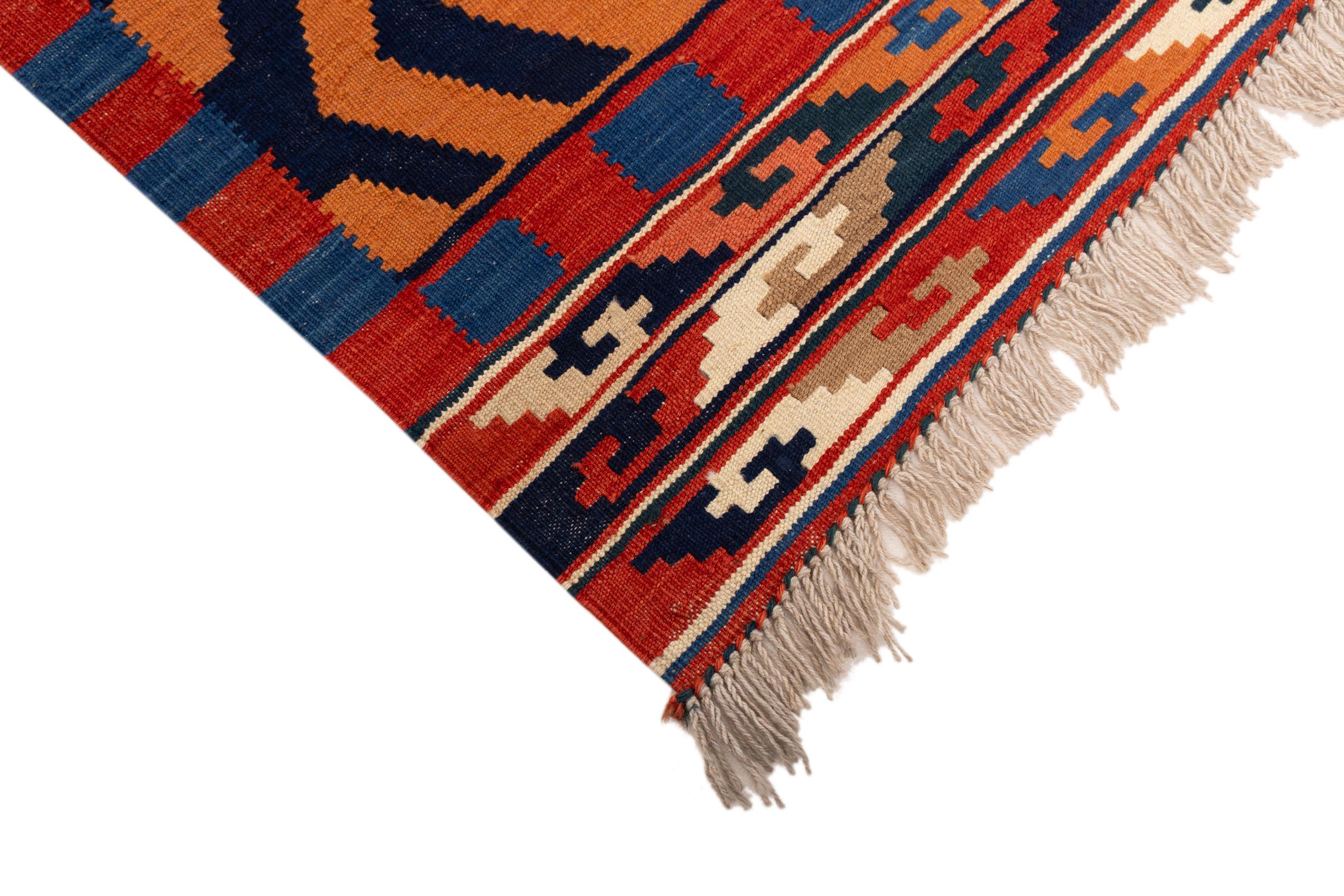 This rug was made as a flat weave by hand on a loom. Flatweave is the term used to describe rugs that have no pile. As the name promises, these rugs are woven and not knotted. This results in a flat rug with a structured surface. Flatweaves are not as soft and usually thinner than knotted rugs. At the same time they are much less complex to manufacture and can usually be laid out from both sides (front and back). Their patterns are usually geometric, which is determined by the fabric.
