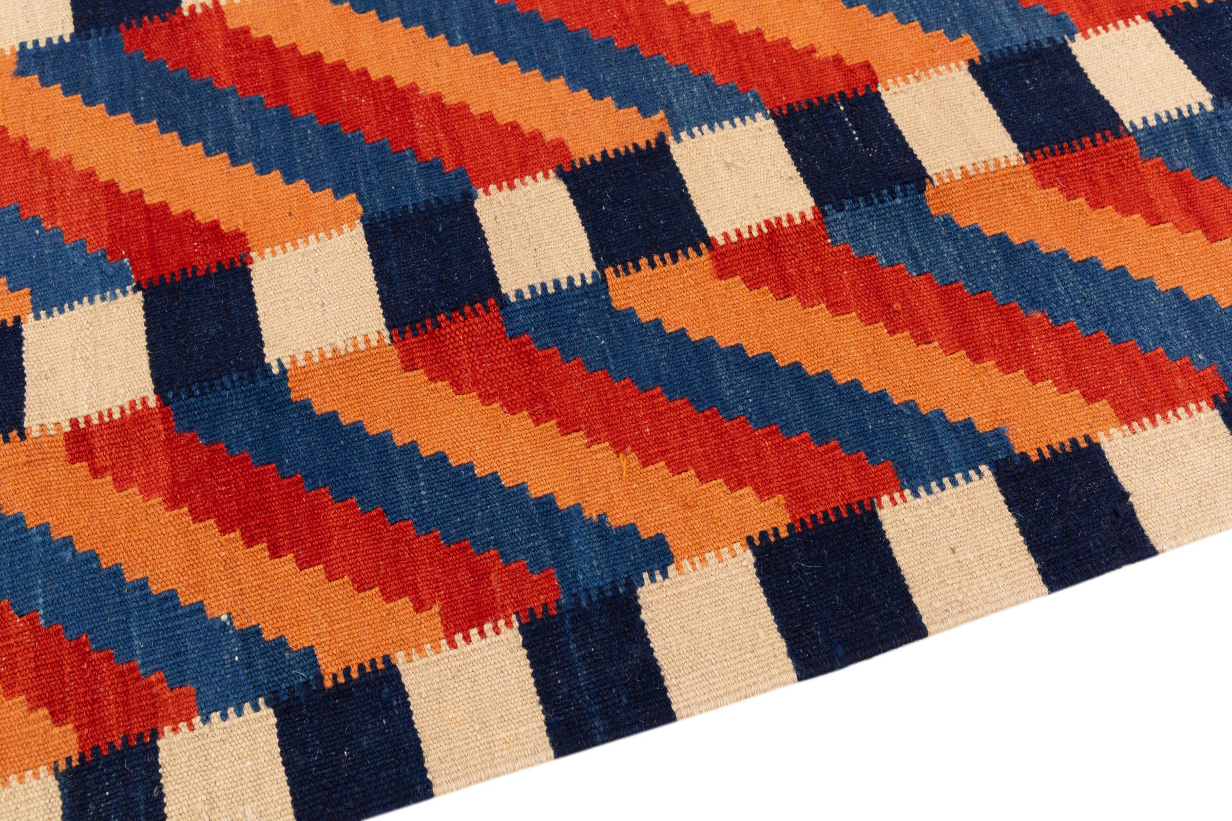 This rug was made as a flat weave by hand on a loom. Flatweave is the term used to describe rugs that have no pile. As the name promises, these rugs are woven and not knotted. This results in a flat rug with a structured surface. Flatweaves are not as soft and usually thinner than knotted rugs. At the same time they are much less complex to manufacture and can usually be laid out from both sides (front and back). Their patterns are usually geometric, which is determined by the fabric.