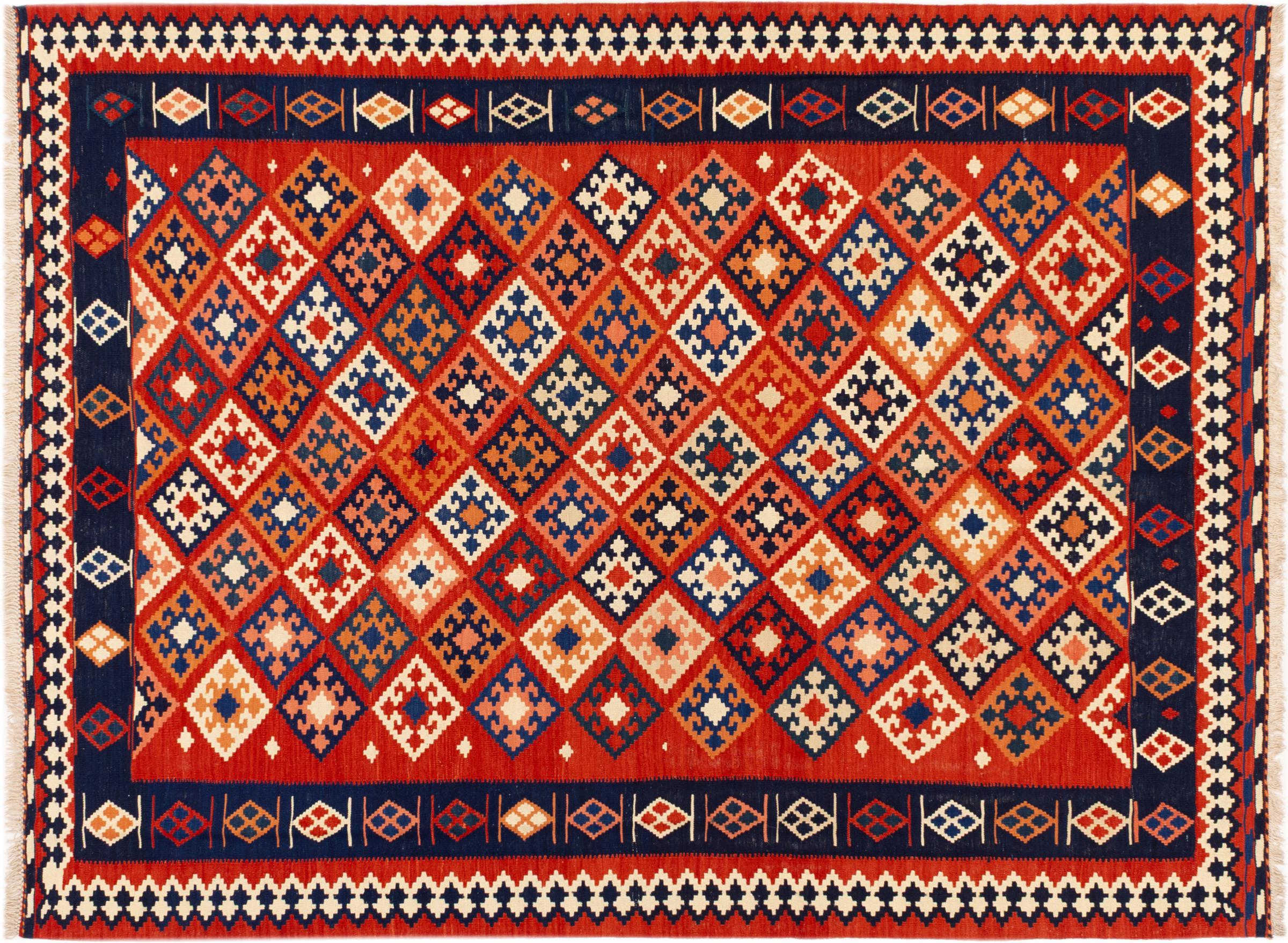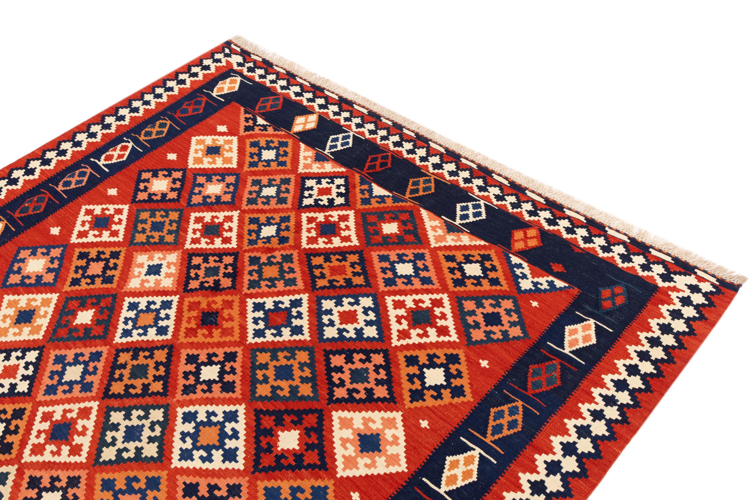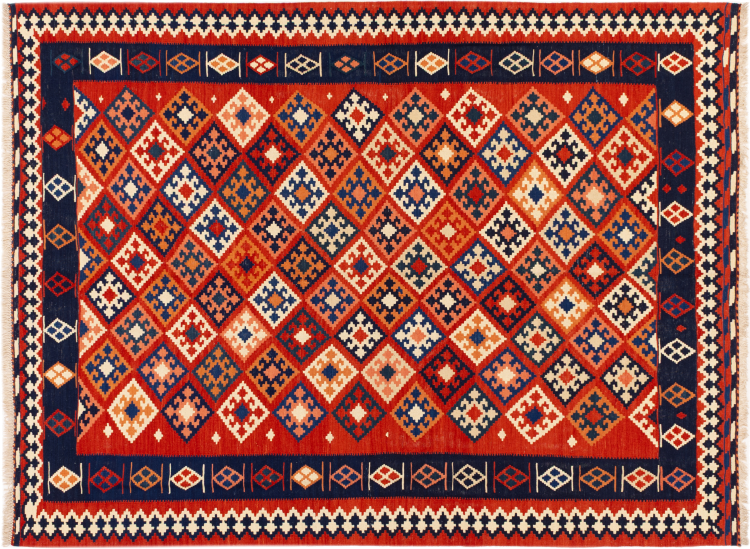 This handwoven Kilim Fars combines Persian patterns with the old tradition of flat fabrics. It represents a beautiful composition of contemporary Persian elements and a modern style. Due to the carpet's geometric patterns and its warm colours, this type of rug is extremely popular in modern interior magazines. Additionally, this Kilim can be used in many different ways. Whether you would like to use it as a bed cover or as a carpet in front of your sofa – a Kilim Fars fulfils nearly all wishes.