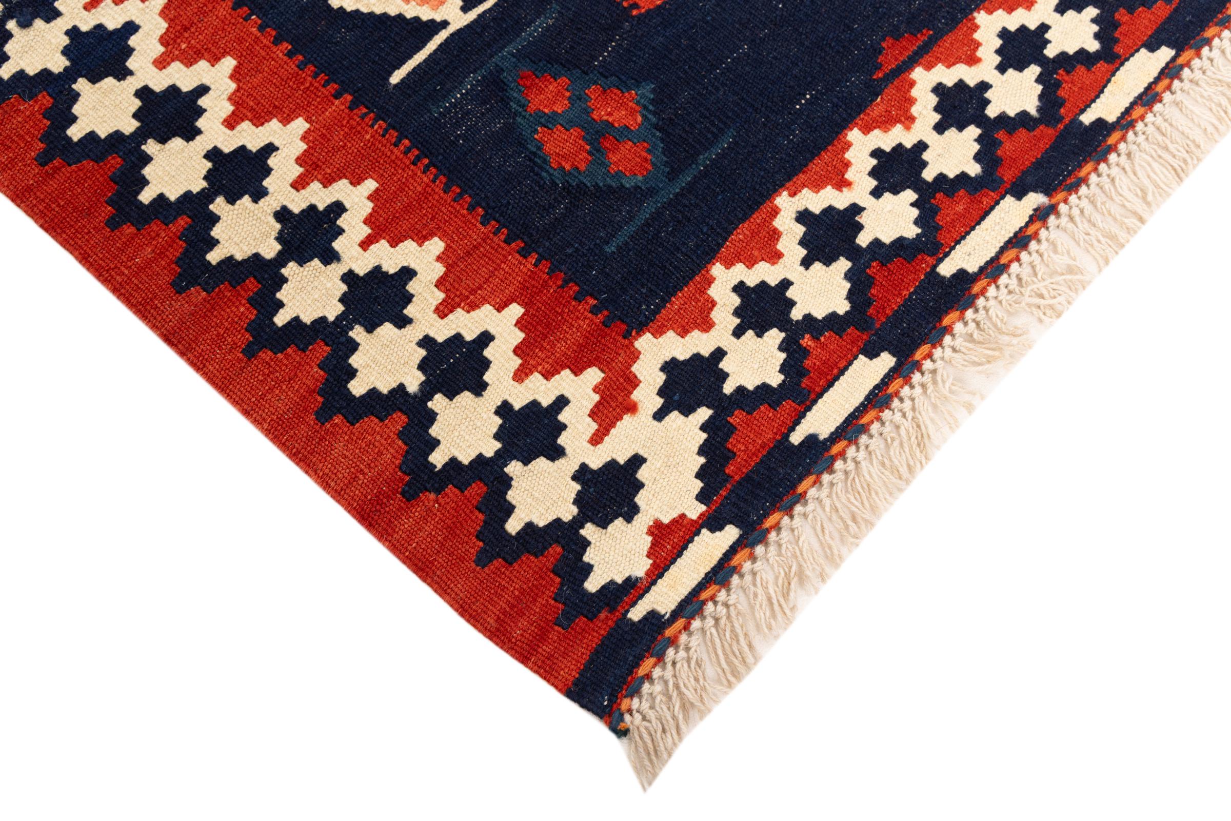 This rug was made as a flat weave by hand on a loom. Flatweave is the term used to describe rugs that have no pile. As the name promises, these rugs are woven and not knotted. This results in a flat rug with a structured surface. Flatweaves are not as soft and usually thinner than knotted rugs. At the same time they are much less complex to manufacture and can usually be laid out from both sides (front and back). Their patterns are usually geometric, which is determined by the fabric.