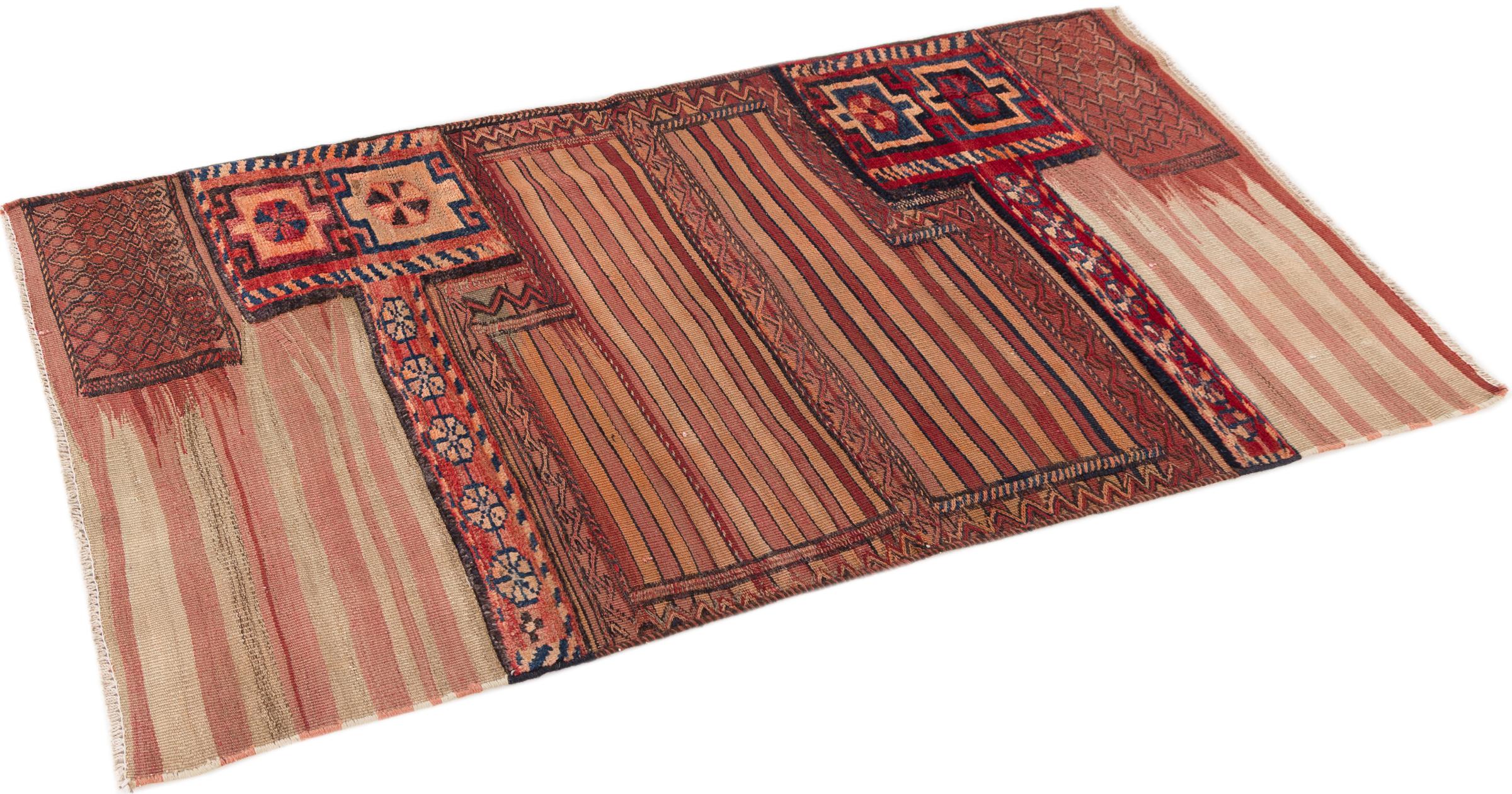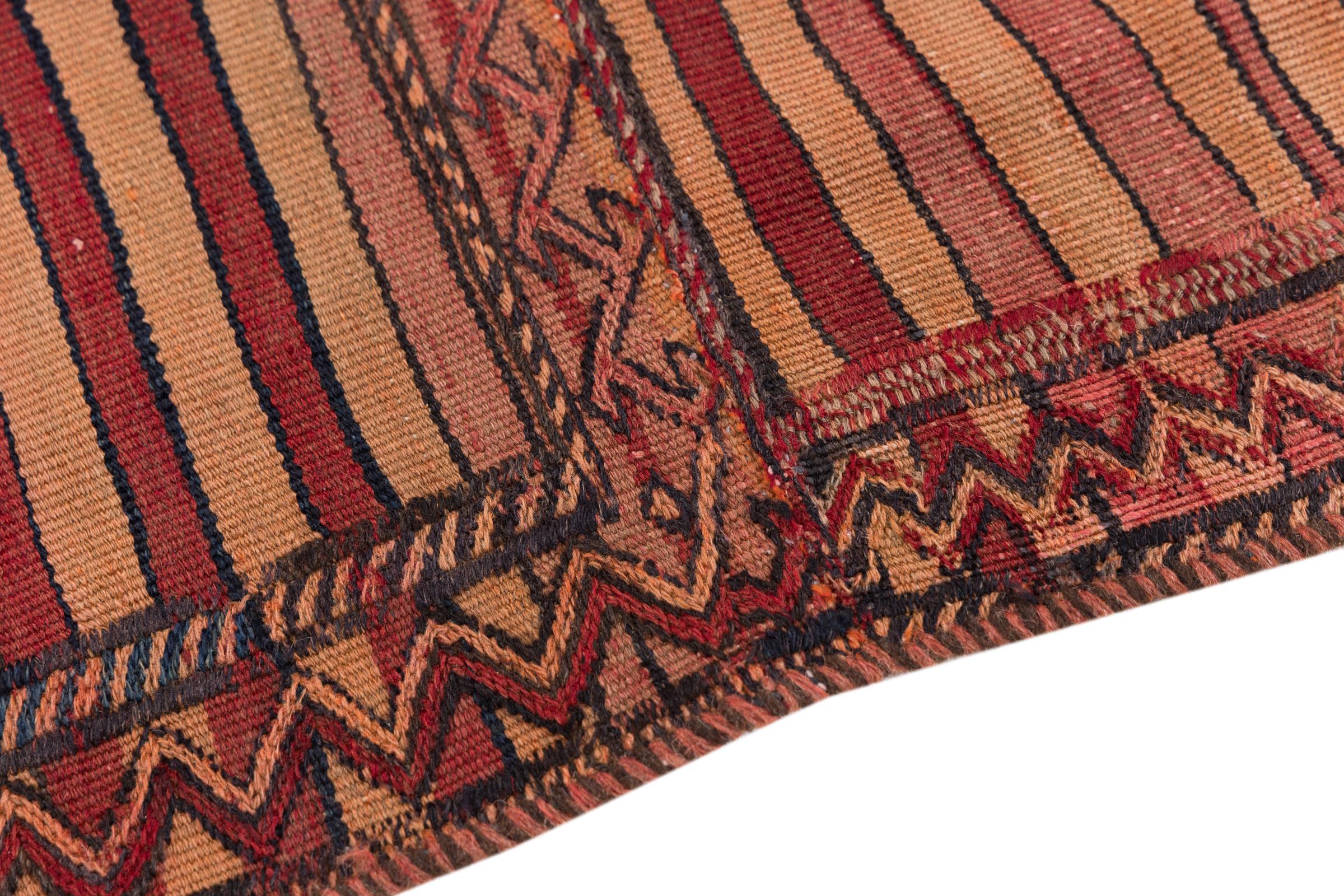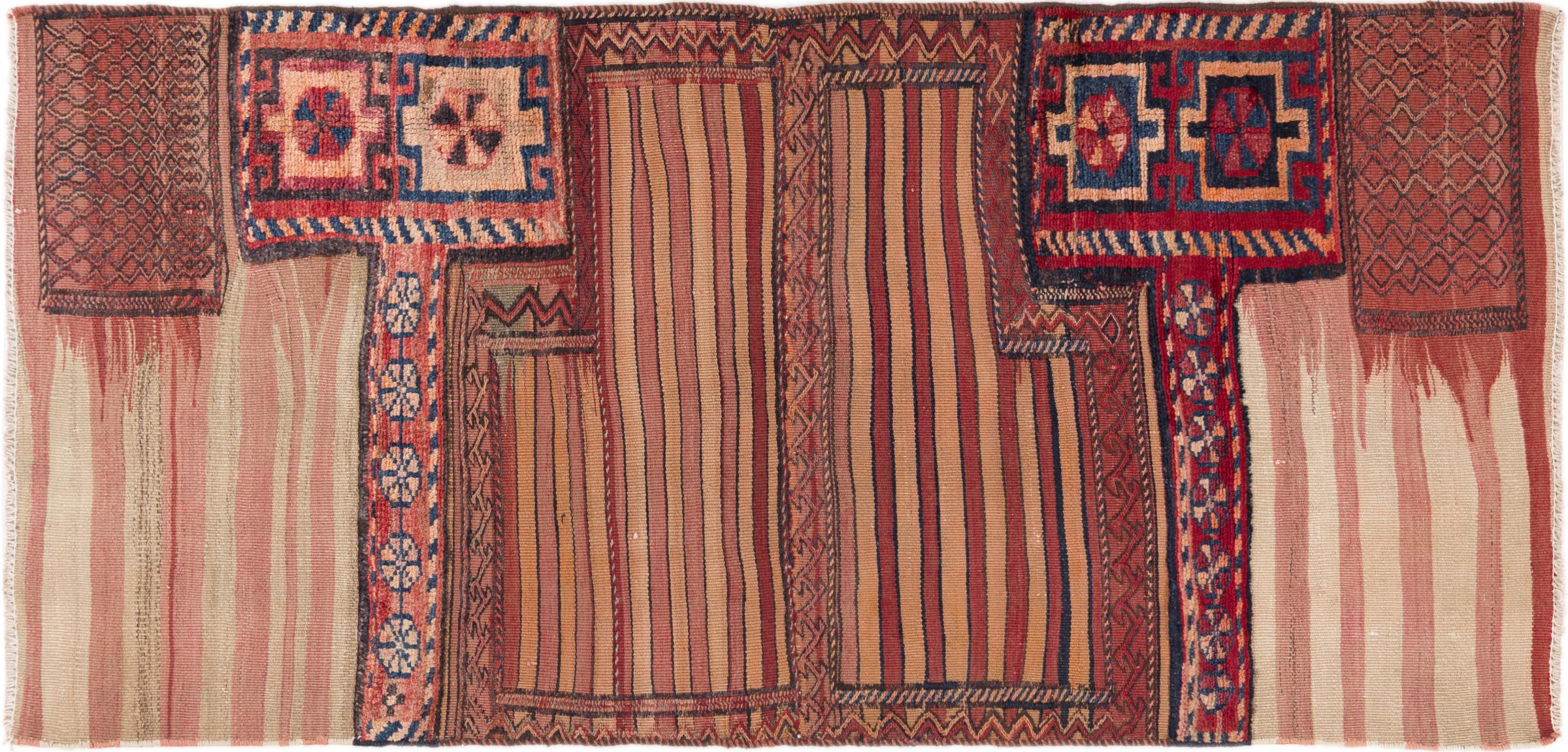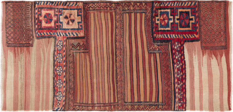 This rug was made as a flat weave by hand on a loom. Flatweave is the term used to describe rugs that have no pile. As the name promises, these rugs are woven and not knotted. This results in a flat rug with a structured surface. Flatweaves are not as soft and usually thinner than knotted rugs. At the same time they are much less complex to manufacture and can usually be laid out from both sides (front and back). Their patterns are usually geometric, which is determined by the fabric.