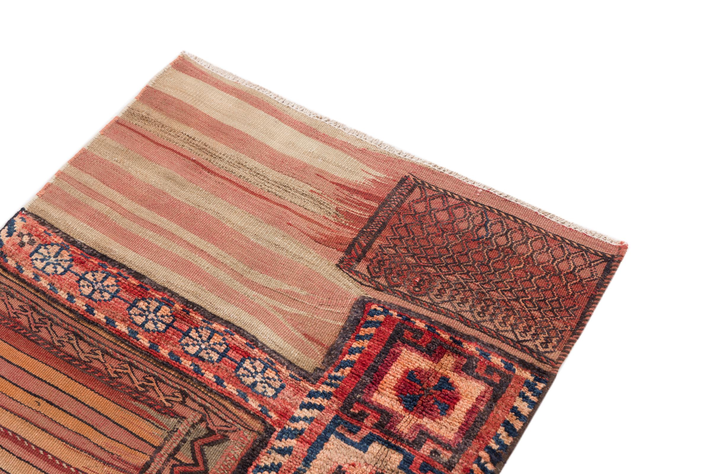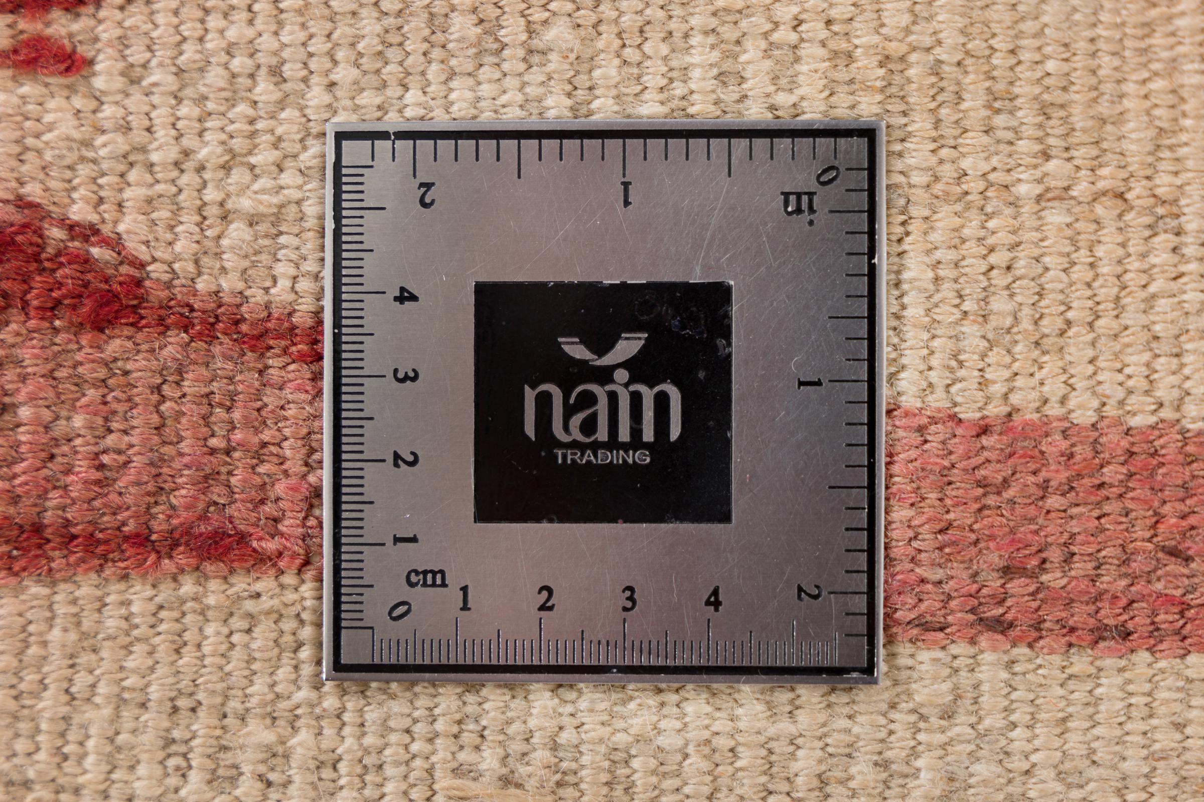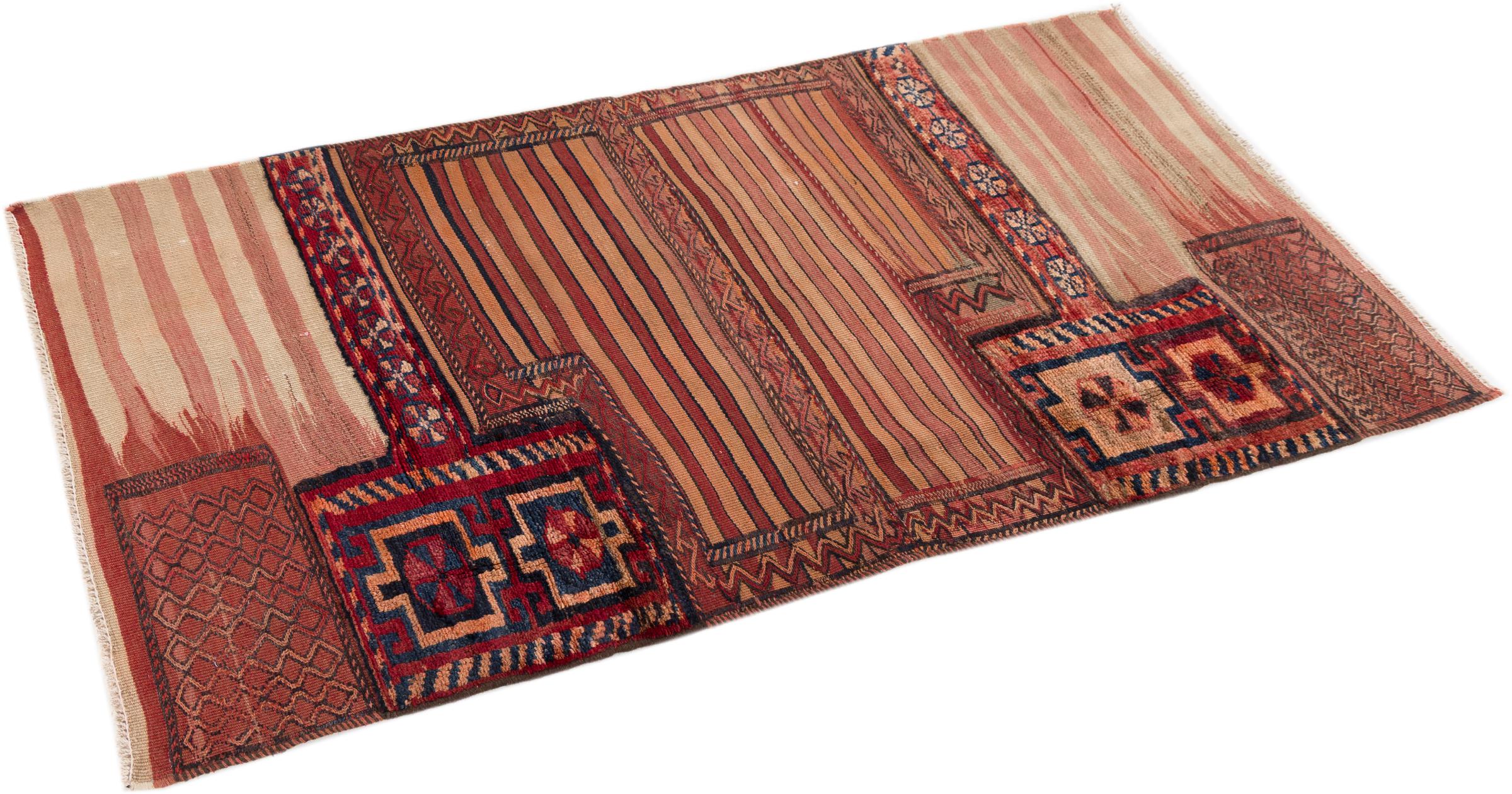 This rug was made as a flat weave by hand on a loom. Flatweave is the term used to describe rugs that have no pile. As the name promises, these rugs are woven and not knotted. This results in a flat rug with a structured surface. Flatweaves are not as soft and usually thinner than knotted rugs. At the same time they are much less complex to manufacture and can usually be laid out from both sides (front and back). Their patterns are usually geometric, which is determined by the fabric.