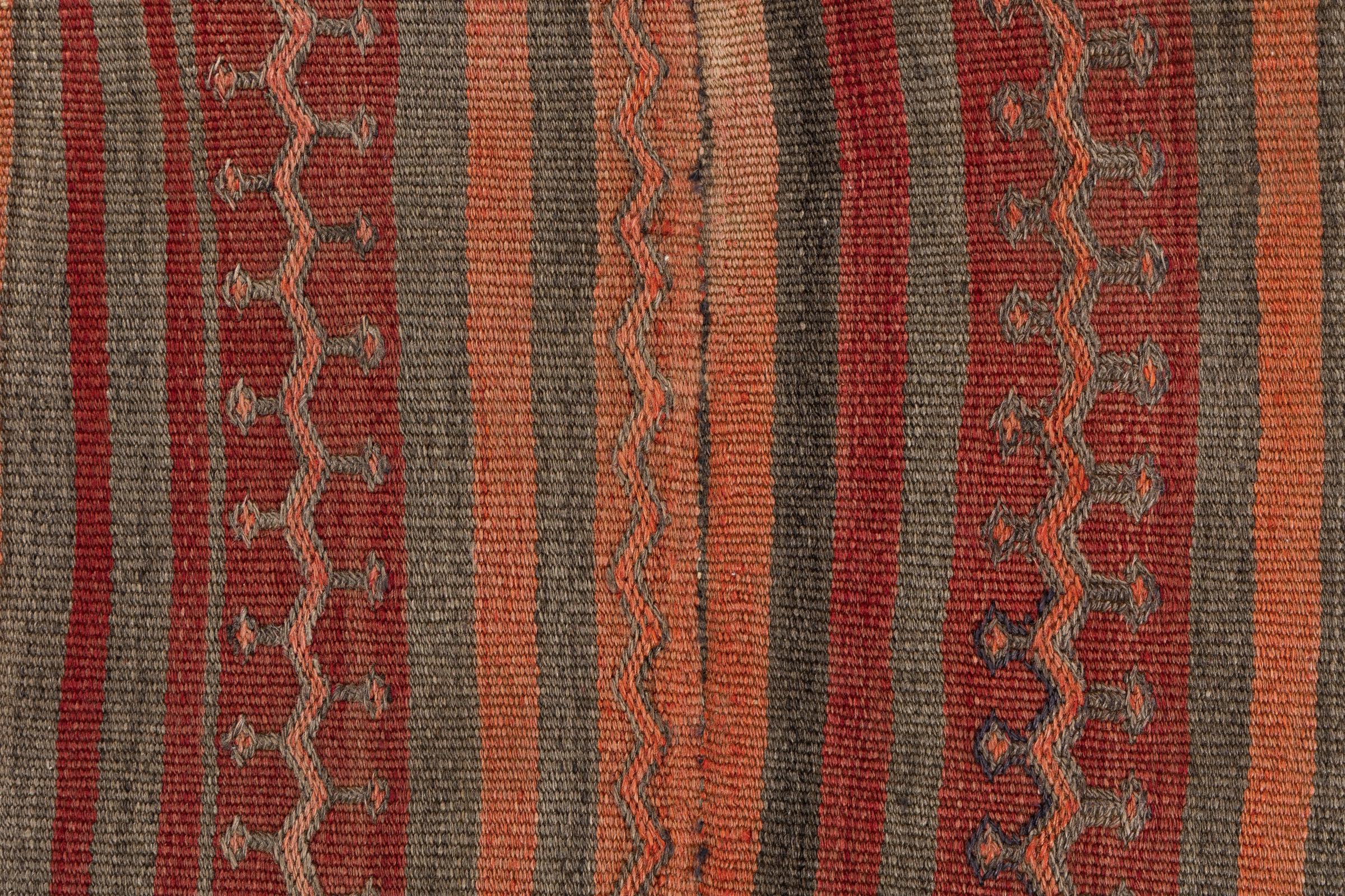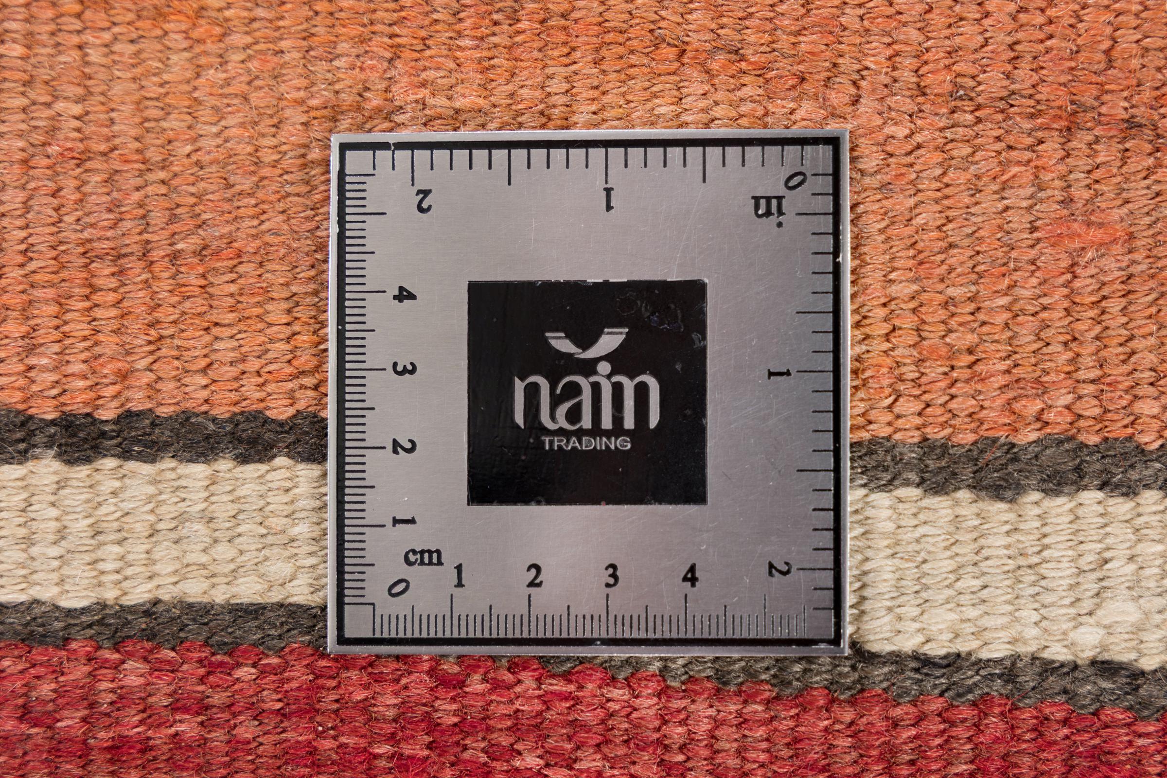 This rug was made as a flat weave by hand on a loom. Flatweave is the term used to describe rugs that have no pile. As the name promises, these rugs are woven and not knotted. This results in a flat rug with a structured surface. Flatweaves are not as soft and usually thinner than knotted rugs. At the same time they are much less complex to manufacture and can usually be laid out from both sides (front and back). Their patterns are usually geometric, which is determined by the fabric.