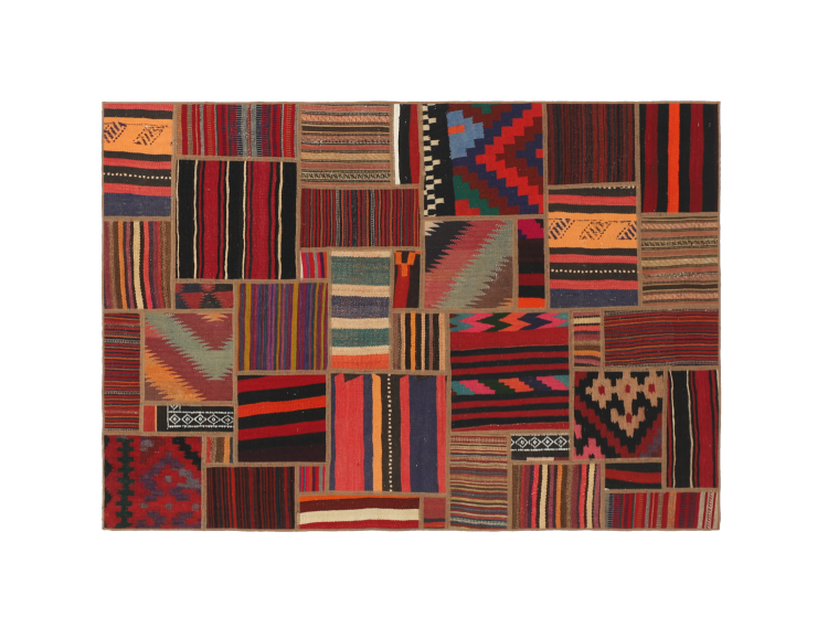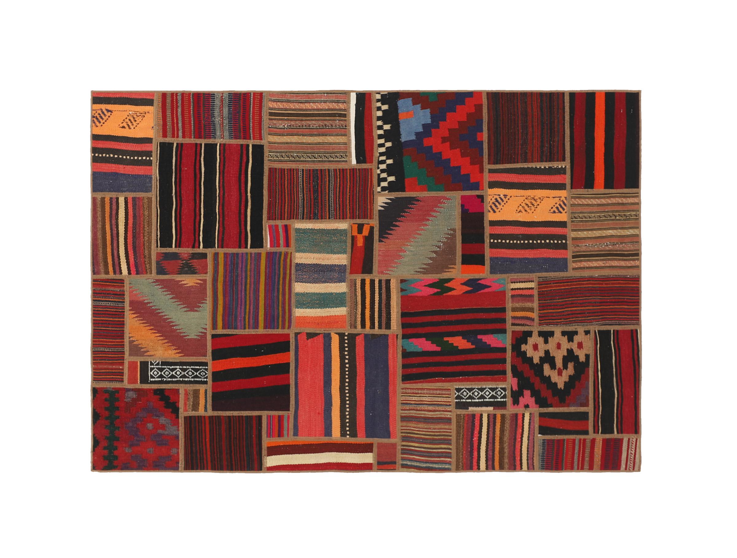 This beautiful patchwork kilim combines the fine craftsmanship of talented master carpet weavers from Iran, Afghanistan, Turkey and the Caucasus. The individual pieces of traditionally produced kilims have been cleaned, processed and assembled into a new pattern. The result is an oriental rug with a unique design in a patchwork look that is both light and robust thanks to its woven structure.