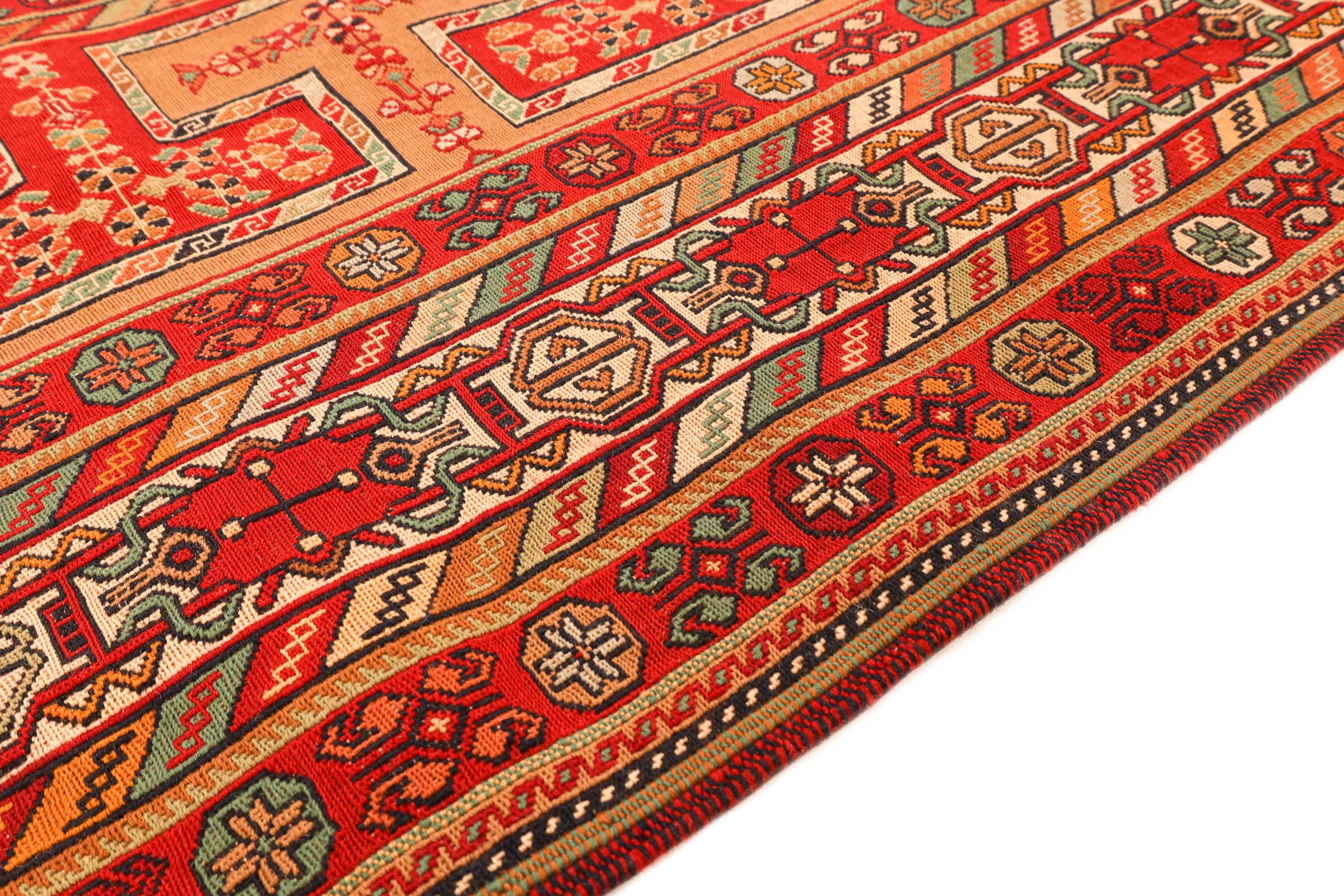 This rug was made as a flat weave by hand on a loom. Flatweave is the term used to describe rugs that have no pile. As the name promises, these rugs are woven and not knotted. This results in a flat rug with a structured surface. Flatweaves are not as soft and usually thinner than knotted rugs. At the same time they are much less complex to manufacture and can usually be laid out from both sides (front and back). Their patterns are usually geometric, which is determined by the fabric.