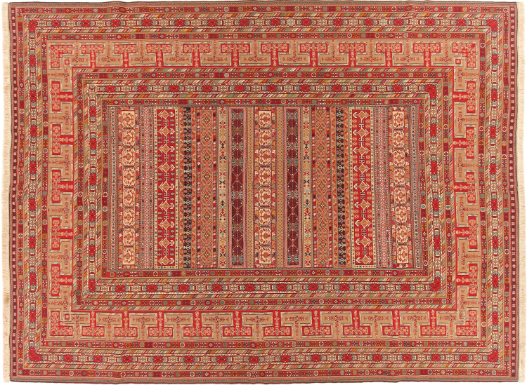 These kilim rugs show a decisive difference to hand-knotted rugs - they are woven by hand. Thus, they do not have a high pile of wool and are often flatter and rougher than knotted wool rugs. Their making is less elaborate and so they are usually much more affordable. As an advantage, kilim rugs are also much lighter and can be laid out from the front and back side. Hand-woven kilims originally come from the former Persia and are now also often made in Afghanistan. They have rather simple, straightforward patterns, which are determined by their weaving technique.