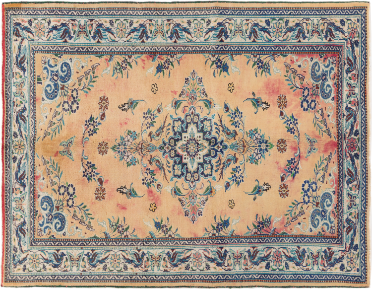 Carpet ID: 296591007986 Size: 204x158 cm Thickness: ap. 12 mm Knot density: 72 000 - 90 000 / m² Manufacturing: Knotted by hand Pile: Handspun wool Warp: Sheep wool Condition / Conservation Carpet has discoloration areas Origin: Persia Age: Old, 30-50 years Weight: ap. 10 kg Also know as Mahalat In stock: Unique - Only 1 in stock