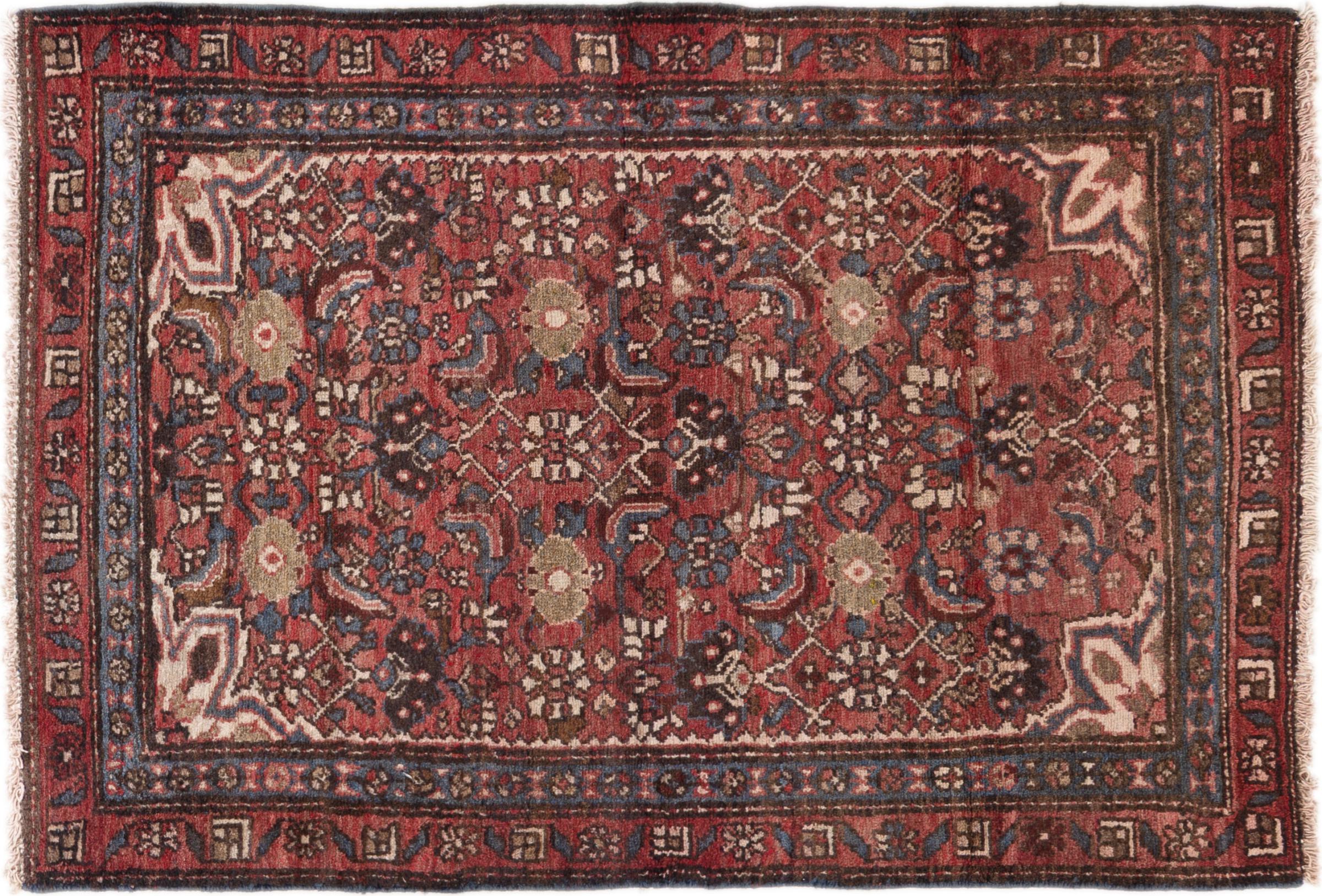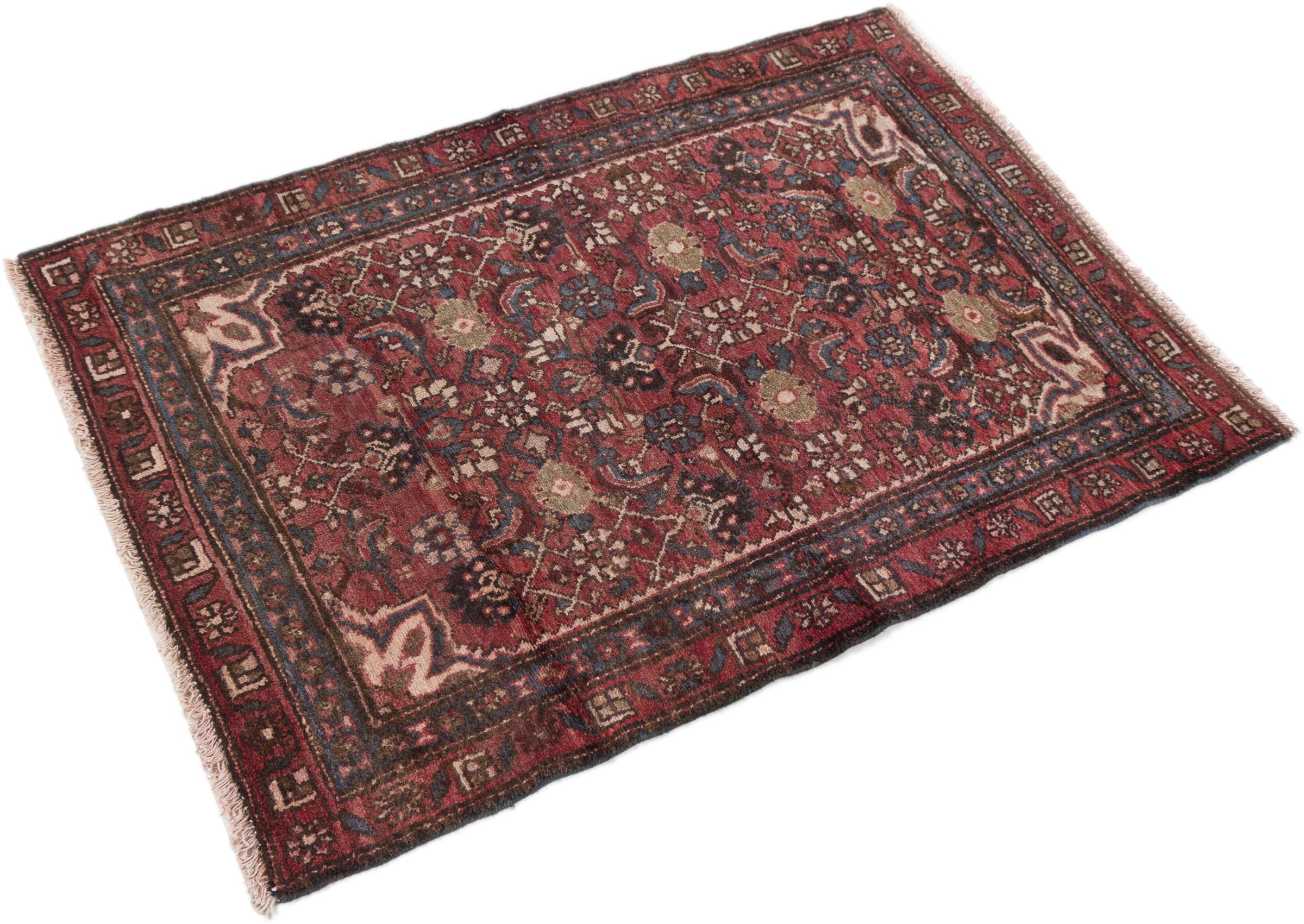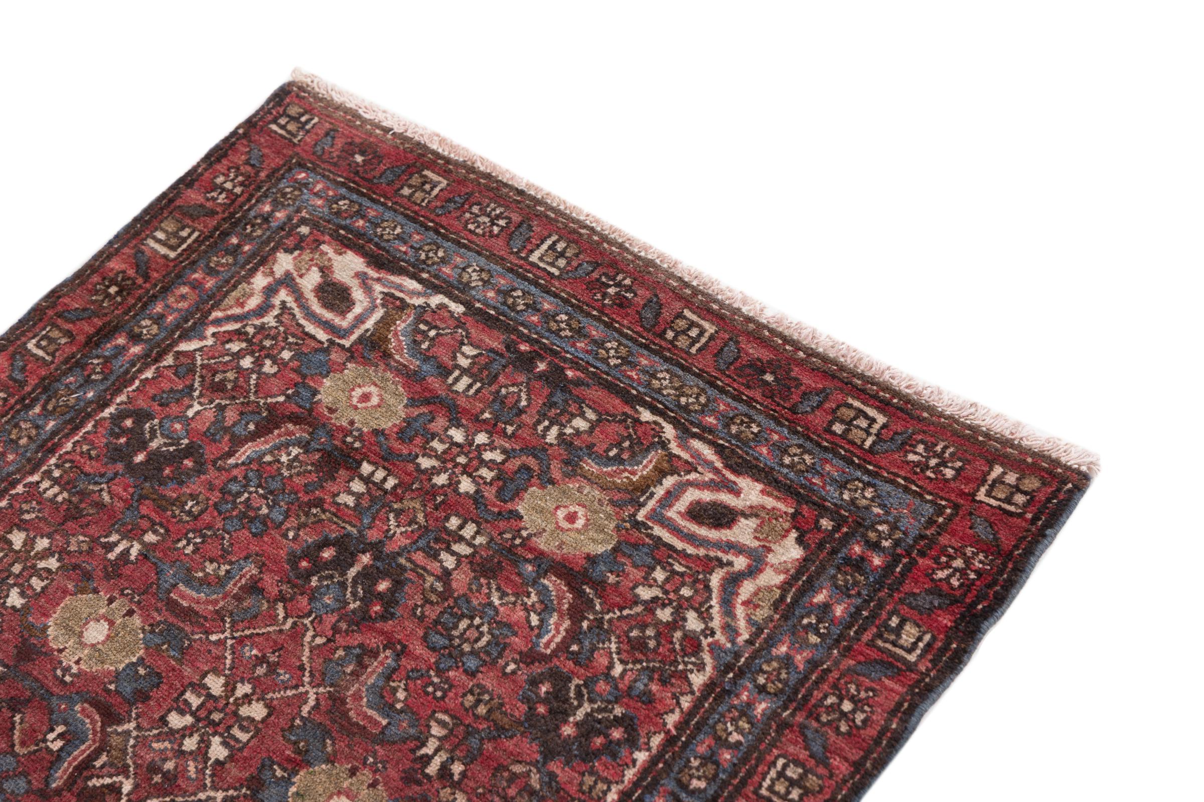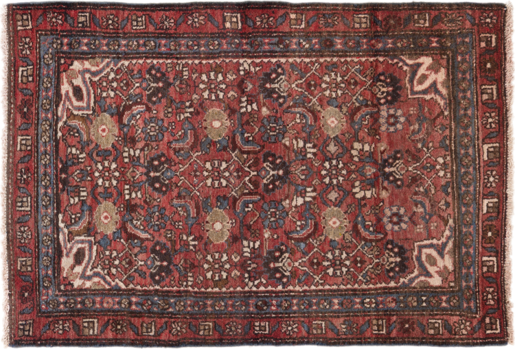 Carpet ID: 29535600599 Size: 110x80 cm Thickness: ap. 12 mm Knot density: 200 000 - 250 000 / m² Manufacturing: Knotted by hand Pile: Handspun wool Warp: Cotton Origin: Persia Age: Old/Semi antique, over 50 years Weight: ap. 3 kg Also know as Huseinabad In stock: Unique - Only 1 in stock