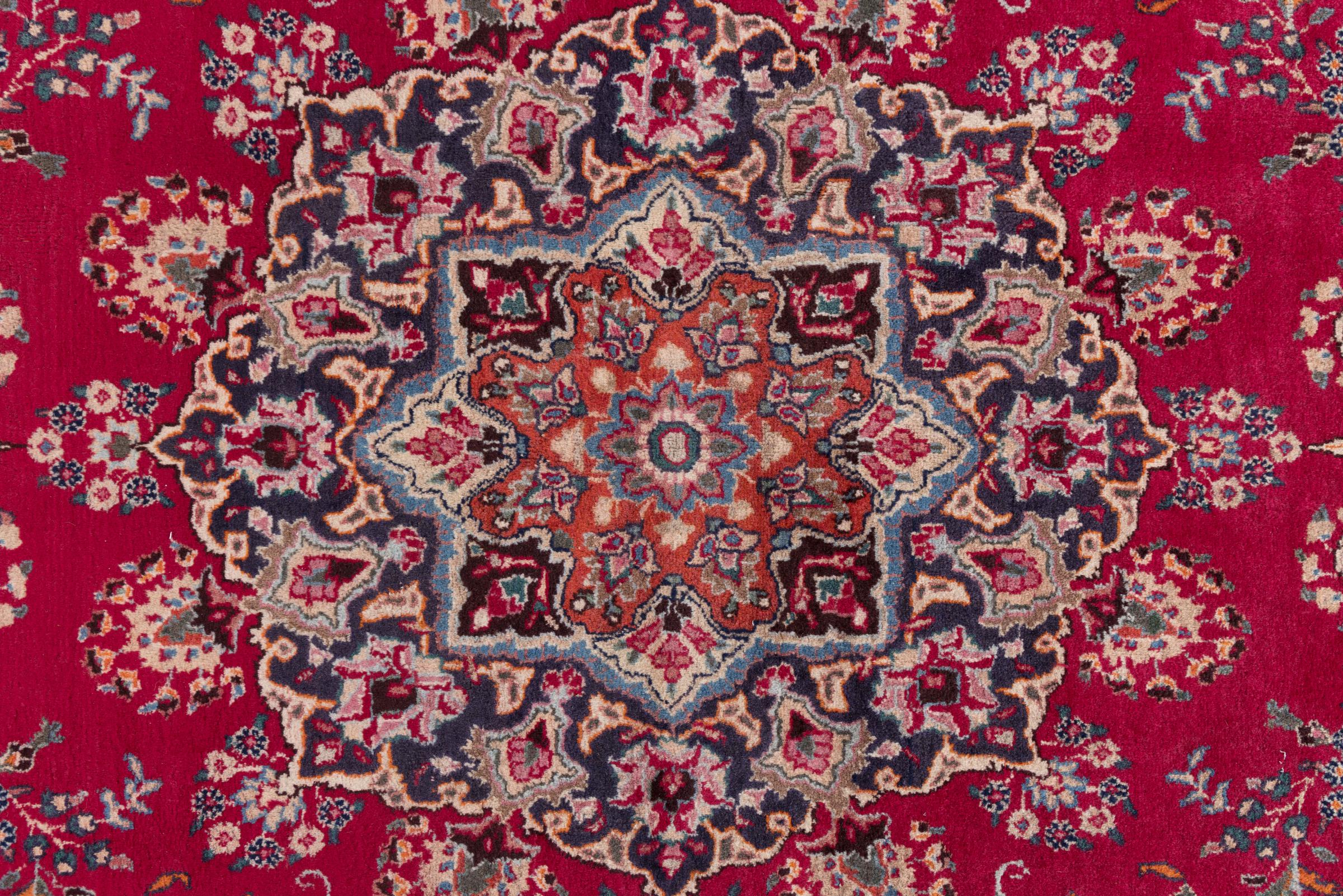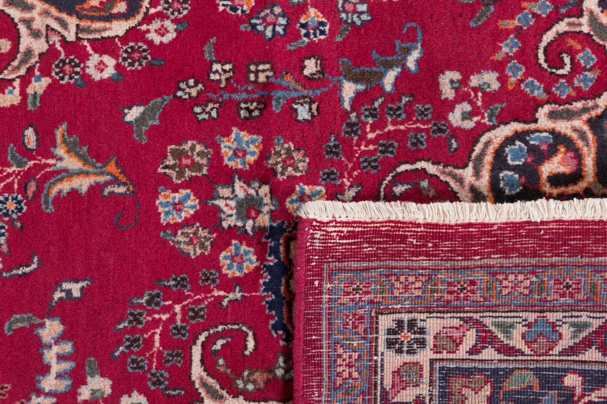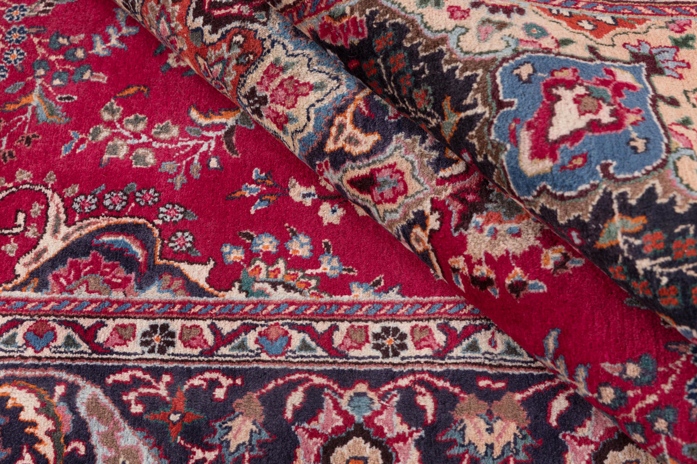 This carpet originates from Mashhad, one of the biggest cities of Iran and Persia. Mashhad carpets are known to be robust and enduring. Mostly they come in extraordinary large scales. A large genuine Persian carpet like this one requires a lot of skill and experience. Generally, it takes several months to craft such a carpet by hand in traditional handicraft.