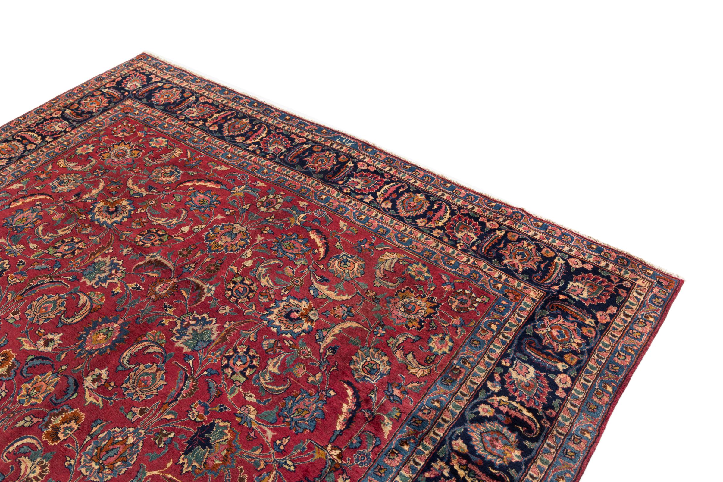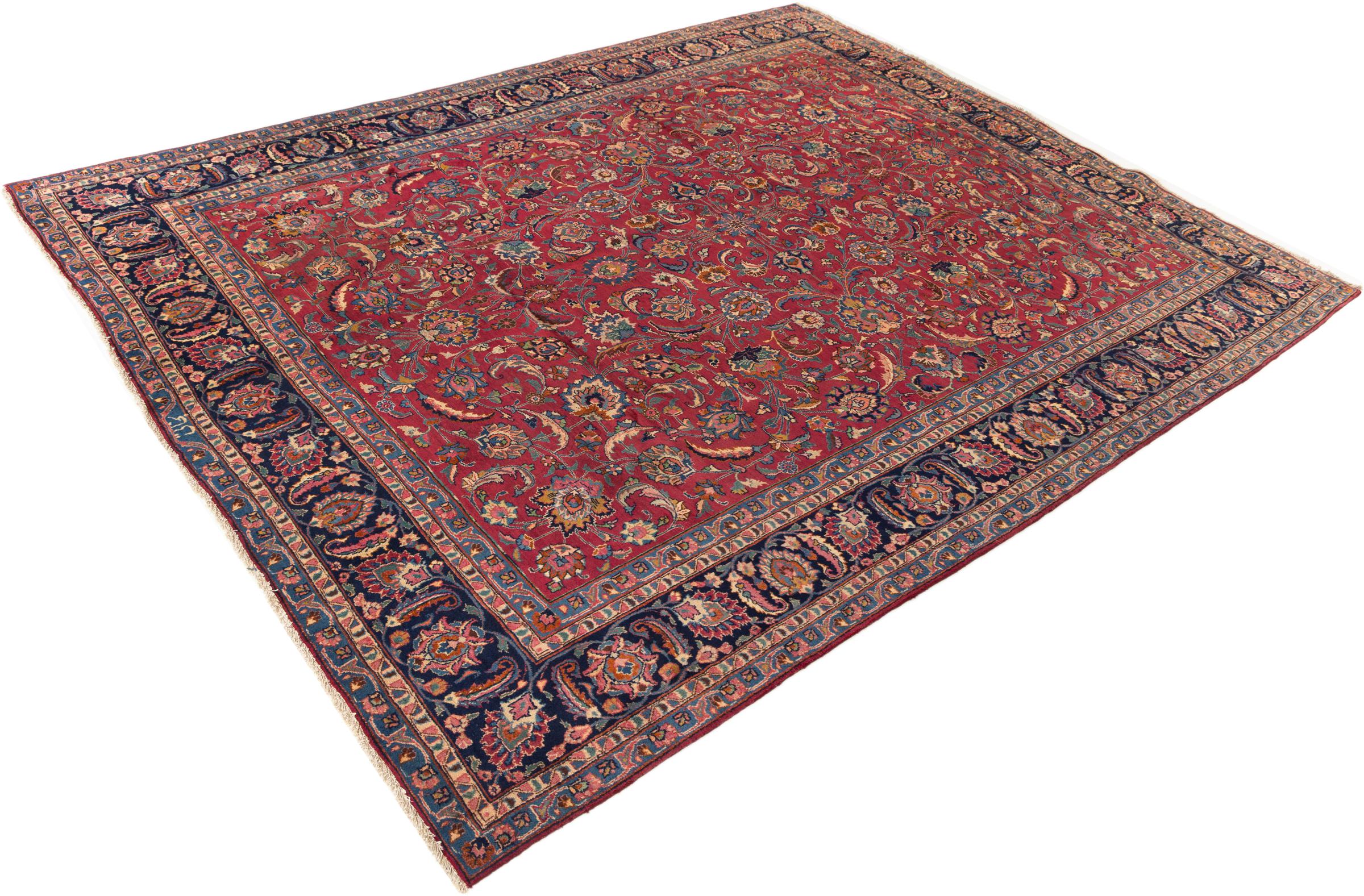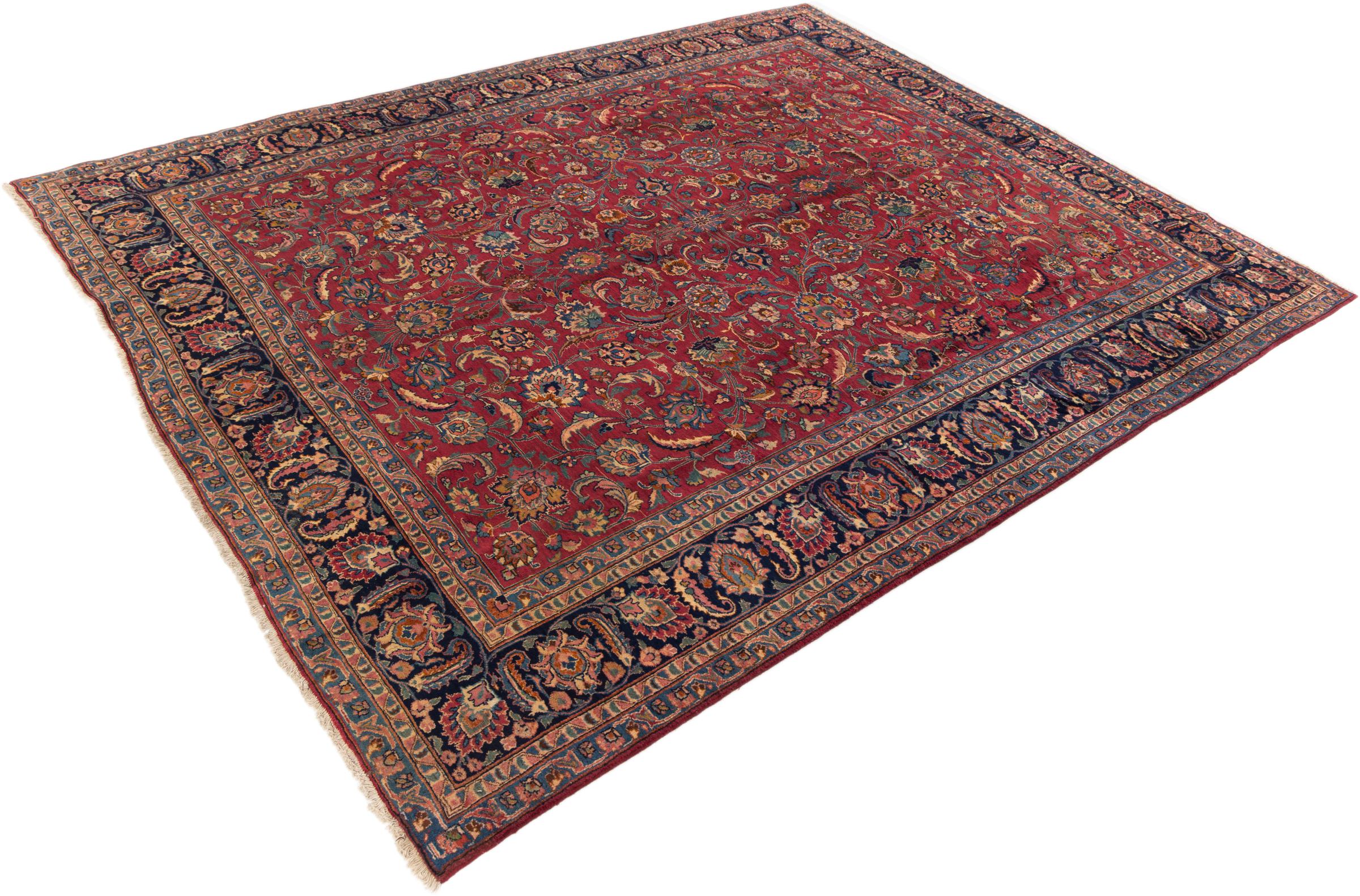 This carpet originates from Mashhad, one of the biggest cities of Iran and Persia. Mashhad carpets are known to be robust and enduring. Mostly they come in extraordinary large scales. A large genuine Persian carpet like this one requires a lot of skill and experience. Generally, it takes several months to craft such a carpet by hand in traditional handicraft.