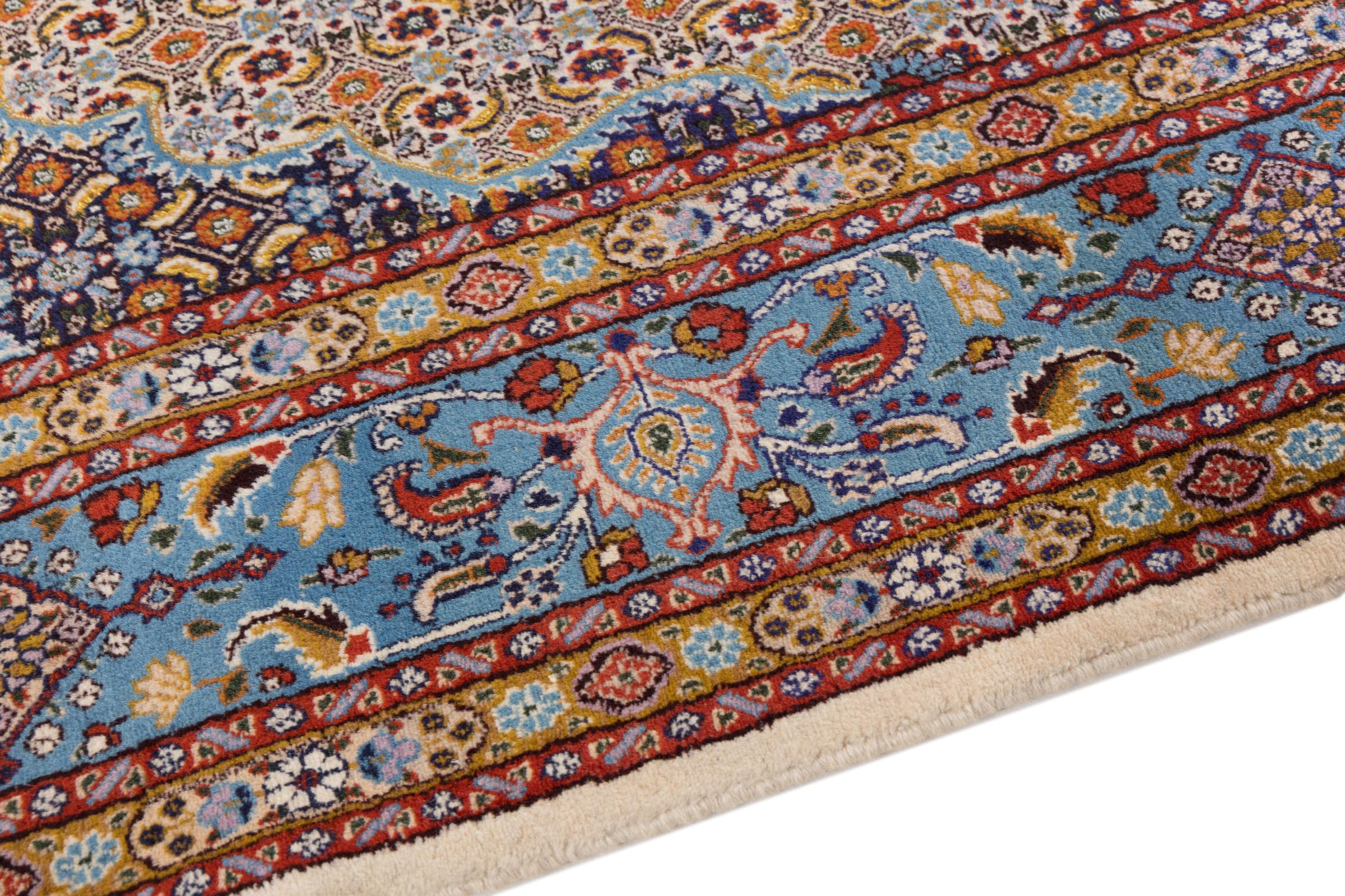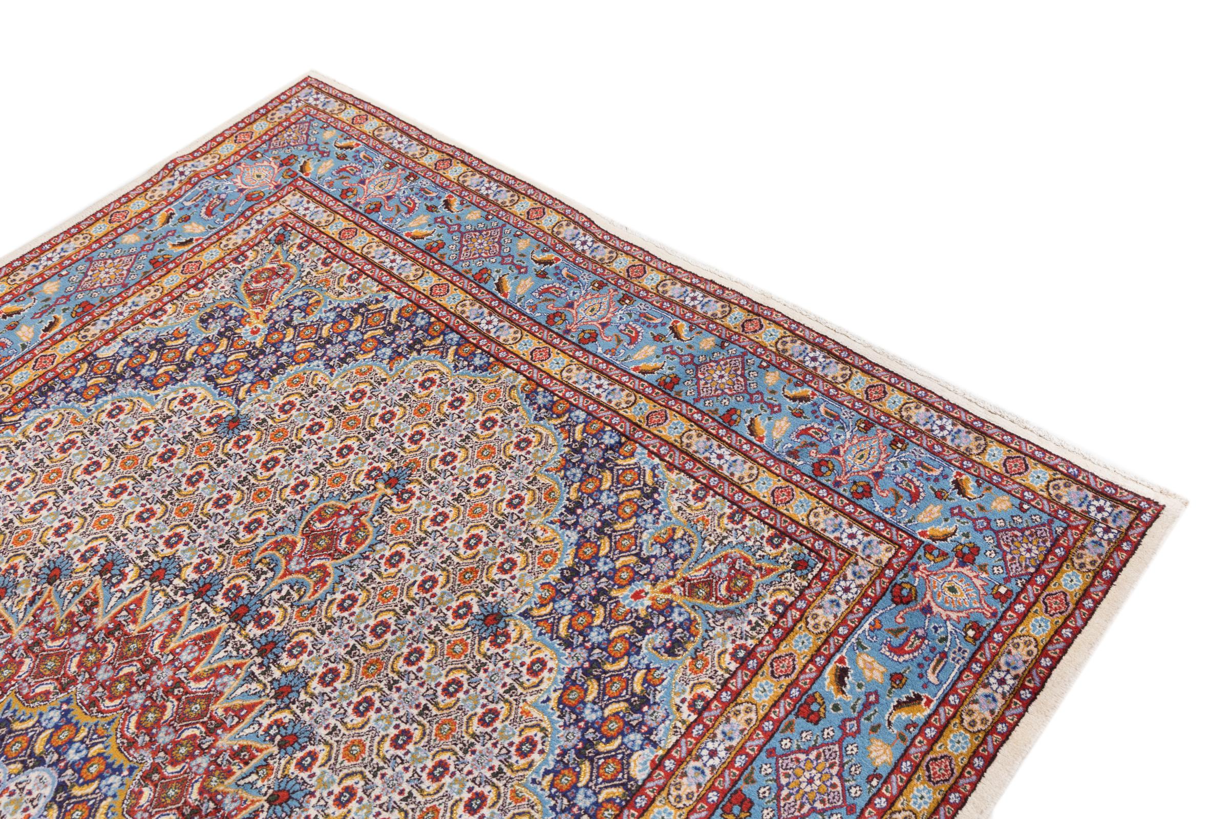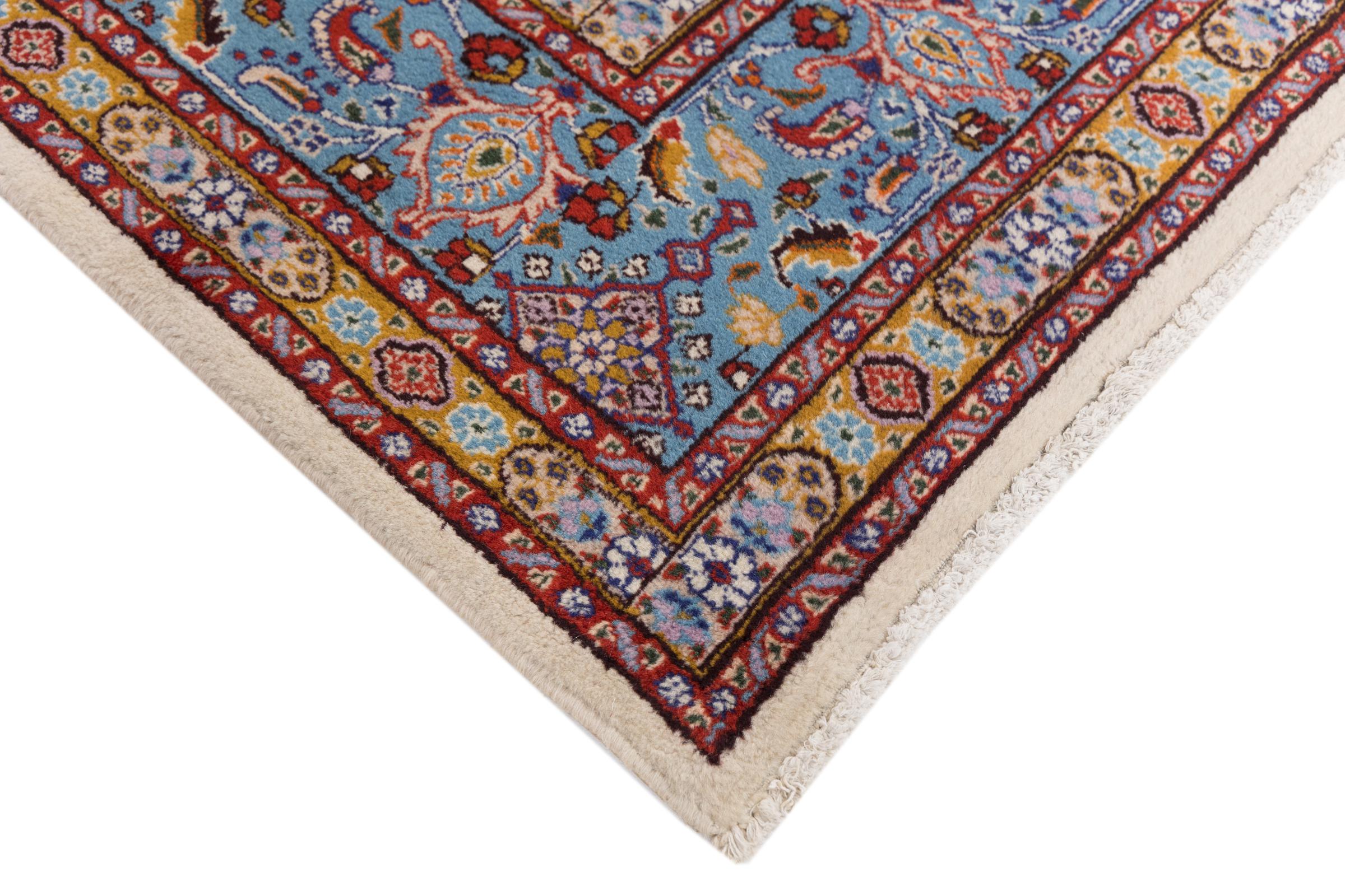 This carpet from Moud, a city 300 kilometres south of Mashhad, impresses at first glance. The typical Herati pattern or garden design is appreciated by connoisseurs and lovers of genuine Persian rugs. If you are looking for a handmade rug of fine quality with a very unique and distinctive design, this type of rug is the perfect choice.