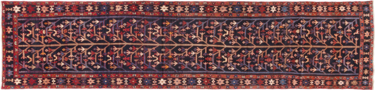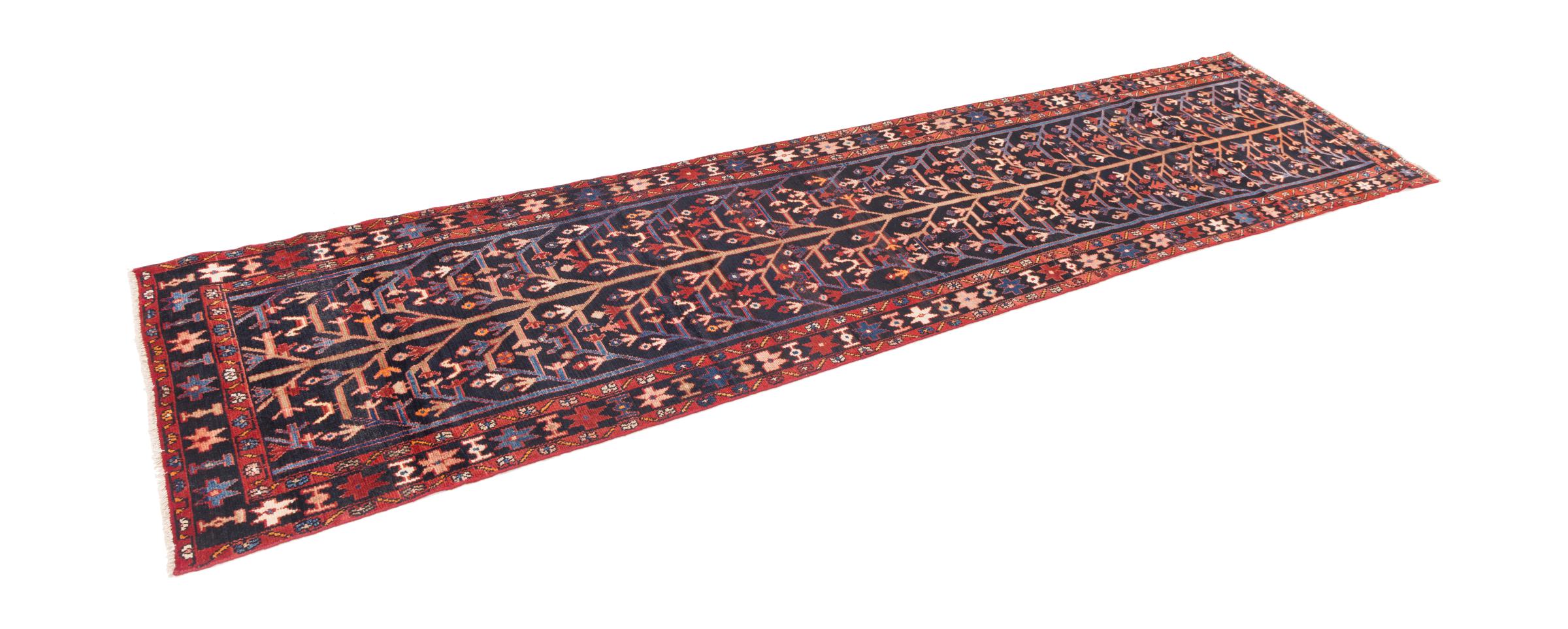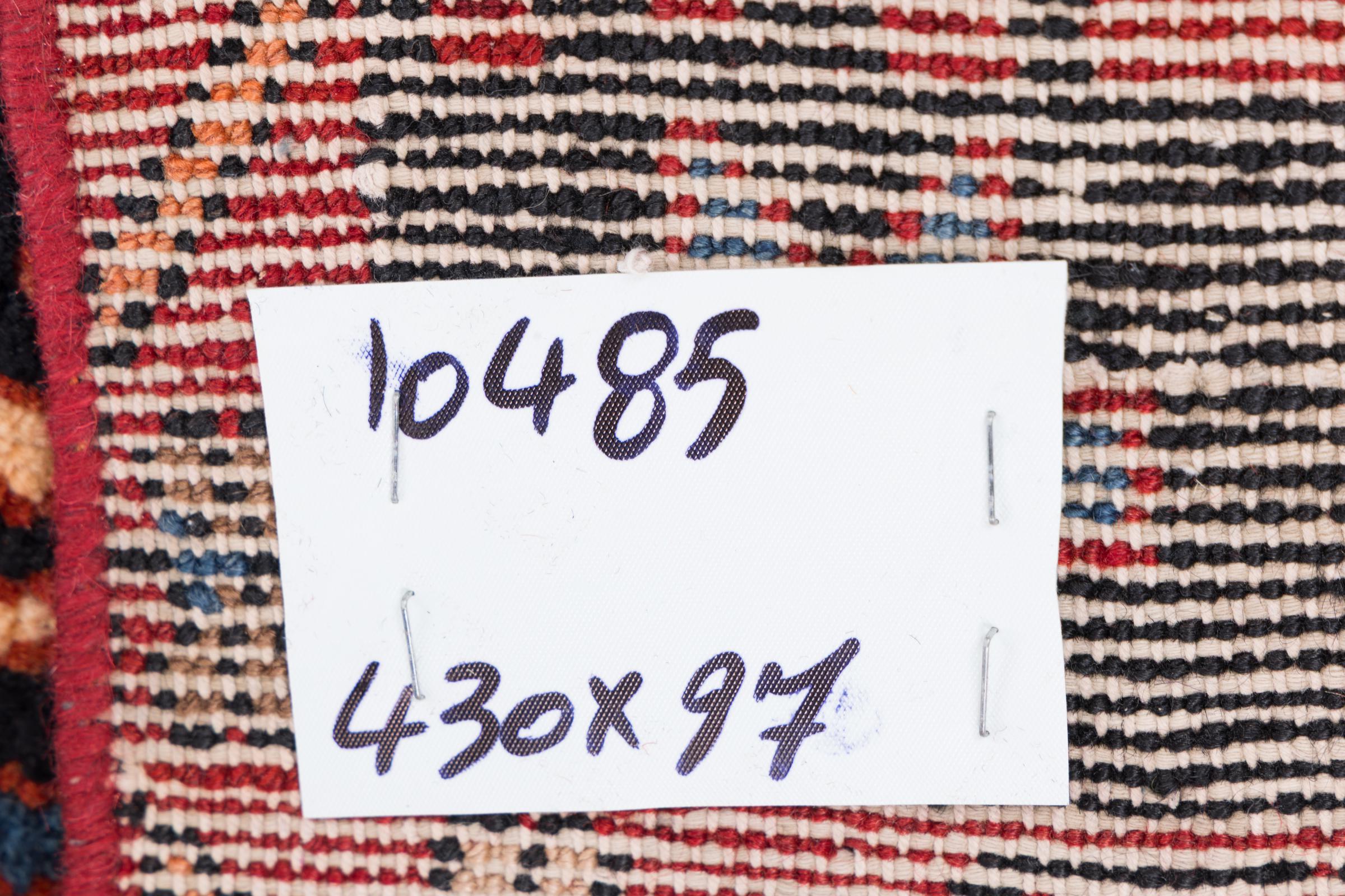 Carpet ID: 284130006047947 Size: 431x96 cm Thickness: ap. 12 mm Knot density: 200 000 - 250 000 / m² Manufacturing: Knotted by hand Pile: Handspun wool Warp: Cotton Condition / Conservation Carpet is severely and uniformly frayed Origin: Persia Age: 30-50 years (New) Weight: ap. 14 kg In stock: Unique - Only 1 in stock