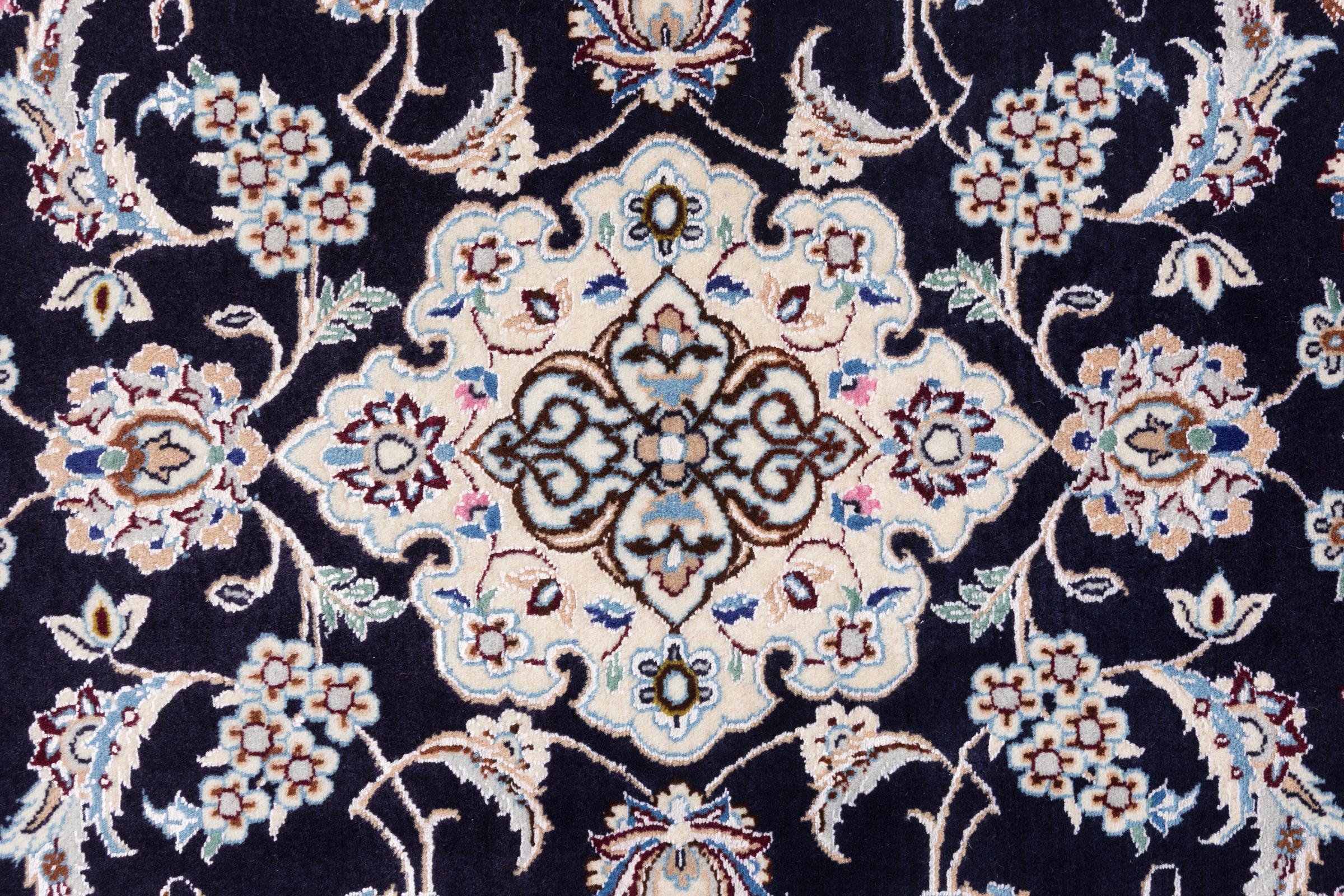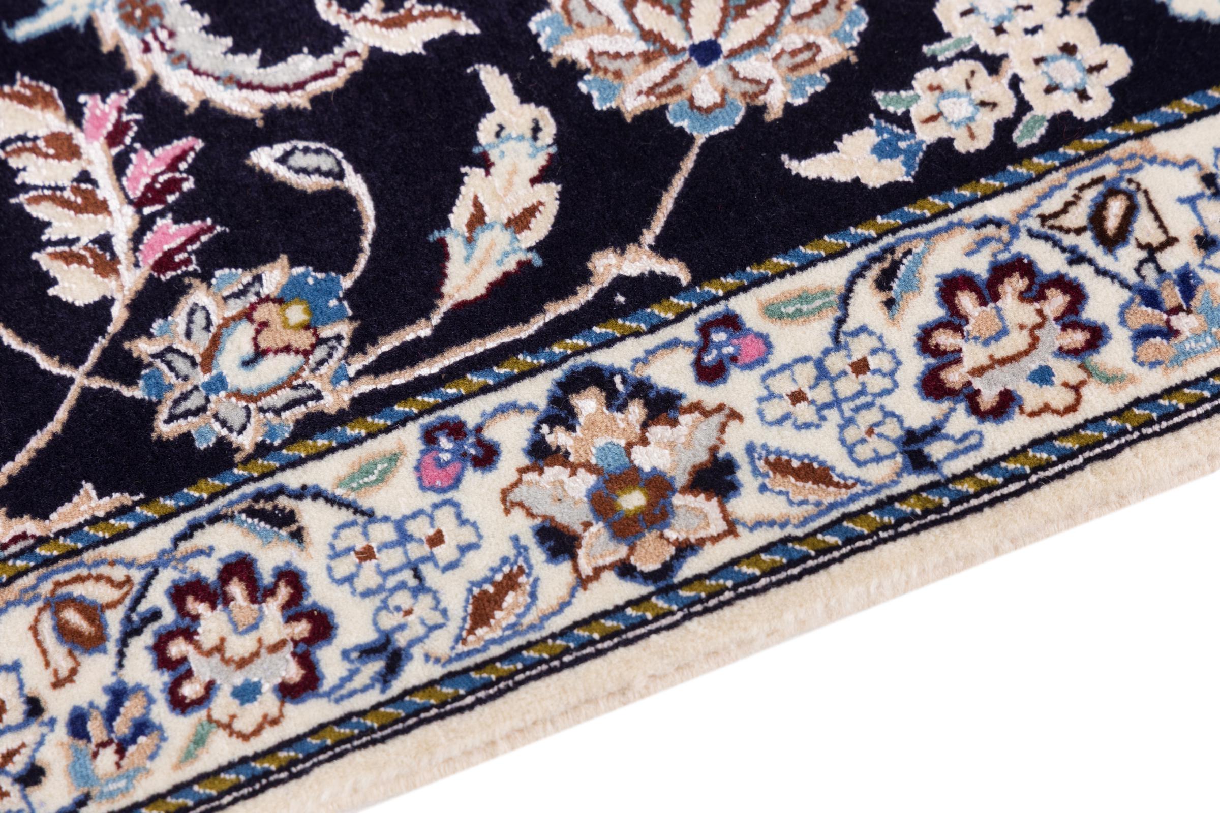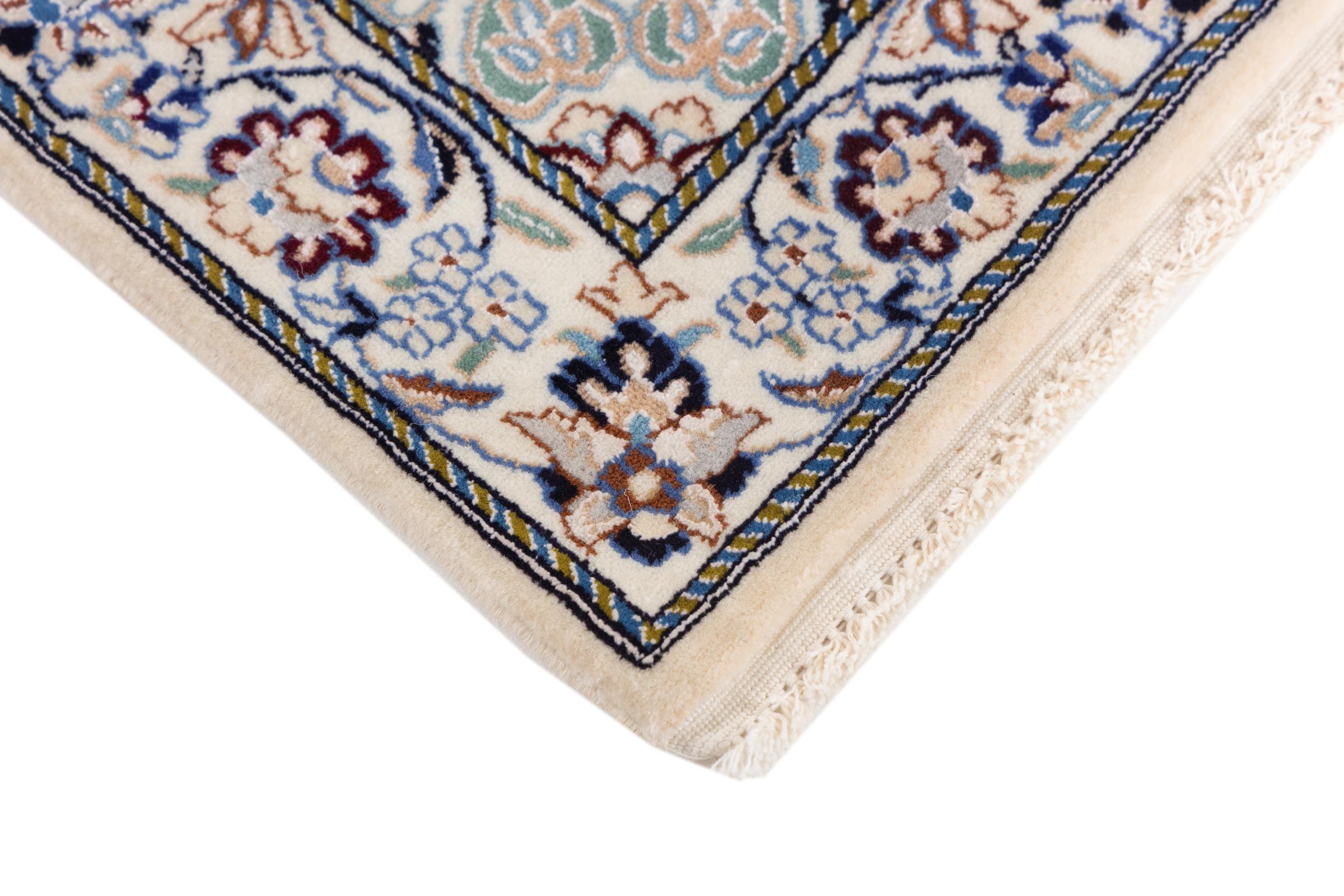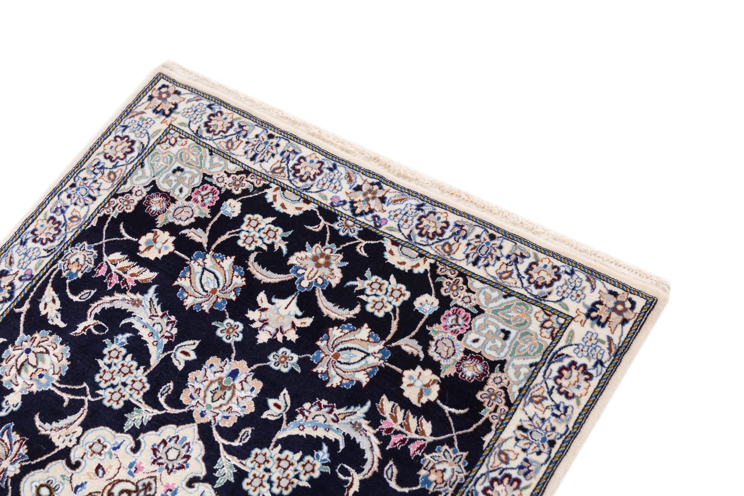 This Nain rug combines quality, tradition and an unmistakable design. It was hand-knotted from high-quality cork wool and natural silk in the desert town of the same name, Nain. Lovers of valuable rugs from Iran will love this Persian rug. With Nain rugs in the 6La and 4La classifications, you have a real work of art with an incredible level of detail that you can really lose yourself in. Nain 4La rugs are almost impossible to find today, as they are extremely elaborate to produce.