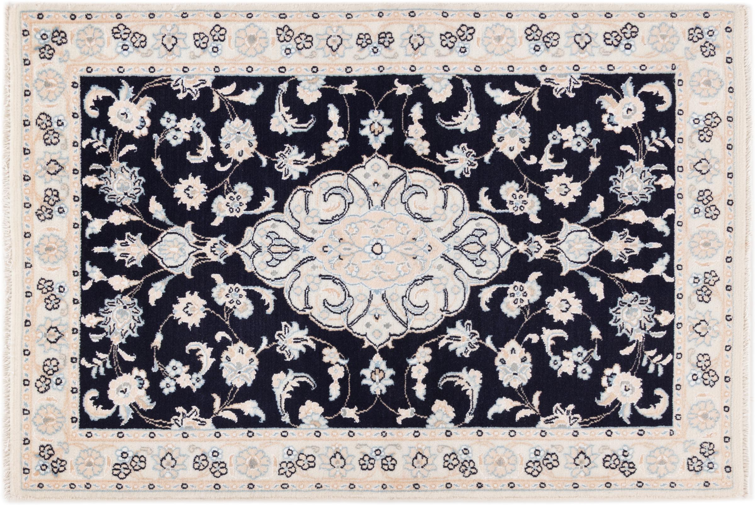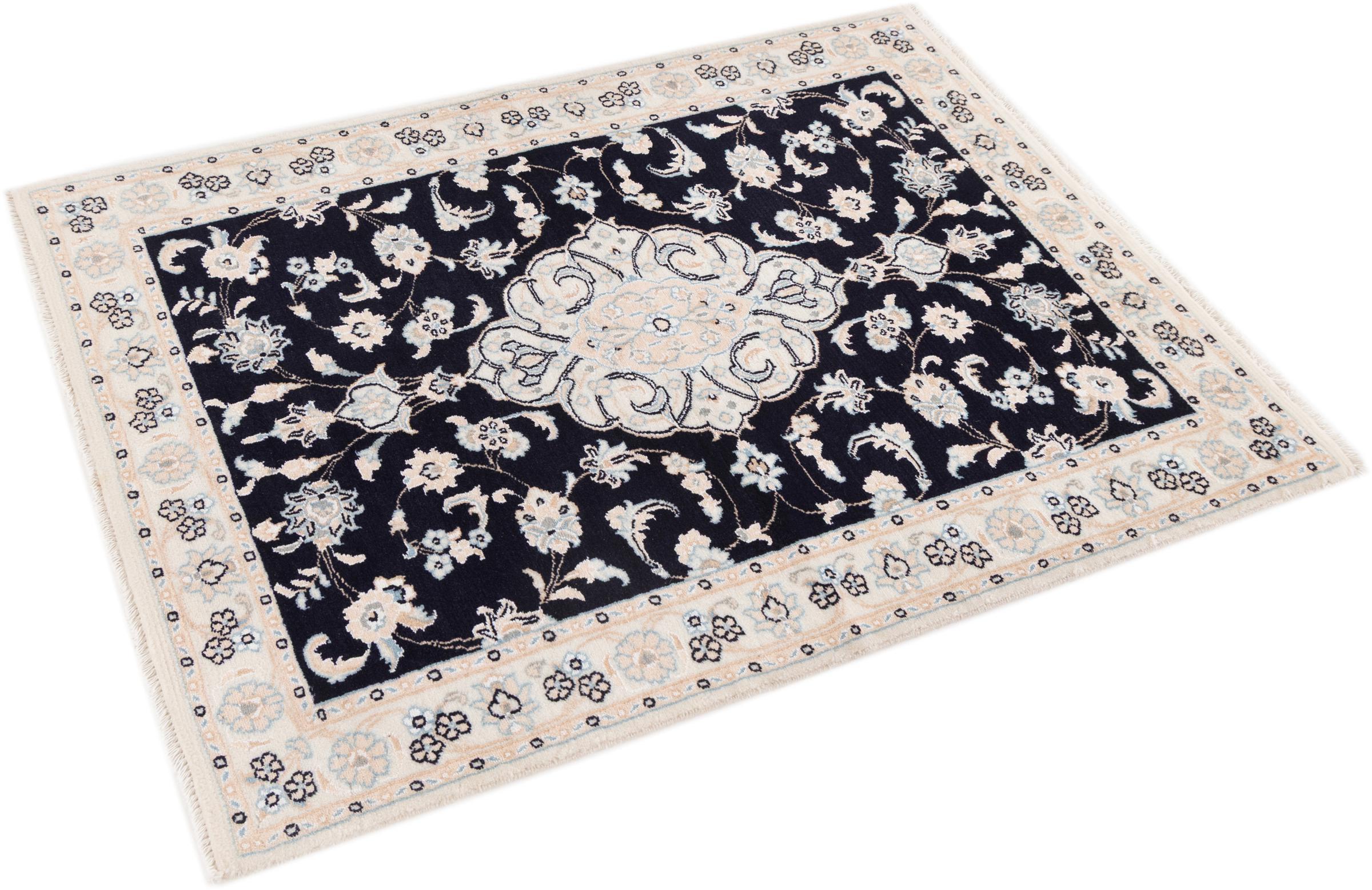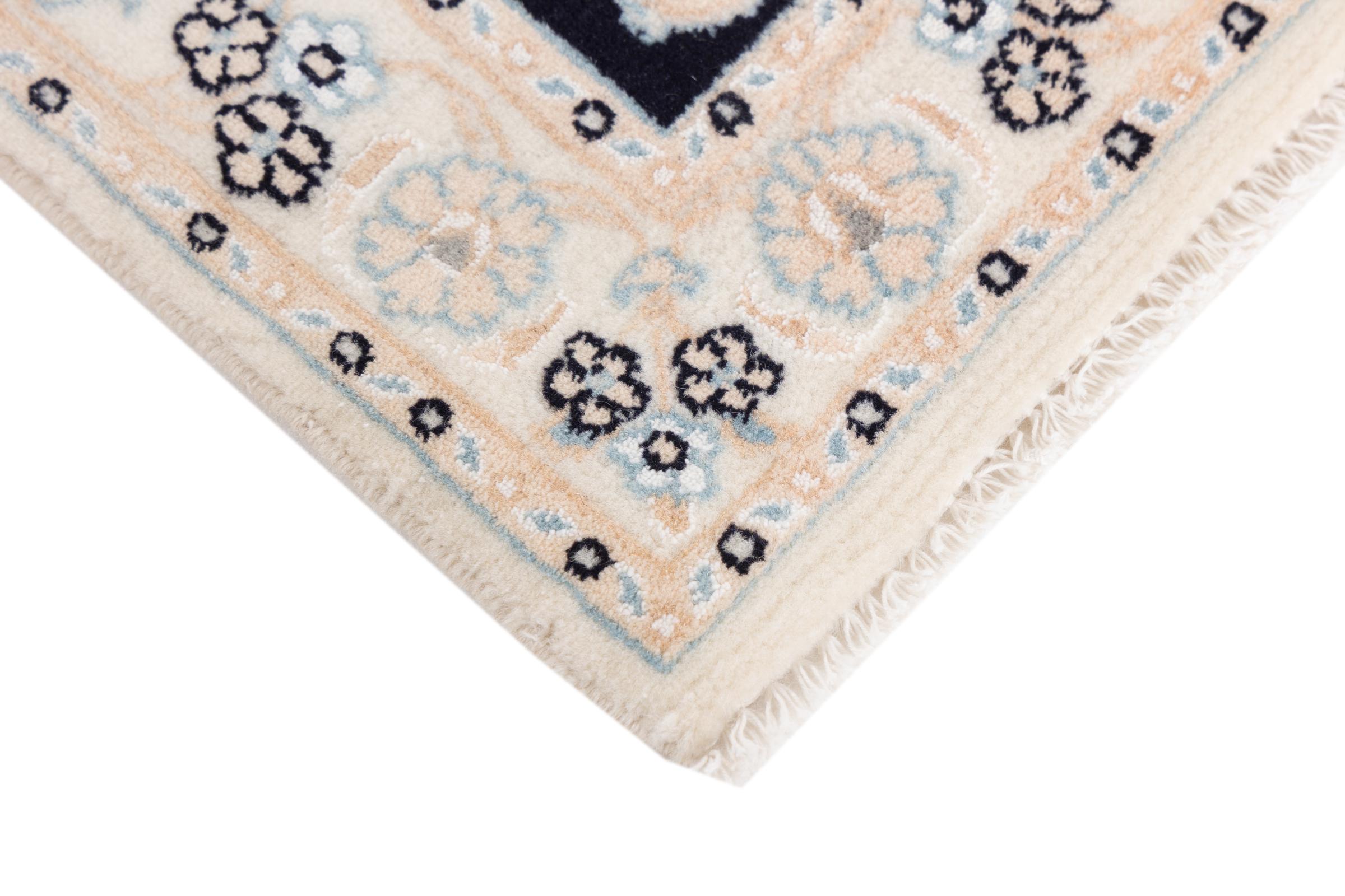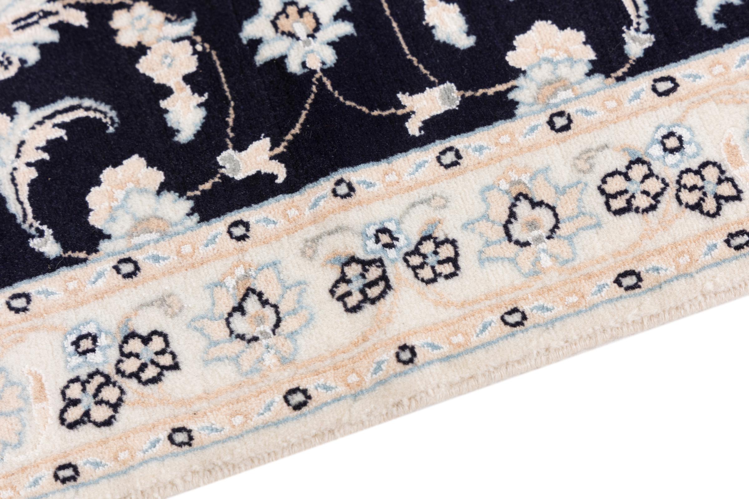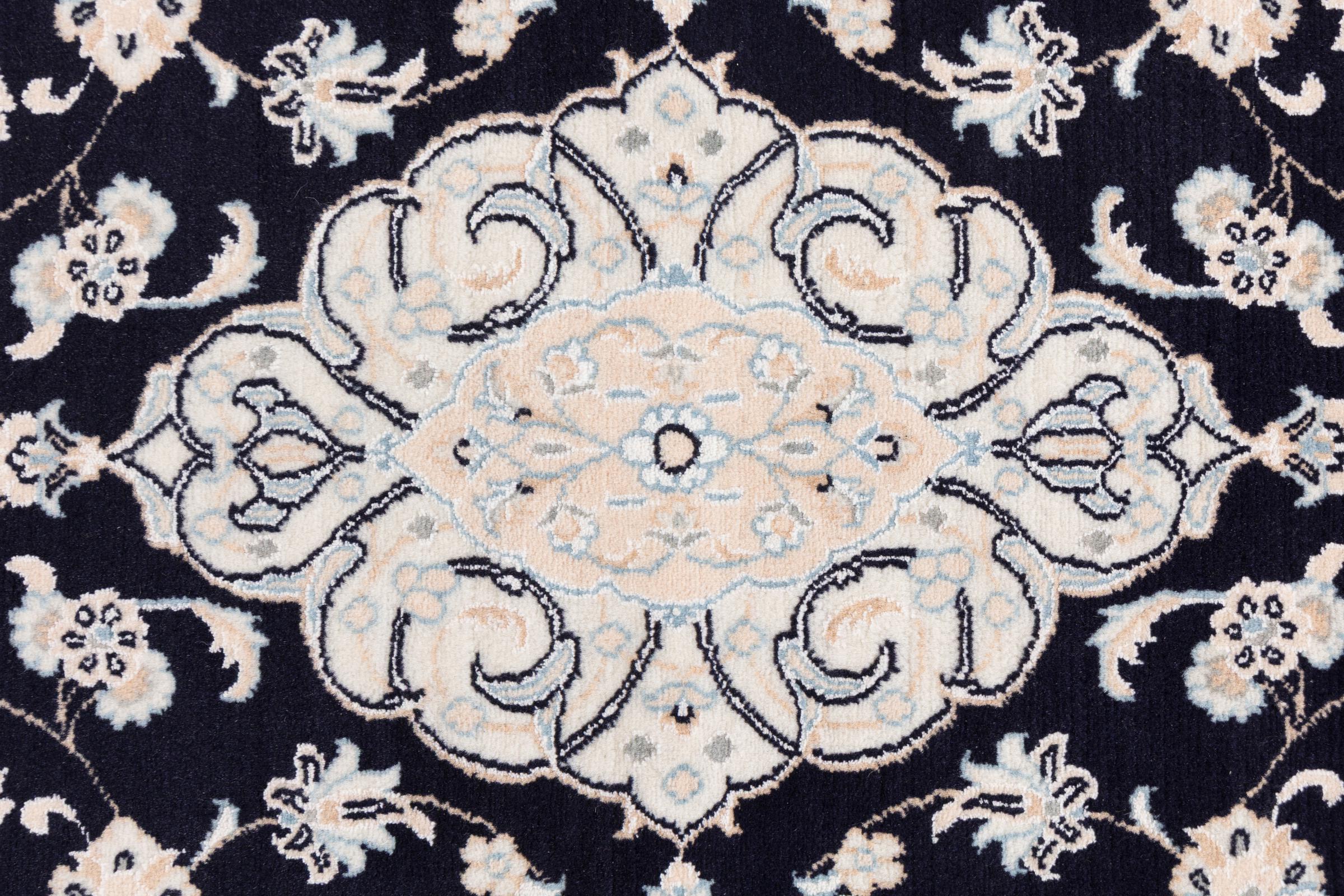 This Nain rug is classified as 9La. The excellent quality, the beautiful oriental design with its curvilinear patterns will delight every buyer. This Persian rug was hand-knotted in the city of Nain, which lies on the western edge of the Dasht-e-Kavir desert, from high-quality wool and natural silk. 9La Nain rugs are significantly finer than a 12La and already show beautiful details.